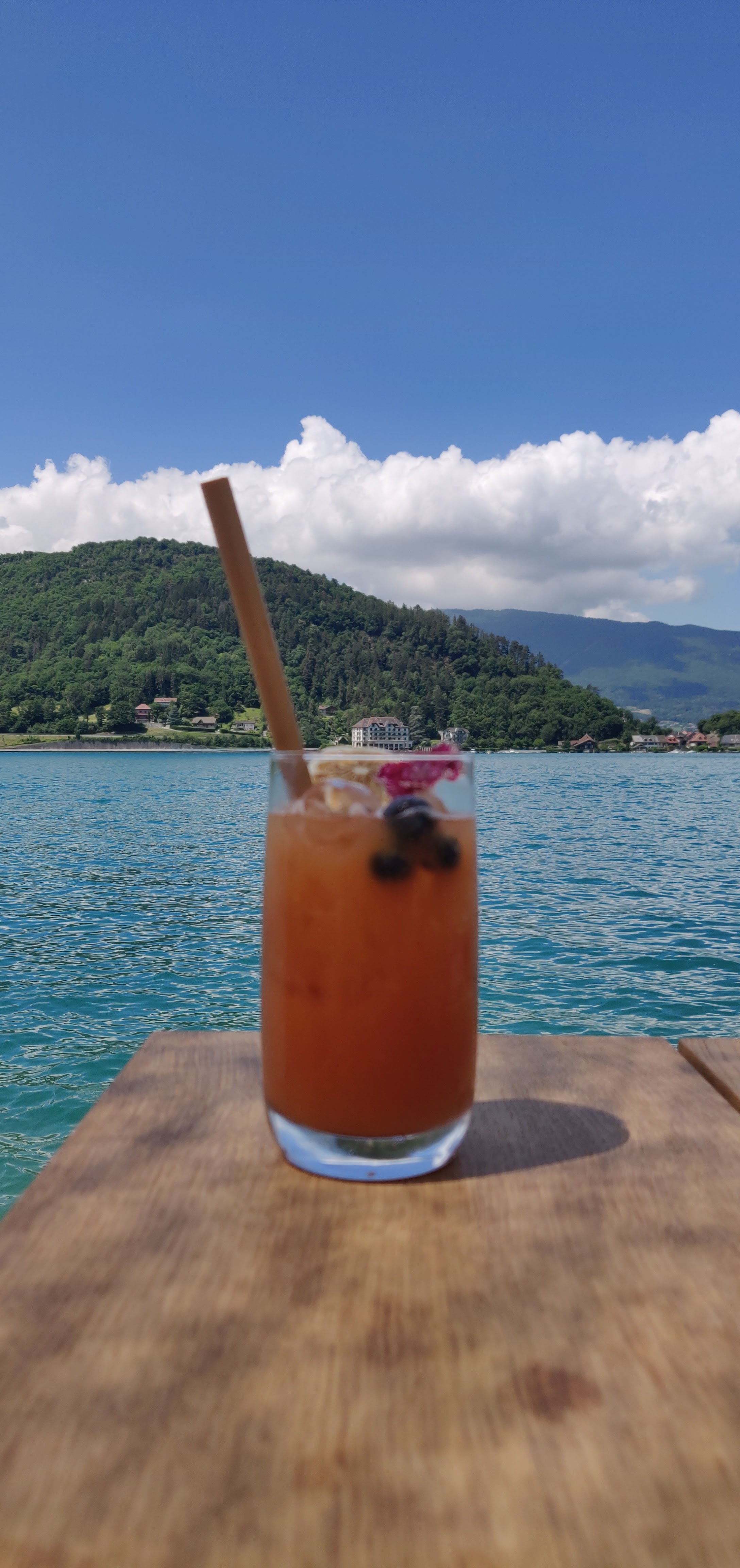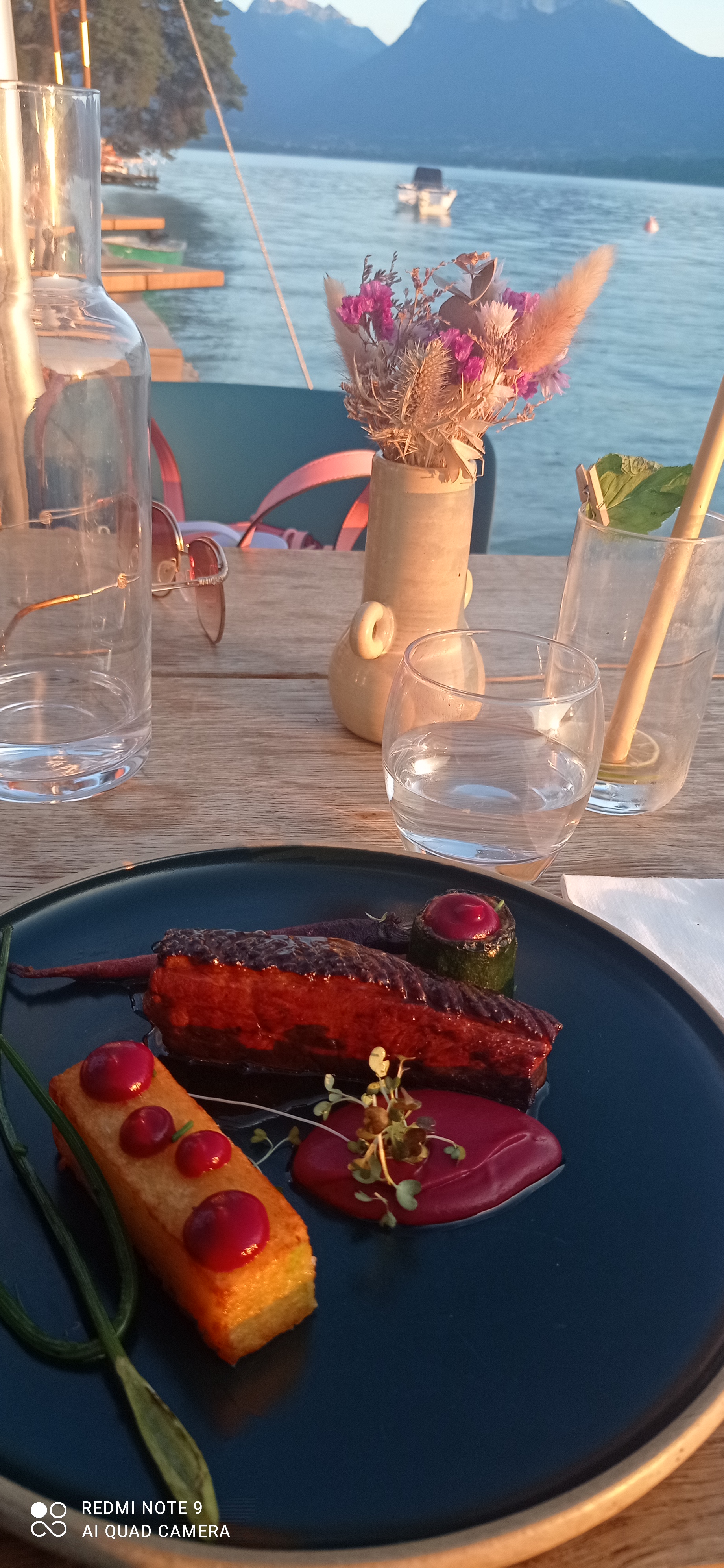 J’ai pris connaissance de ce lieu par un couple de blogueur d’Annecy et je l’es en remercie car ce lieu est magnifique ! Pour un dîner au coucher de soleil c’est idéal ! Les serveurs sont tellement gentils et attentionné ça fait plaisir d’avoir un service comme celui là. Ils nous on même fait prendre l’apéritif sur les banquettes cosy au bord de l’eau avant de passer à table. Les boissons sont très bonnes, si j’avais une petite remarque c’est la sauce de l’entrée, ça baignait un peu dedans à mon goût. Mais alors le dessert … mama une merveille! Dessert réalisé sur place et m’a fait découvrir un mélange légume/fruit incroyable ! Je recommande sans hésiter !!!