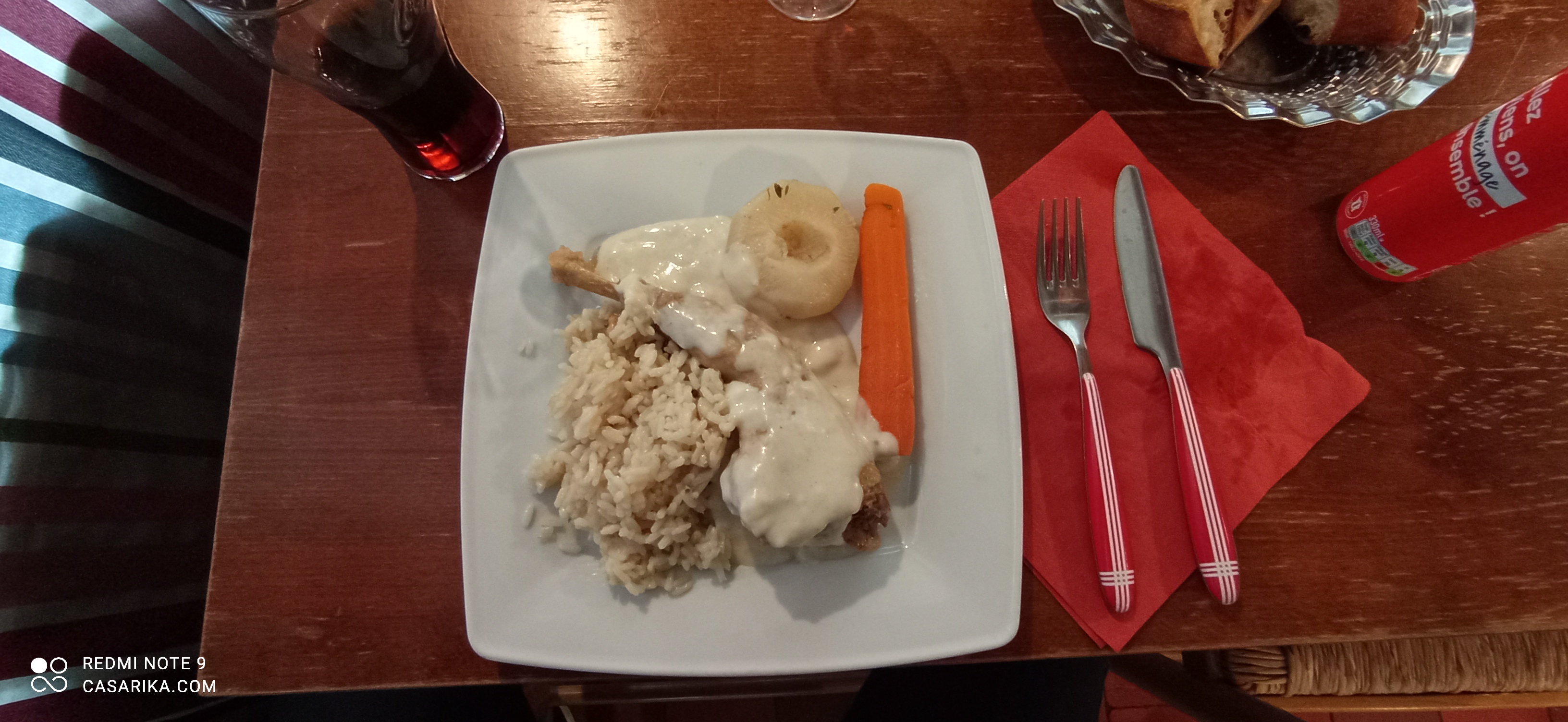 Repas du samedi 25 août plus que moyen. Aucune présentation avec en entrée un bol de salade de riz dans lequel se mêlaient un peu de carottes râpées, cubes de betterave rouge et concombre, et saute de canard (qui n était pas du canard) avec 3 mini cubes de viande de 1cm, riz et pommes de terre nageant dans une sauce peu assaisonnée, dessert gâteau chocolat que je doute fait maison avec une salade de fruits en compotee....le tout pour 15 euros café offert. Comme nous avons fait remarquer notre déception, le vin nous a été offert. Nous n y retournerons certainement pas. Dommage, J ai oublié de prendre des photos. Le patron reste malgré tout sympathique même s il ne semble pas connaitre la composition de ses assiettes.