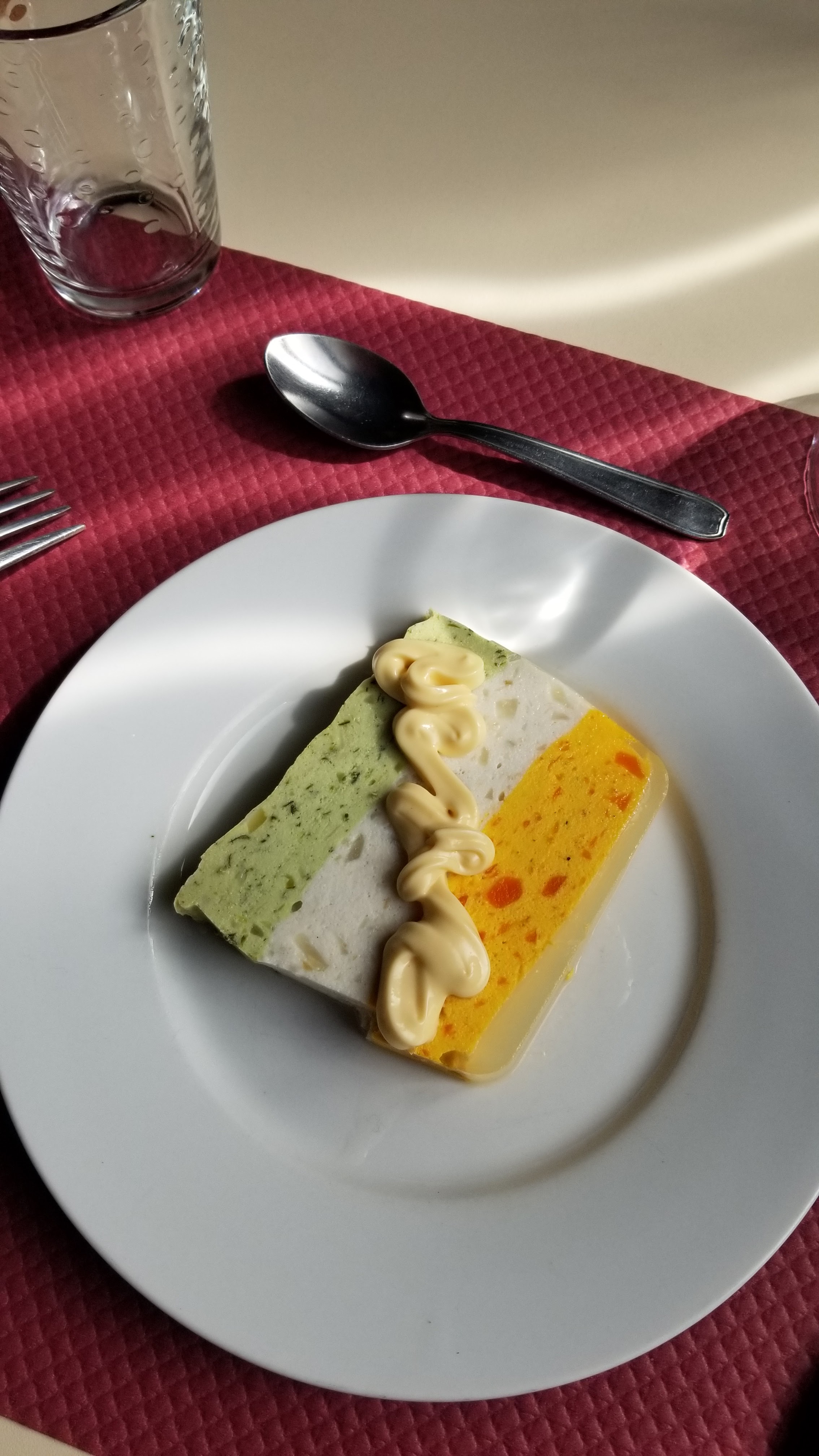 Repas ordinaire et rapport qualité prix un peu cher !! Menu : terrine de campagne, cuisse de poulet rôti avec des frites, en dessert petite coupe de fruits au sirop (quelques morceaux de péches et grains de raisin) avec pichet de rosé et café.