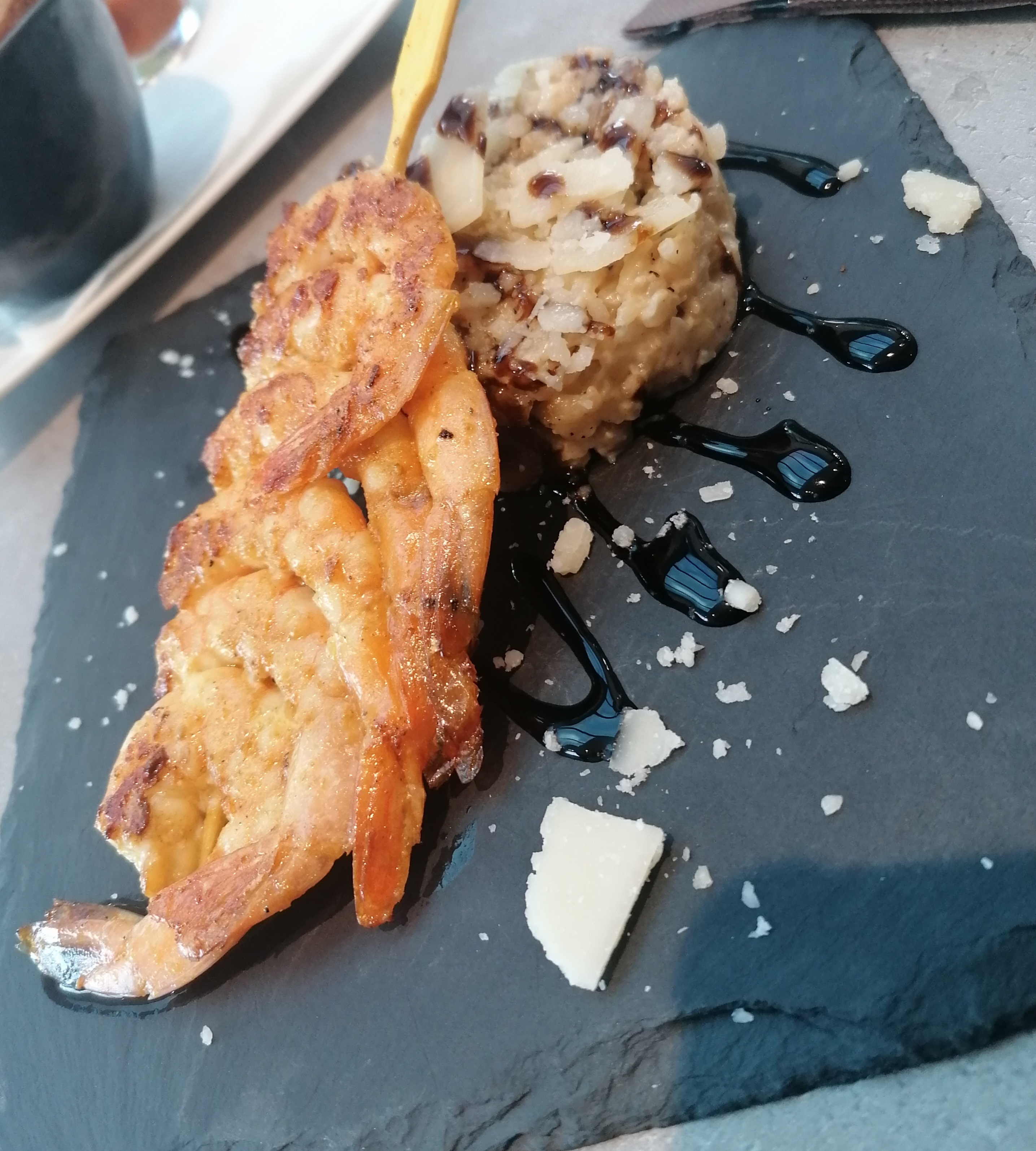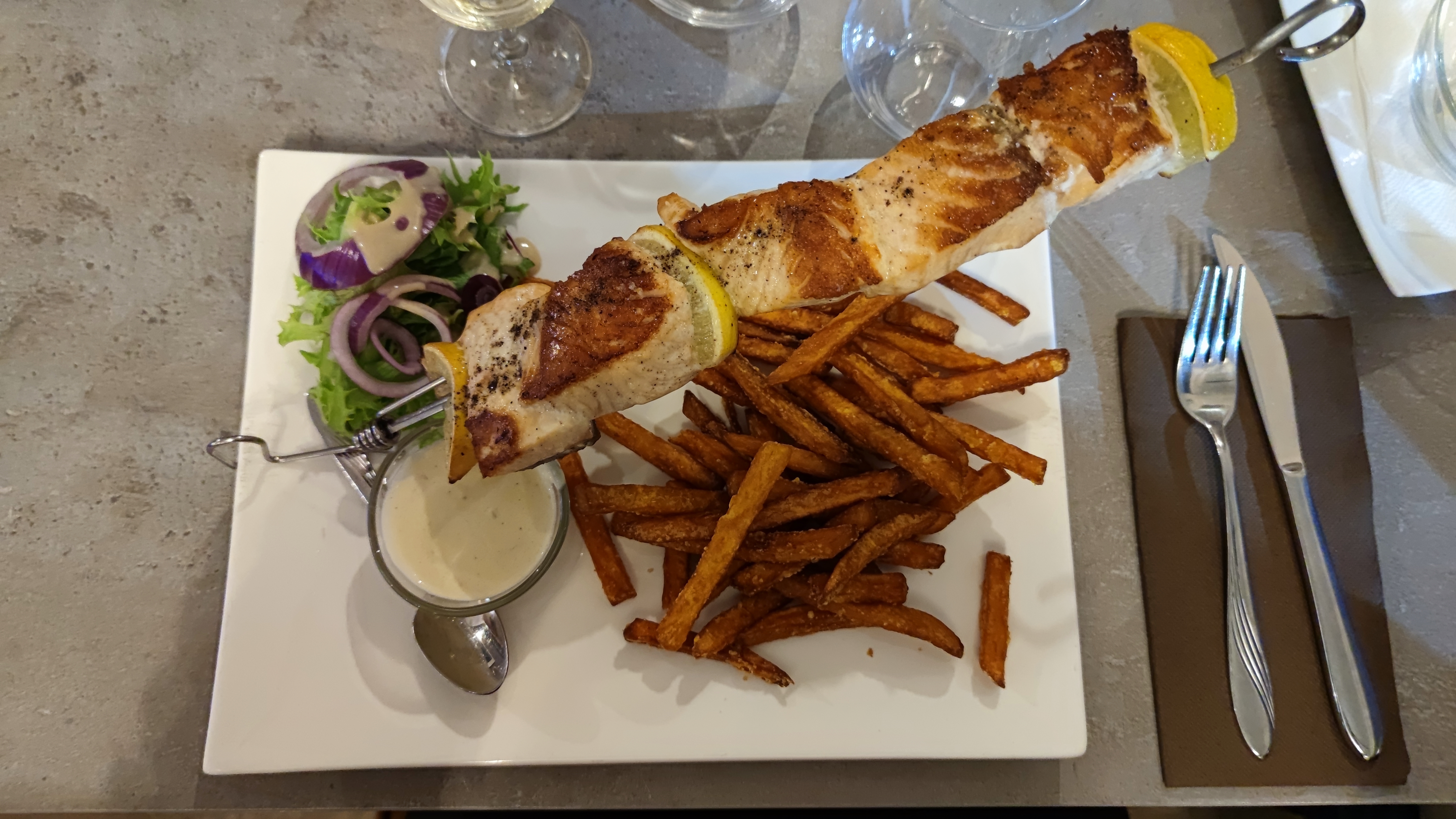 Restaurant refait recement. Il offre une belle carte et un menu du jour. Ma sœur m'a conseillé les brochettes. Vous avez le choix de la brochette aux Saint-Jacques, au boeuf ou à la volaille. C'est cette dernière que j'ai choisi. Avec un riz safrané. Super assiette, bien présentée et qui n'a rien à envier à d'autres places. Il y a de quoi manger ! Ma sœur a opté pour la version St jacques. Je vous mets la photo. Bon. Vous voulez savoir si ça vaut le détour ? Oui, assurément. Allez-y et retournez-y. C'est une bonne adresse. PS, tentez la brochette sans entrée. C'est déjà bien assez. Et puis sinon, laissez-vous tenter pour un dessert !