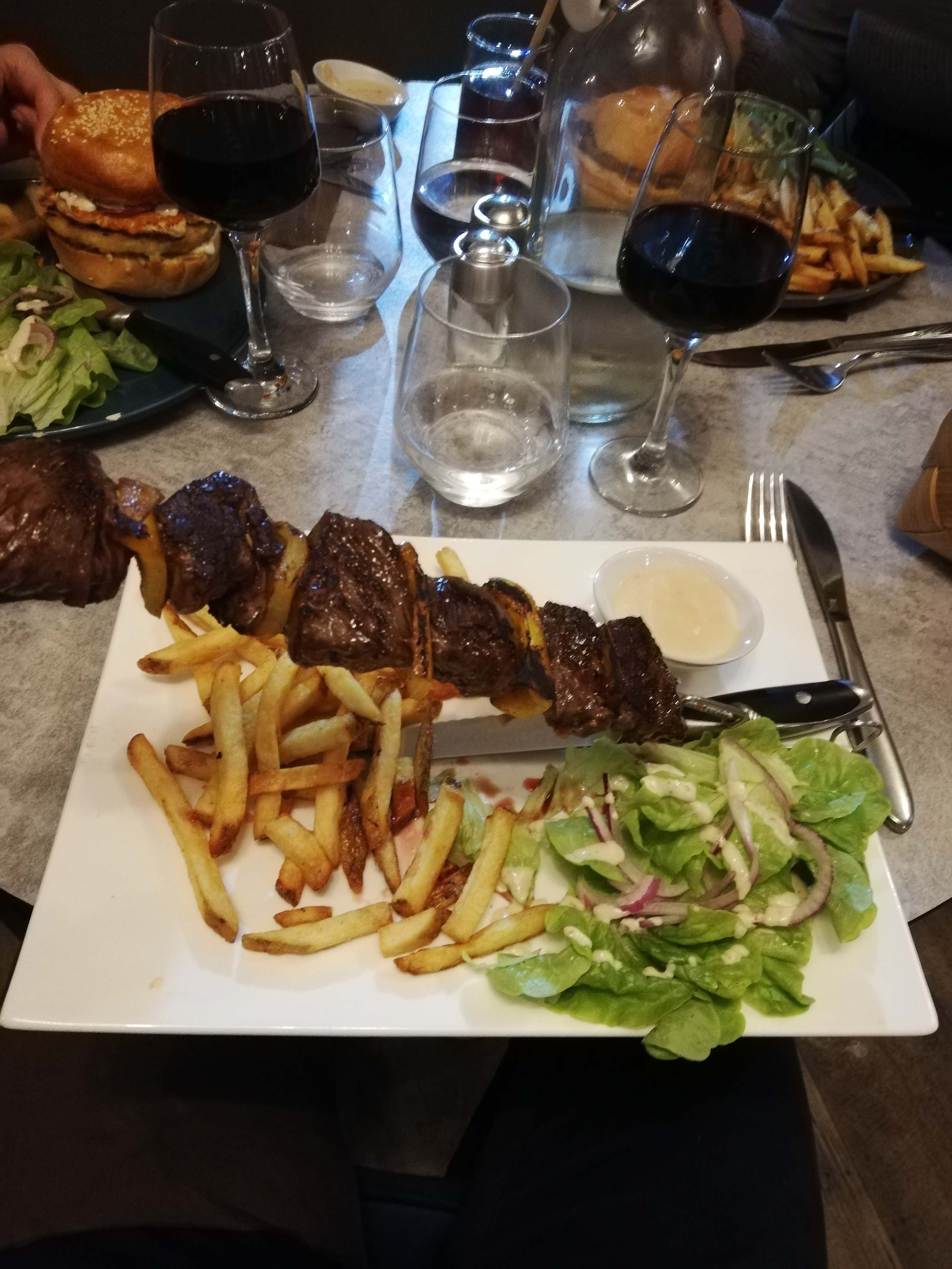 Restaurant très accueillant avec service impeccable.Beau cadre. En entrée j’ai pris l’assiette de foie gras maison, une belle surprise. Moi qui vient du Périgord j’ai très appréciée ( peut être un ajout de fleur de sel au bord de l’assiette pour remonter le goût du foie gras 😉). Les brochettes et les burgers sont excellents.