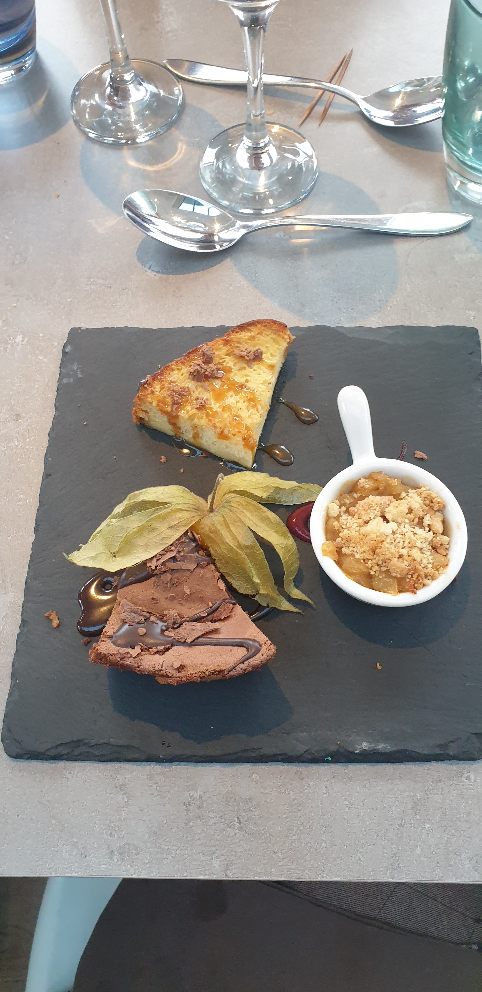 Ambiance chaleureuse, souriante et de bons conseils. Oeuf cocotte tout simplement délicieux, la brochette de St Jacques avec frites de patate douce et ratatouille tout aussi délicieuse et pour finir, un trio gourmand... A fréquenter et à conseiller. On ne s'attend pas à trouver un si bon établissement dans une petite commune. Très belle surprise