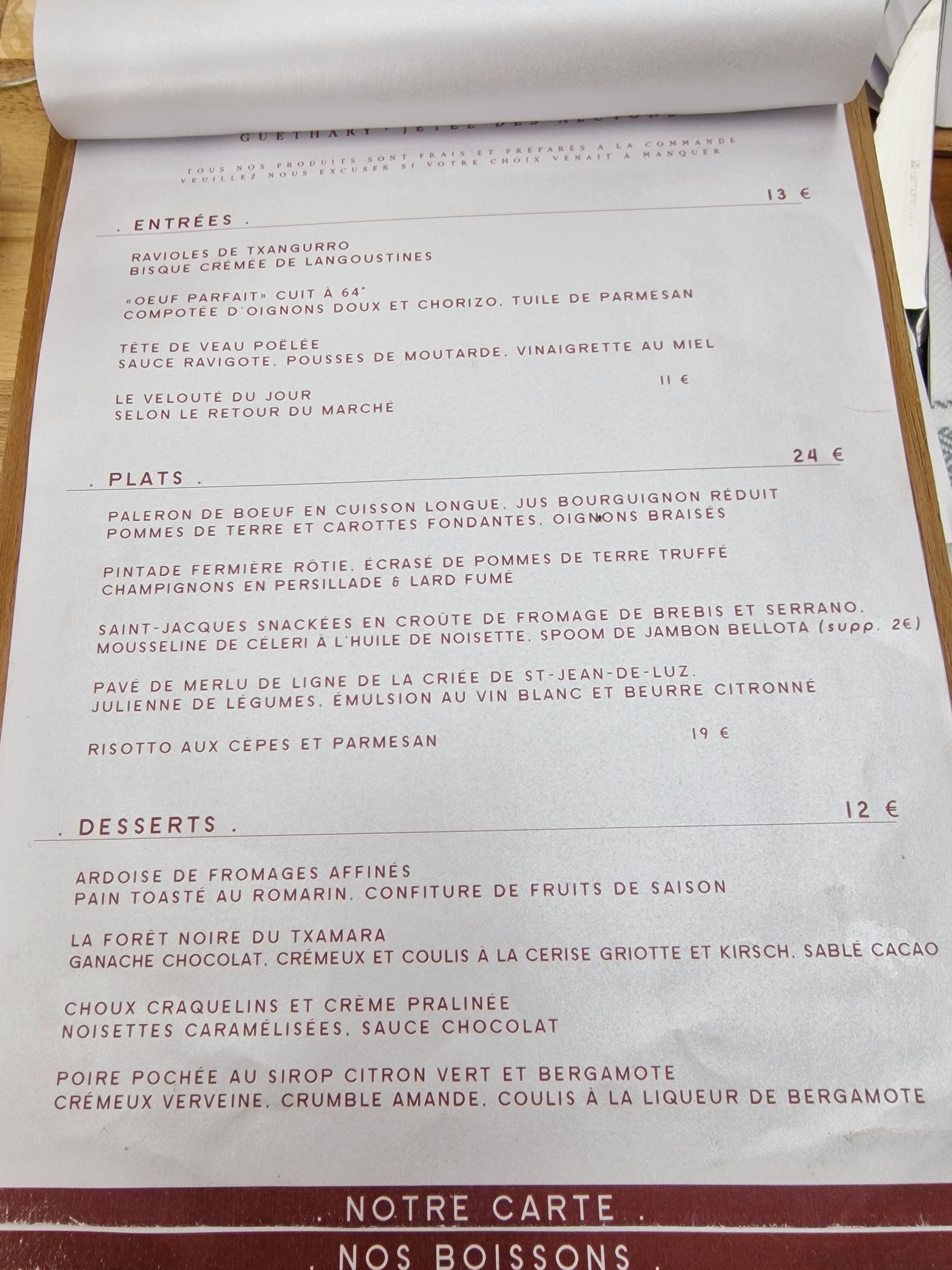 On y va pour la vue océan au détour d'une balade dans Guéthary, on y revient pour l'excellente cuisine. Carte courte qui suit les saisons. Service très agréable. Chaque plat vous est présenté. Des prix justes parfaits.