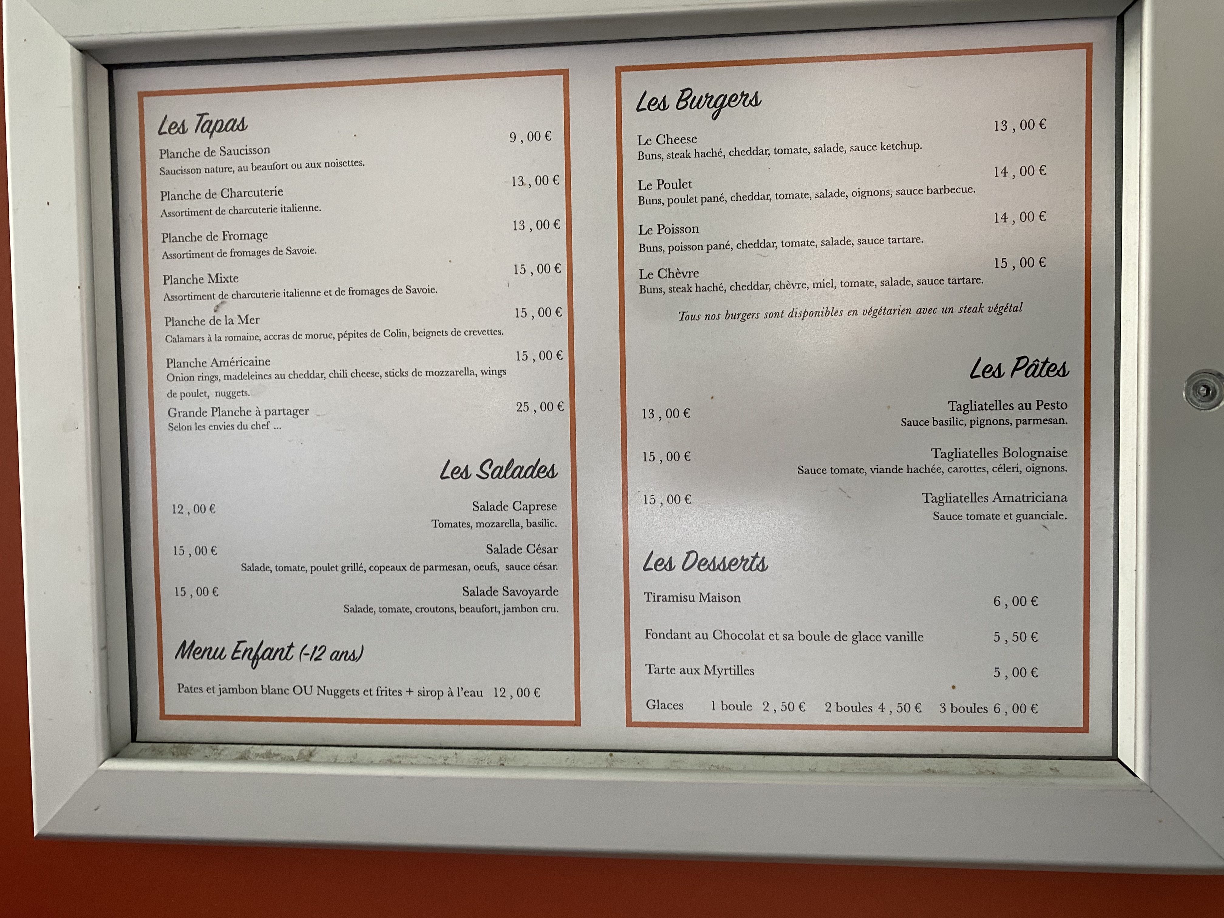 Des plats de fast food version maison : un délice ! Le burger du moment au pesto était à tomber. Le reste de la famille s'est régalé de pasta et autres burgers. Les tarifs sont très corrects pour un lieu touristique. L'accueil n'est pas en reste. Bravo à l'équipe !