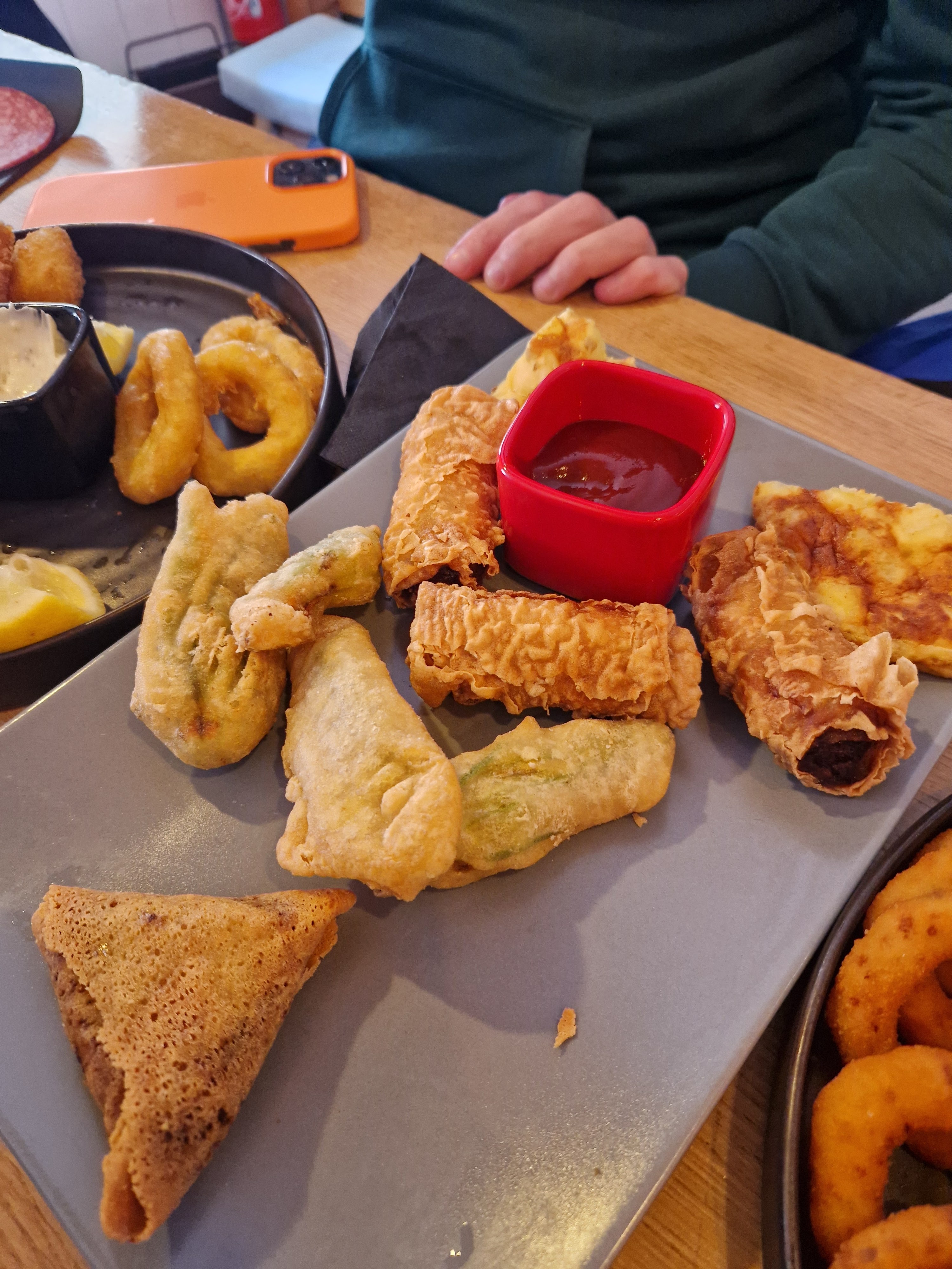 Expérience très décevante dans ce snack-restaurant. Une carte proposant des tapas et des burgers. On avait pas envie de burger donc on est parti sur des tapas (je met tapas entre parenthèse car ça n'a rien à voir avec des tapas). On a commandé 4 planches différentes et on nous a servie de la friture à 90% , strictement aucun truc n'était fait maison, en + de ça on nous sert en sauce .. du ketchup ? Avec des nems, des samousas, des oignons rings.. peut importe le style vous aurez du ketchup.. aberration. La plus décevante était certainement la planche mixte locale avec une Charcuterie soit disante Italienne épaisse comme une buche de bois.. sorti directement d'une boîte en plastique, une cata. La serveuse pas méchante mais après nos remarques n'avait visiblement pas envie de se remettre en question. Les prix ne sont cependant pas excessif, mais on y mange malheureusement très mal. Pour terminer, je pense que je n'aurais jamais dû aller aux toilettes, qui d'après la couche de poussière et la crasse, n'a pas était nettoyé depuis un bon bout de temps.