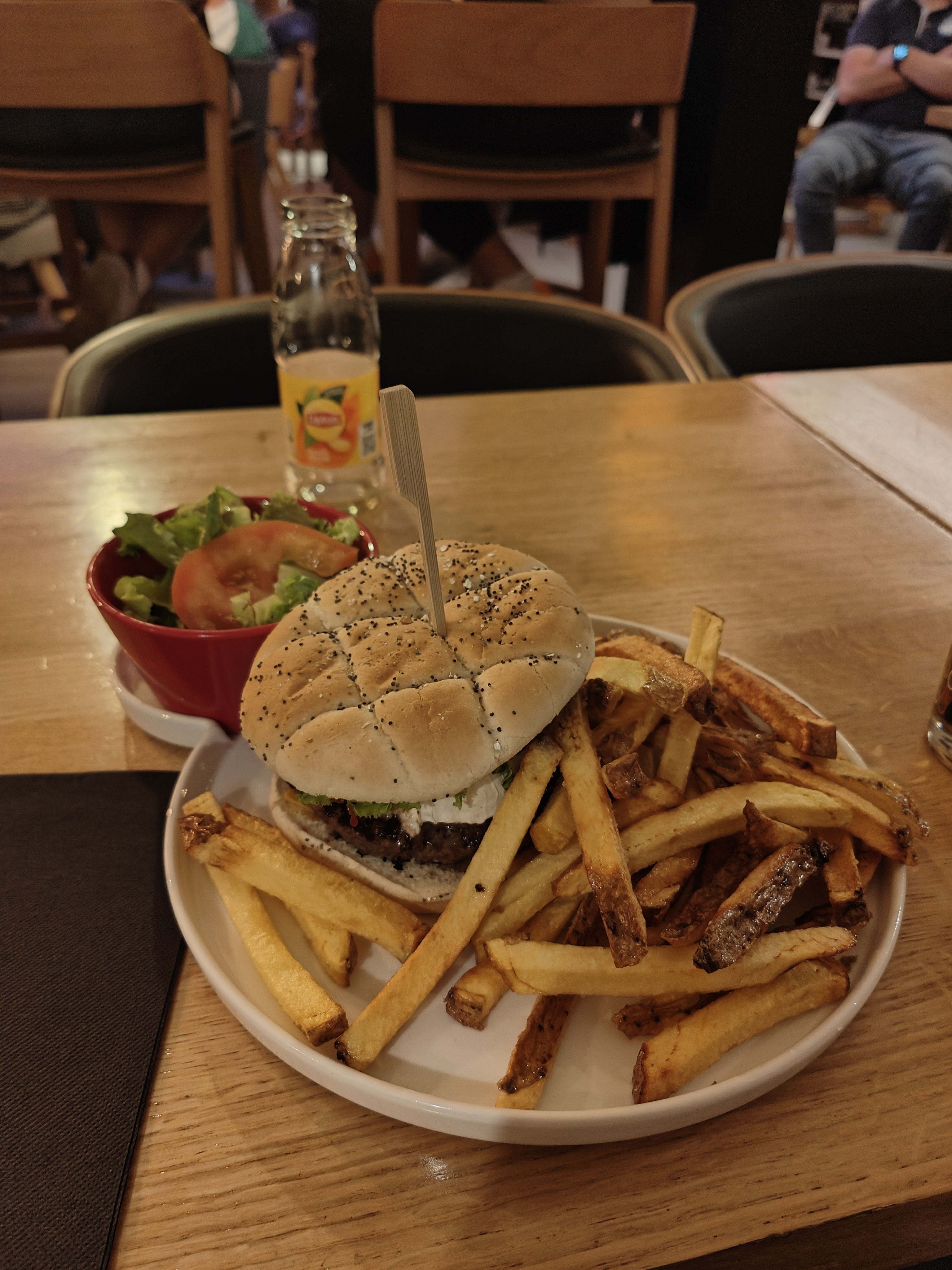 Bonne nourriture pour le prix. Nous avons mangé un menu burger avec de délicieuses frites et une modeste salade. Leurs bières pression étaient bonnes et le service était bon. Si vous aimez le fromage de chèvre, je vous recommande le burger au fromage de chèvre, qui est également servi avec un steak juteux. Les cartes de menu étaient en français, mais le personnel a proposé de les traduire en anglais. Dans l’ensemble, c’est un bon café.
