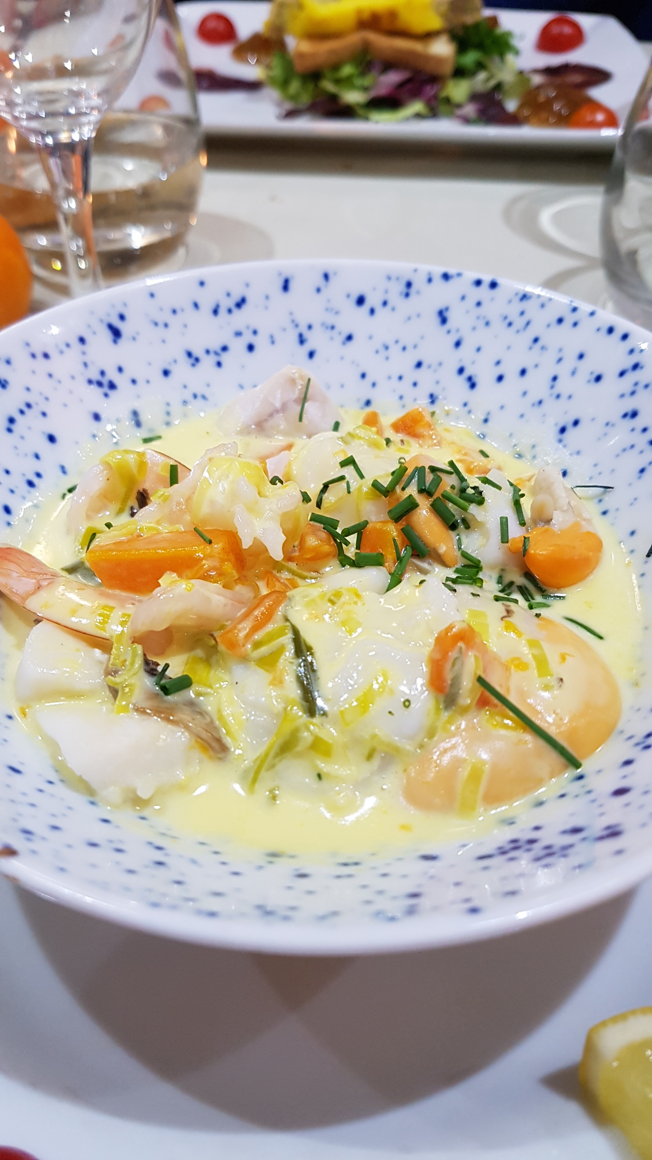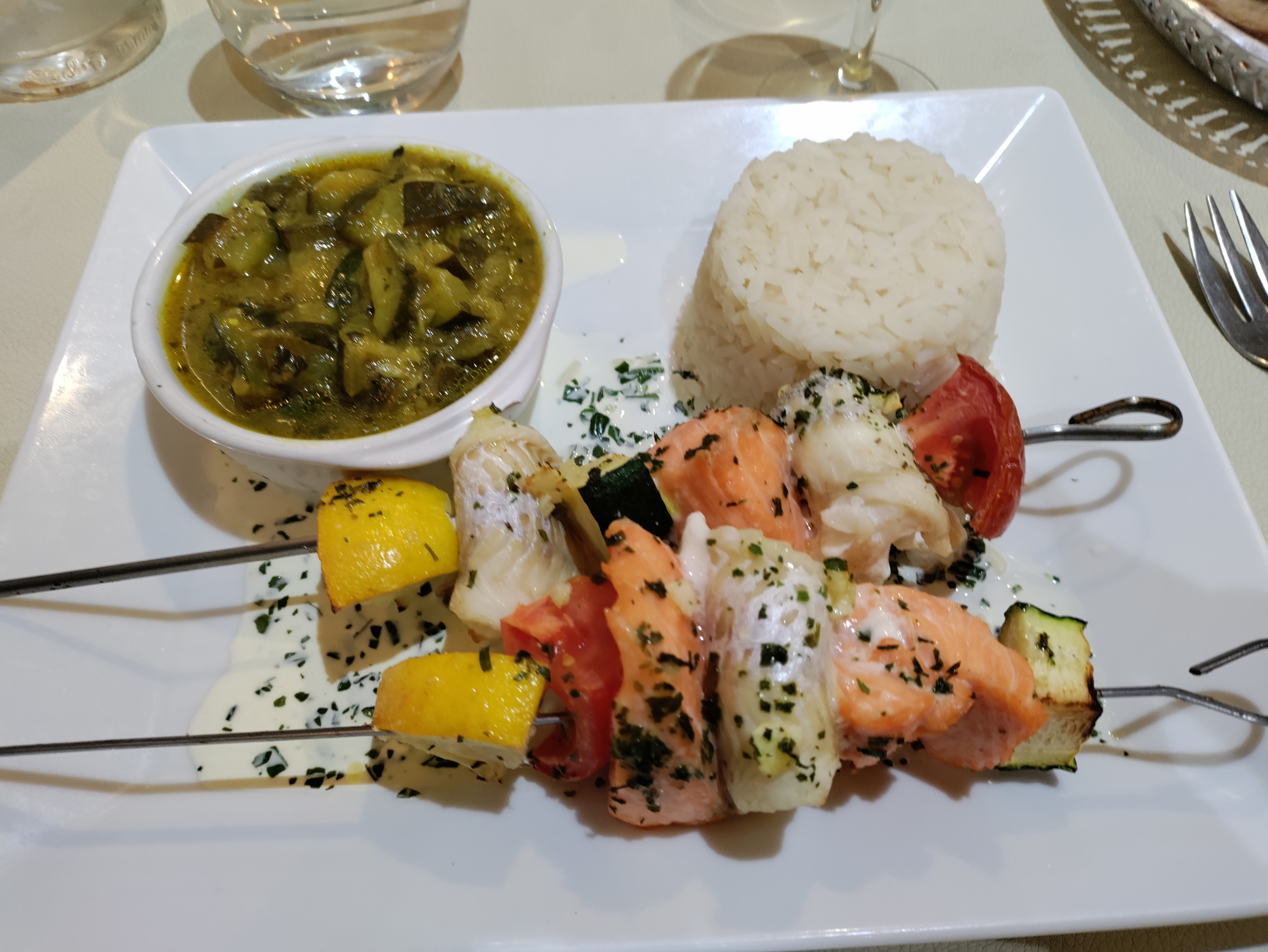 Ensemble moyen, n’ayant pas fini l’apéro, on nous amène l’entrée ! Ensuite 30 mn d’attente pour le plat !