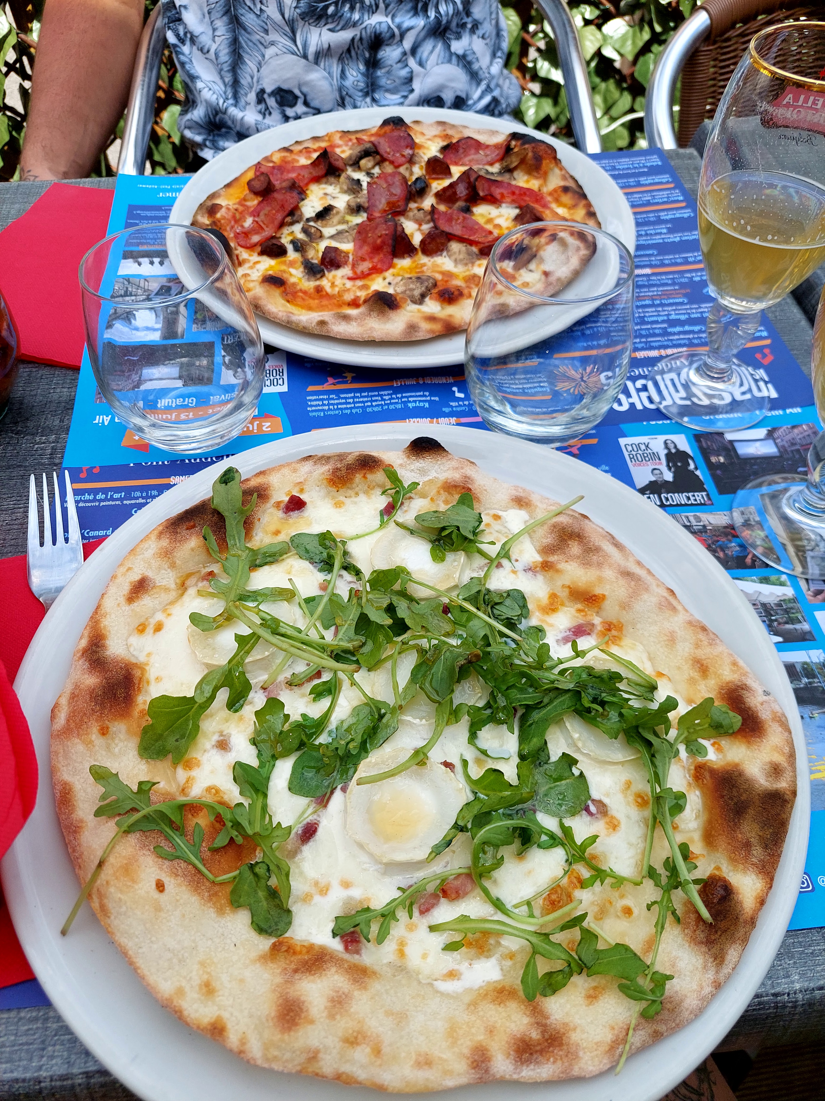 Andouillette récupérée directement de la table voisine(erreur de service)après 5mn et frites arrivées 10mn plus tard après réclamation. Pizza cramée le tour immangeable!!