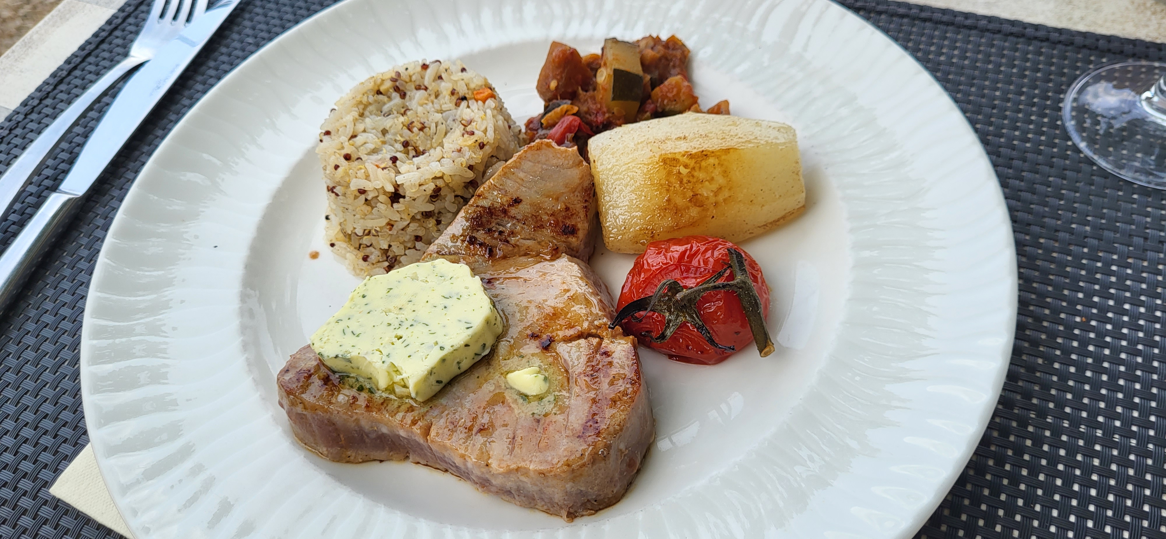 Diner en terrasse avec beaucoup d'espace entre les tables, une cuisine d'une excellente qualité dans un cadre magnifique