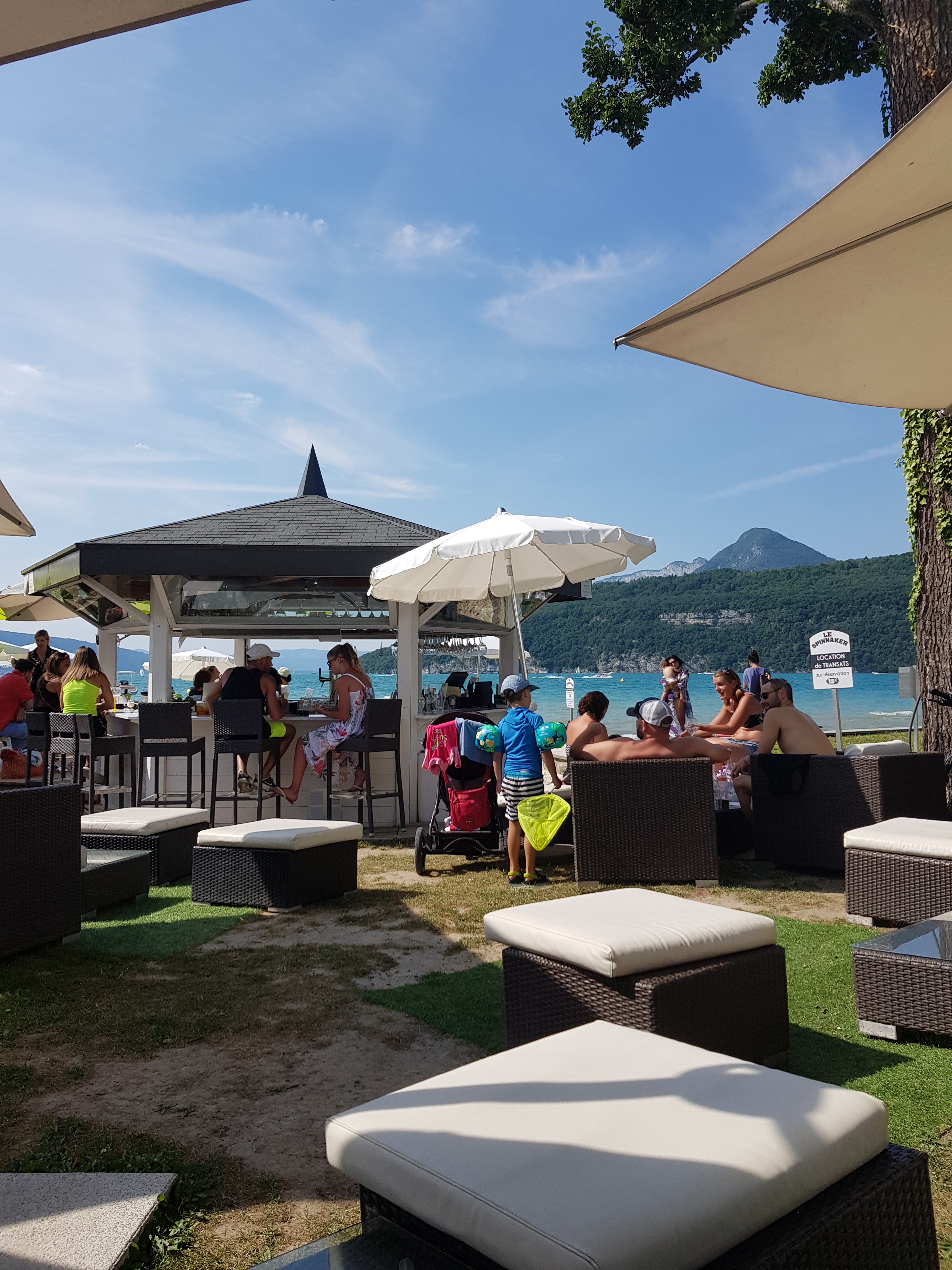 Une des seules plages avec transat sur réservation du lac d'Annecy. On peut également y déjeuner et/ou prendre un verre. Les petits bémols qui ne confirment par la cinquième étoile : - il faudrait remettre du sable à certains endroits au niveau des transats ; - nous avions appelé pour réserver 4 transats uniquement dans l'après-midi, mais on nous a dis qu'ils étaient réserver aux clients du restaurant uniquement. Nous avons donc déjeuné sur place (aucun problème c'était très bon). MAIS la personne au téléphone a oublié de nous préciser qu'ils étaient également payant. On a donc eu cette charmante surprise en partant. Donc pour information : prévoir 15€ par transat !