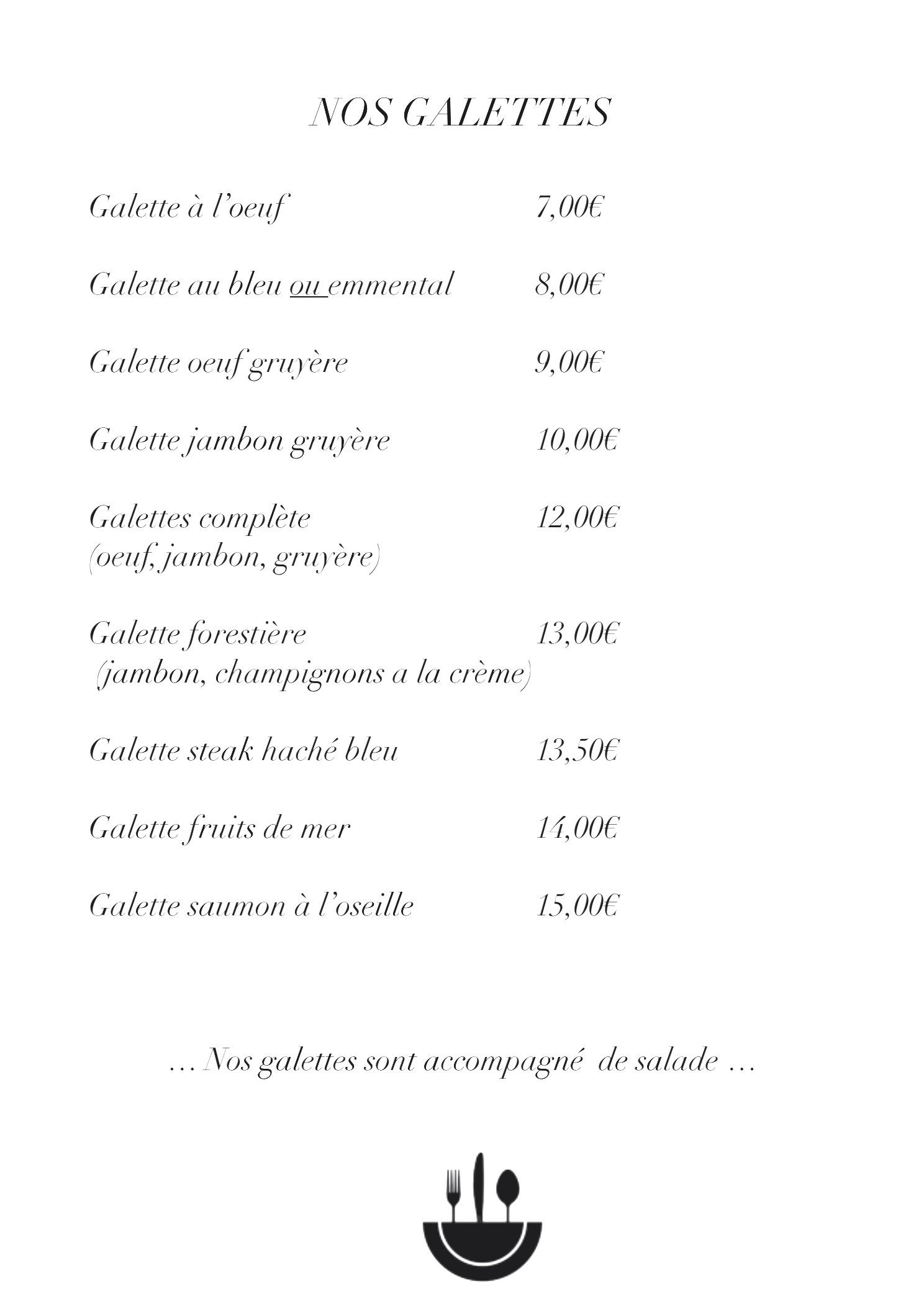 Bonjour monsieur D'abord la serveuse à bien expliquer pour vous que la galette au saumon ça rentre pas au menu Sur la carte noté galette + desert 16€50 Mais ça rentre pas dans la tête galette saumon plus desert à 16€50 à mon avis vous connaissez pas le prix de saumon 19€90 HT c'est pas gratuit c'est vous connaissez un endroit qui propose des formules à 16€50 montre le moi avant de écrire une petite arnaque merci beaucoup mais ci ça le résultat de deuxième service