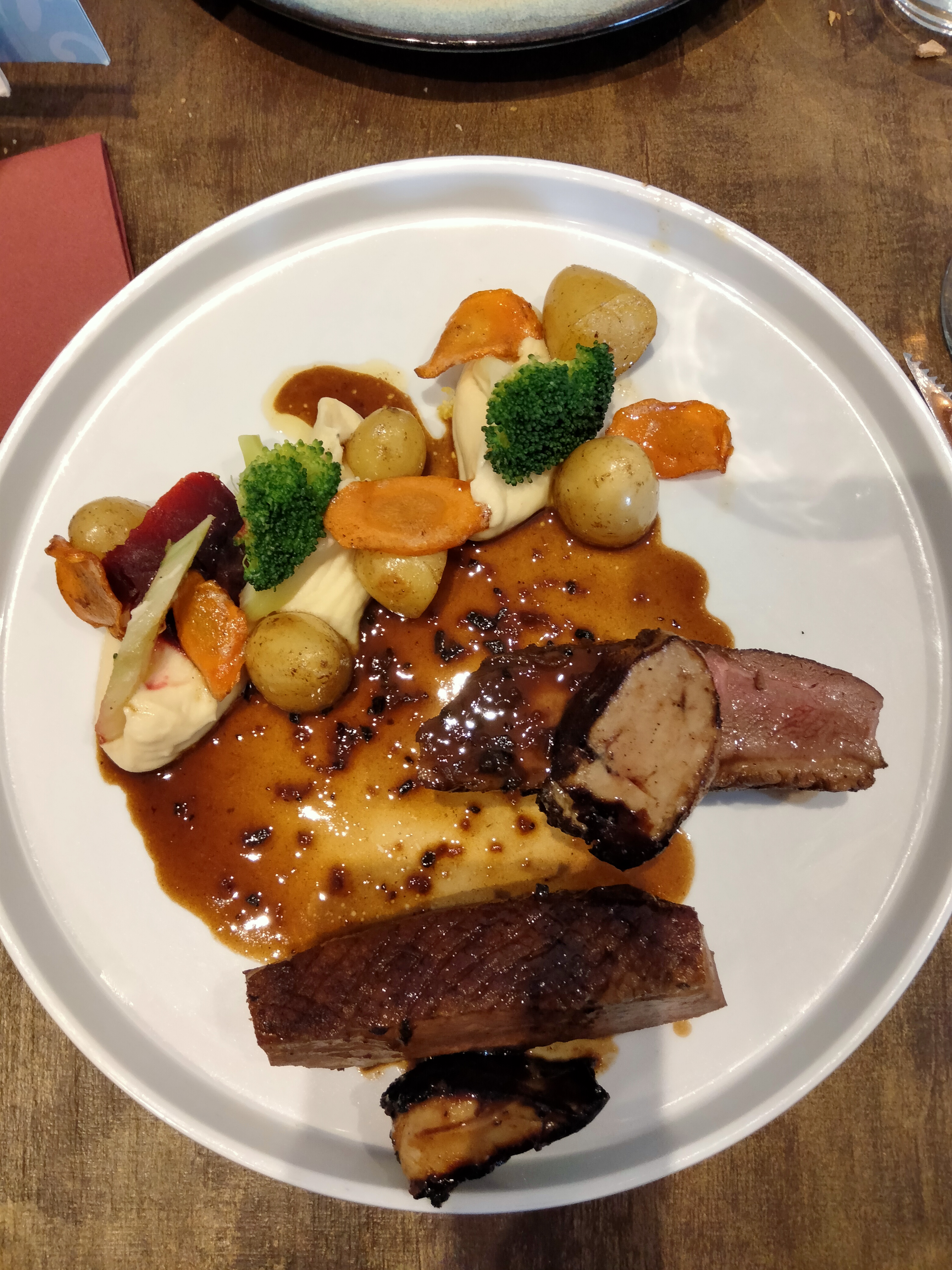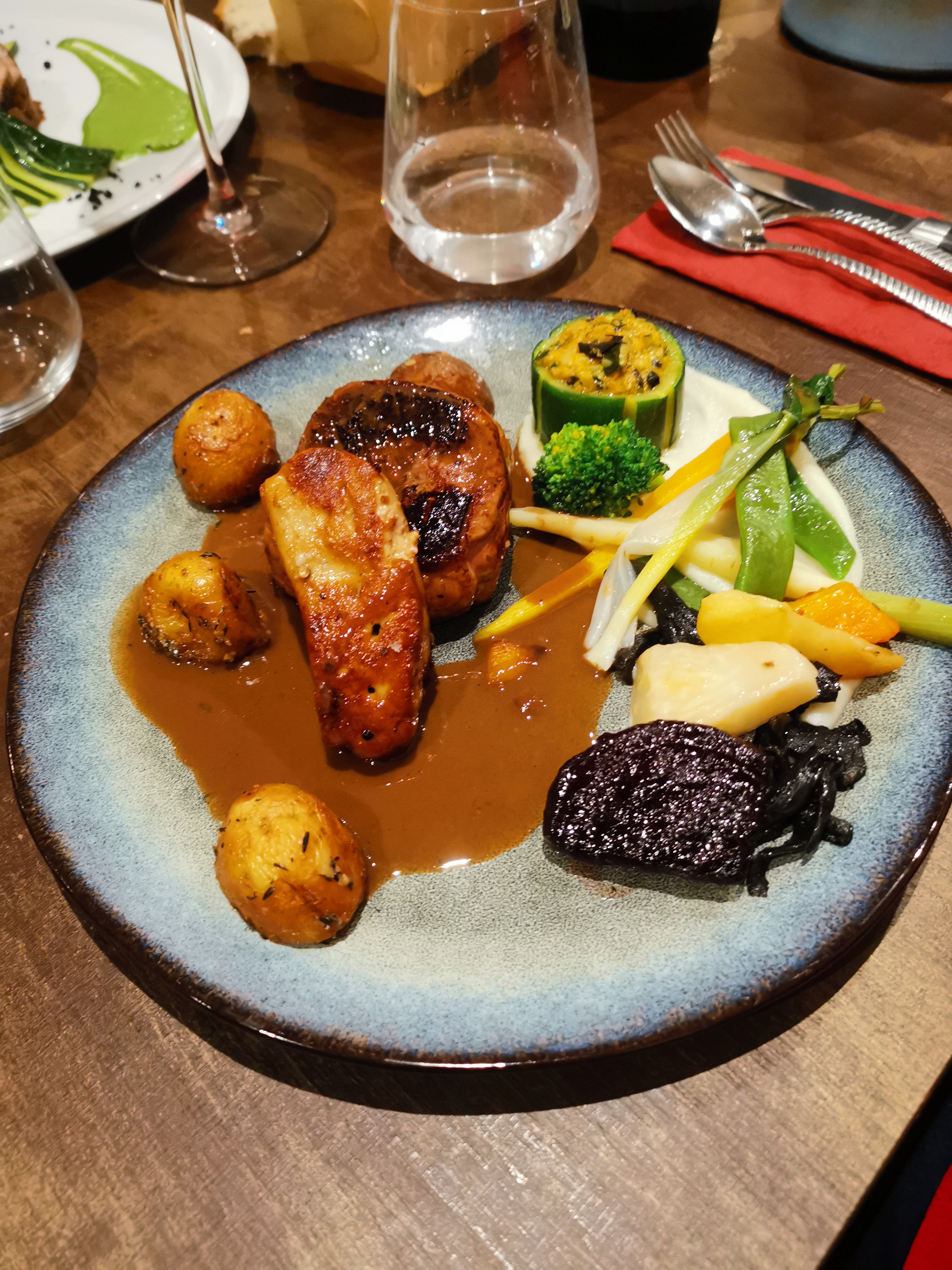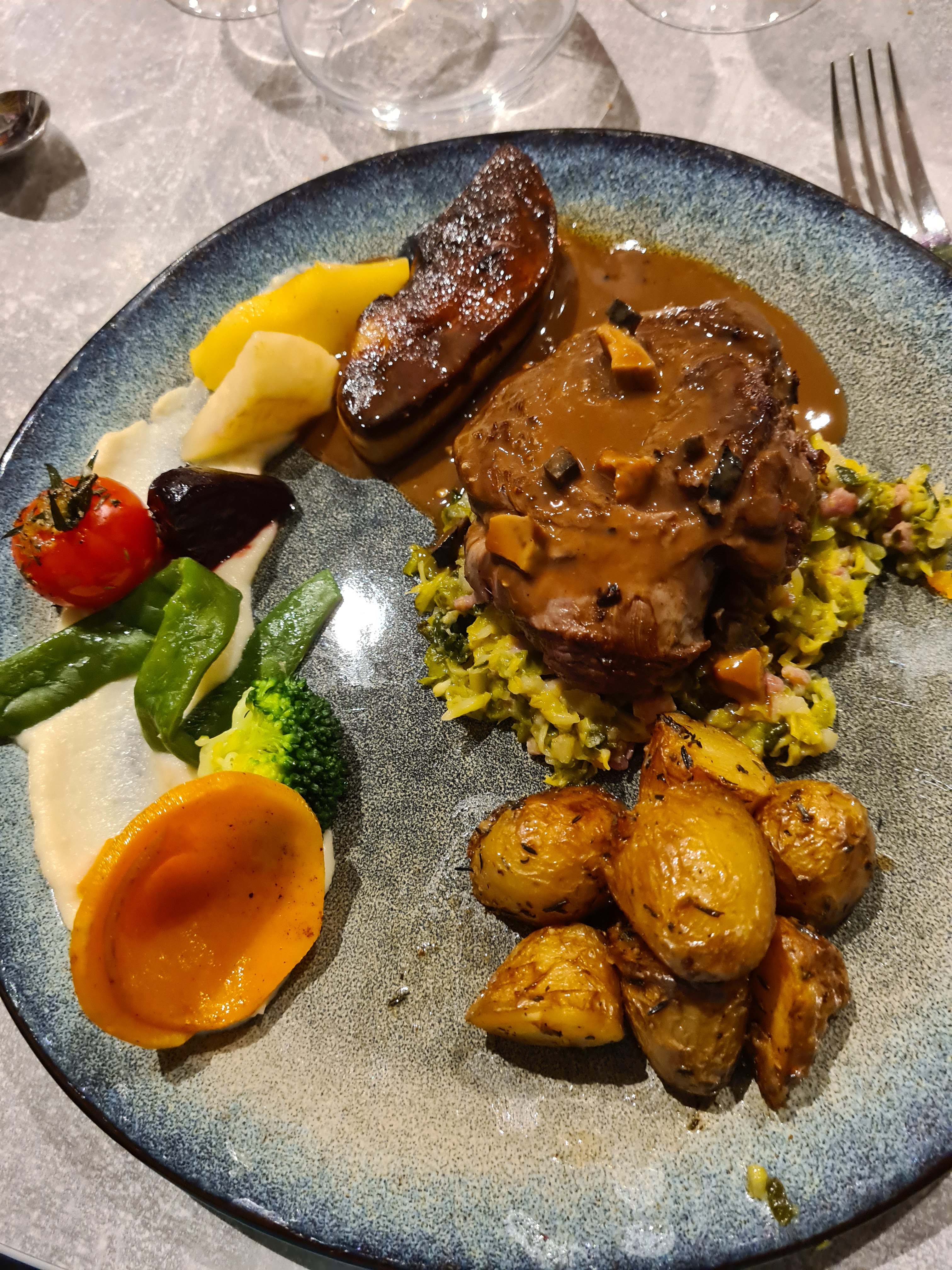 Le meilleur rôti de magret servi avec une ribambelle de petits légumes et purées, et un foie délicieux. On s'est régalé du début à la fin, un moelleux chocolat fondant pistache, une belle prouesse. Pour 2 personnes, 64 € vin compris, on a eu un vrai menu gastronomique, originale, sans oublier la verrine de mise en bouche tout en finesse. Bravo à l'équipe qui est en cuisine, c'est de la vraie bonne cuisine 👌👌👏