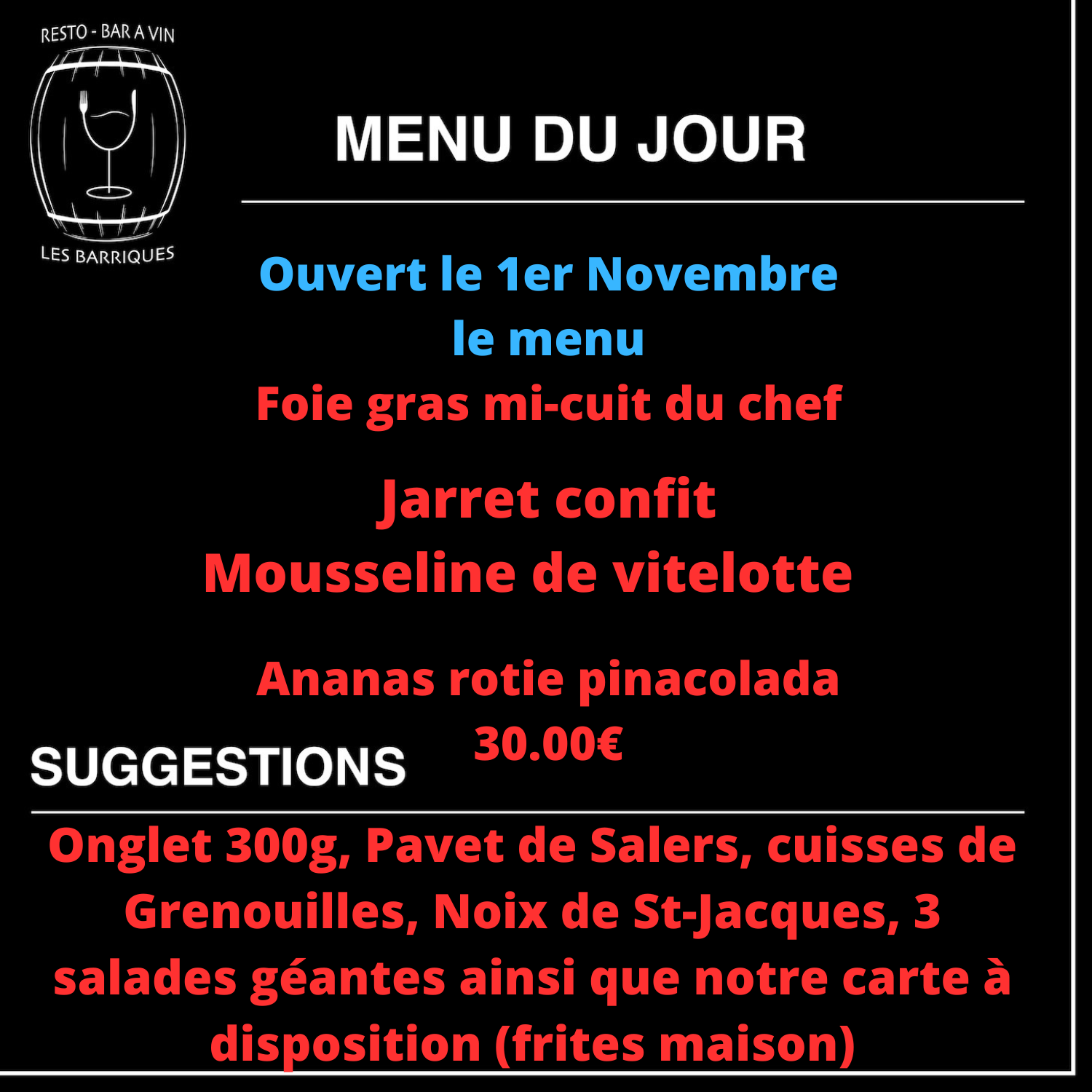 Samedi 9 novembre 2024. Première fois que je mange dans ce restaurant, nous étions 12 personnes, accueil, services, repas très bon, qualité prix rien à dire. Je reviendrai et je vous invite à aller passer un bon moment au Restaurant les Barriques.