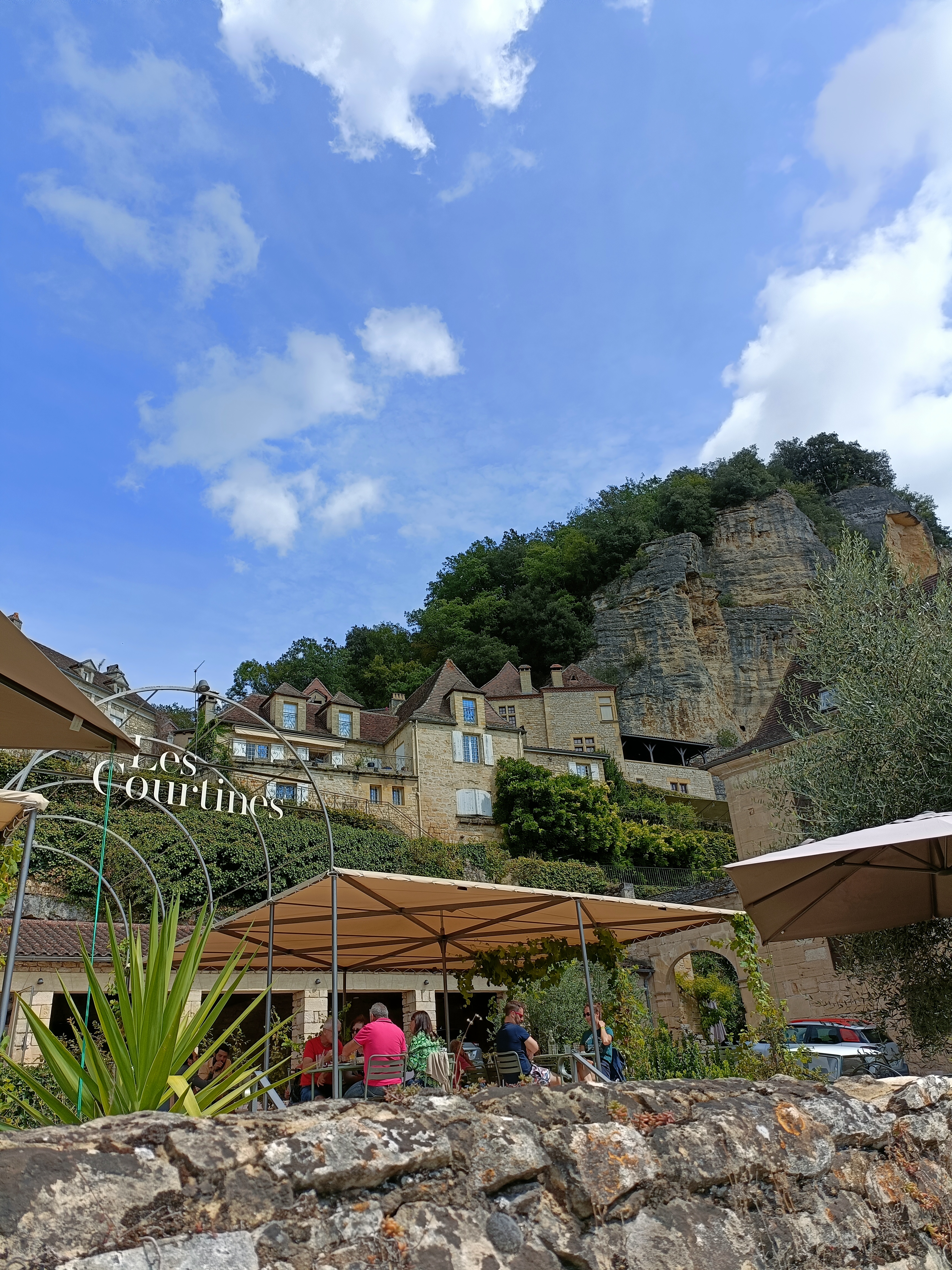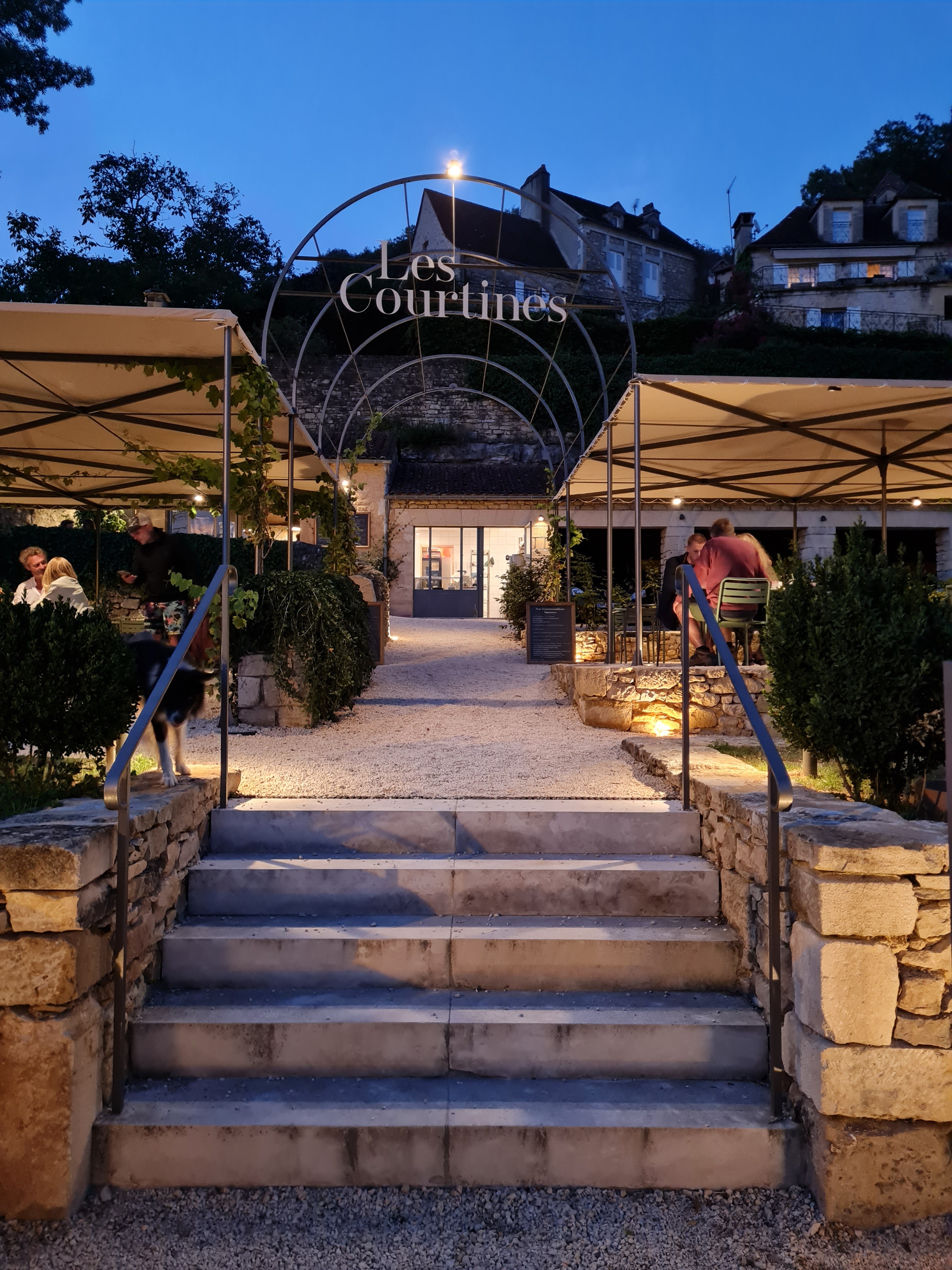 Très bonne soirée passée aux Courtines, bel endroit situé à l'extrémité ouest de La Roque Gageac, loin de la foule, une découverte car cette nouvelle adresse n'a que quelques mois d'existence. L'endroit est magique, très aéré, avec un très grand jardin et une immense pergola pour accueillir le visiteur. Pas de tralala pour ce qui est de la carte, d'excellents produits sont proposés sous format salades, tartines, un vrai régal, et ne parlons pas des glaces, une tuerie....... Les prix sont plus que raisonnables, et l'accueil ferait pâlir bon nombre d'autres adresses que je qualifierais d'attrape touristes . Vous l'avez compris, c'est un chouette endroit à recommander.