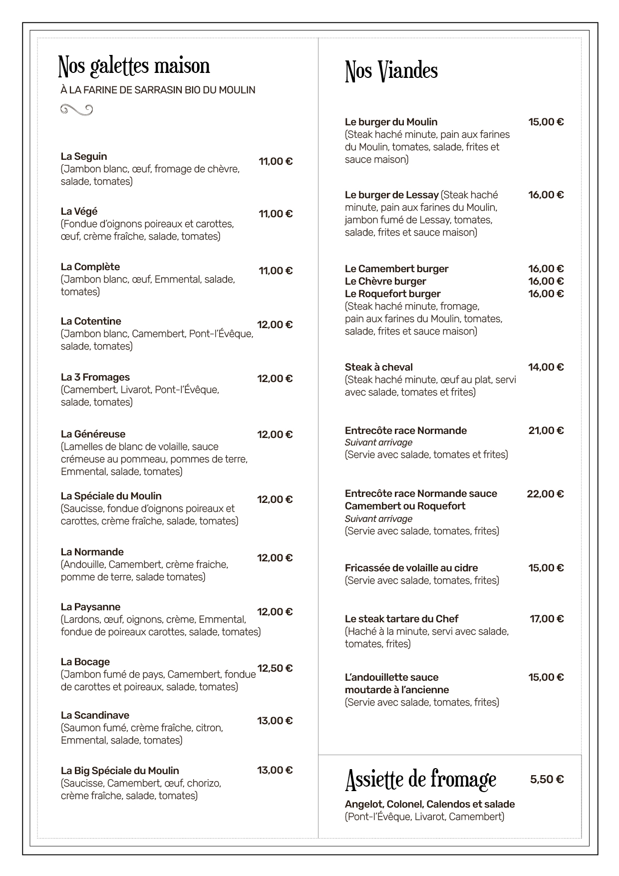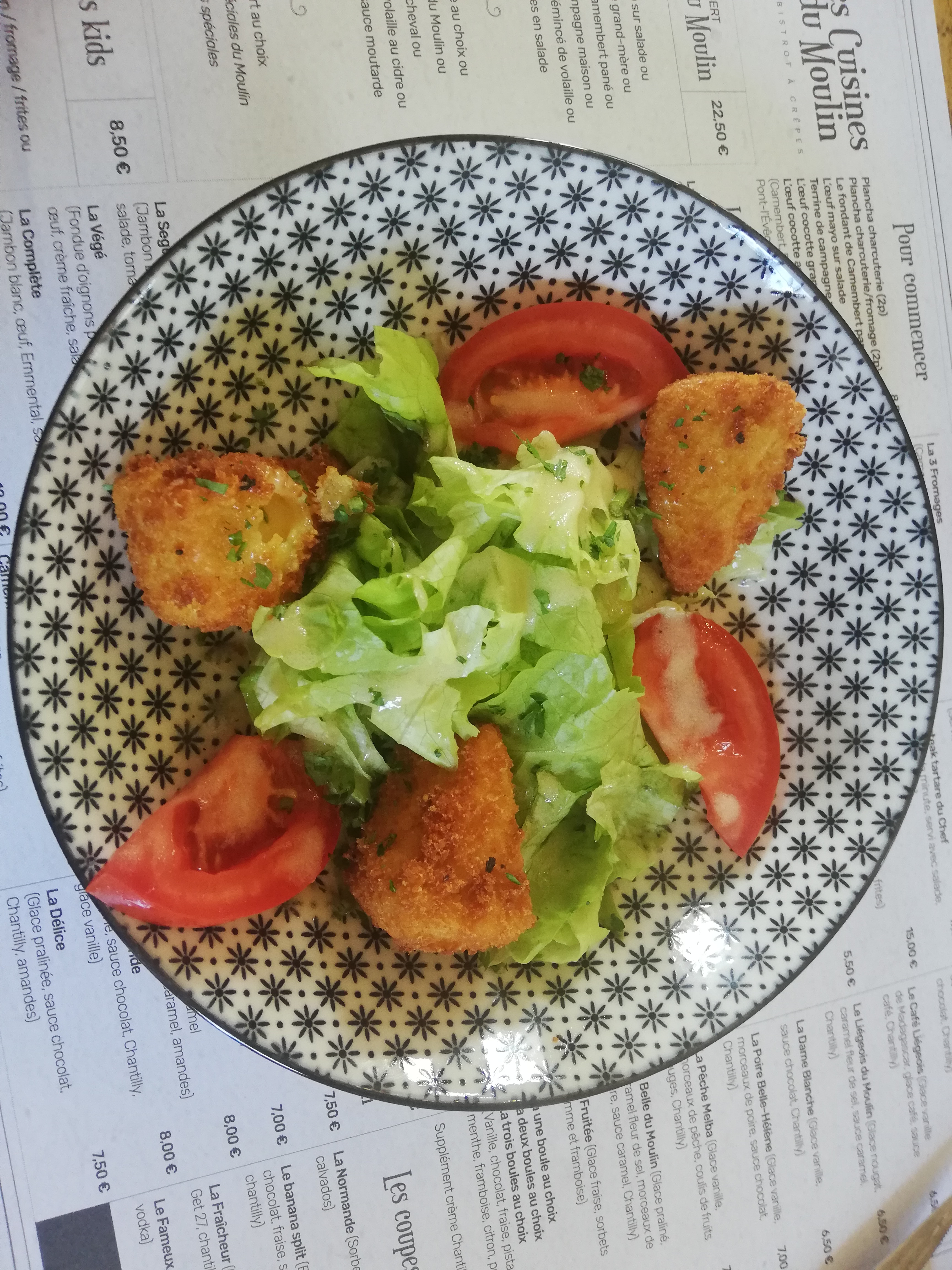 Belle expérience dans un joli cadre. Nous avons pris le menu à 22, 50 euros Œuf cocotte grand mère, fricassée de volailles au cidre et crêpe au citron , mon mari : le fondant de camembert pané, la galette big spéciale du moulin et un chocolat liégeois. Tout était très bon avec un petit goût de Normandie.