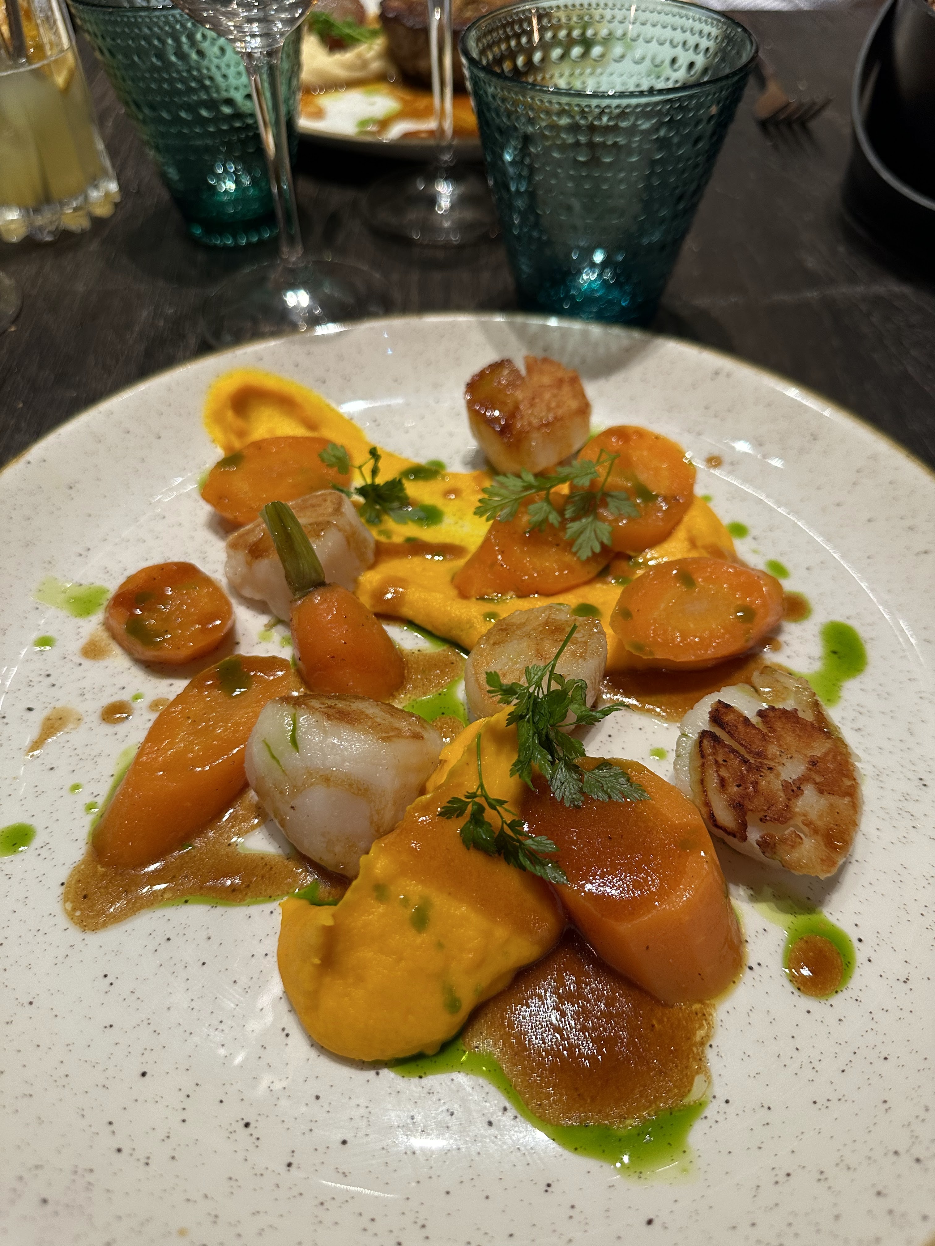 Pour le déjeuner du midi, le menu était super avec du crabe en entrée et un onglet de veau en plat. Très raffiné