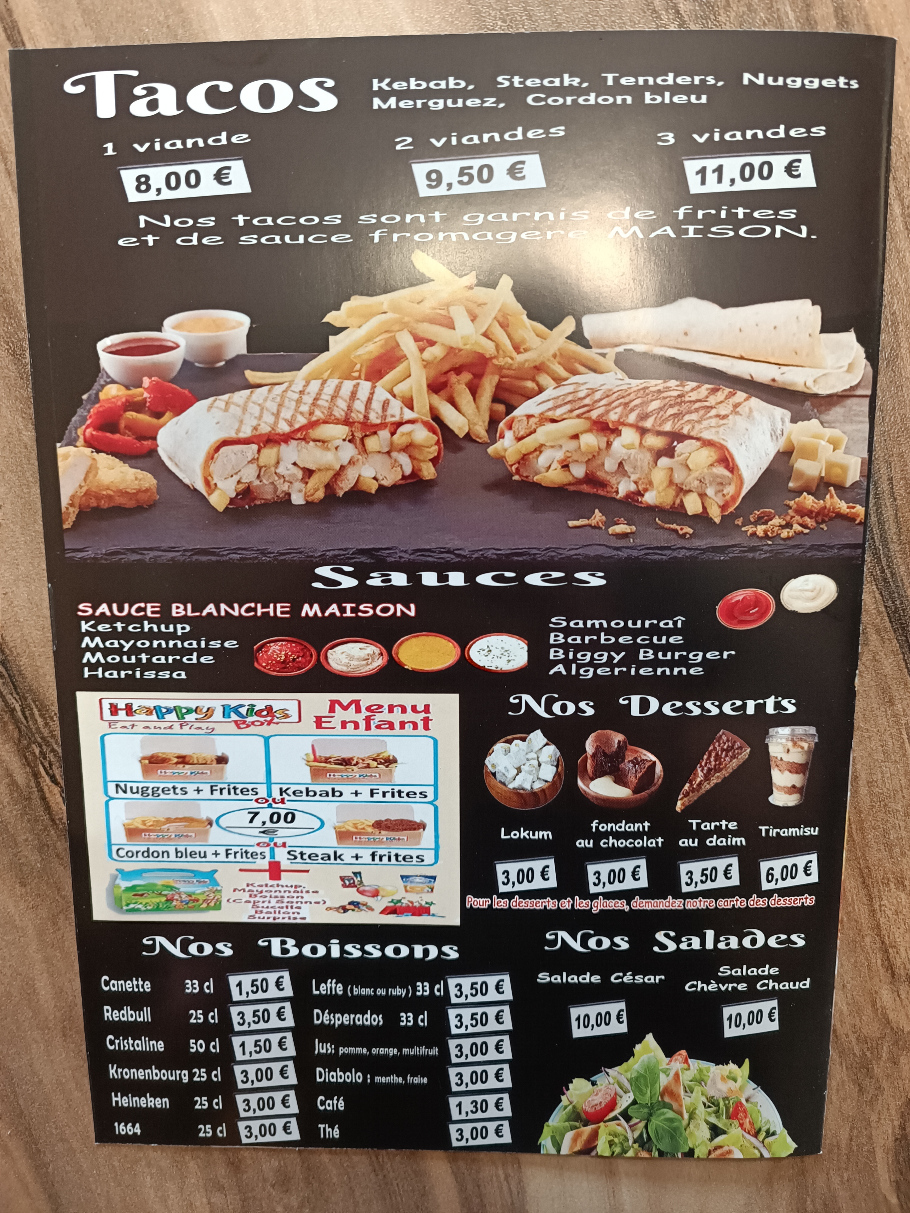 Il y avait les tacos à emporter. Bon service rapide. Nourriture savoureuse.