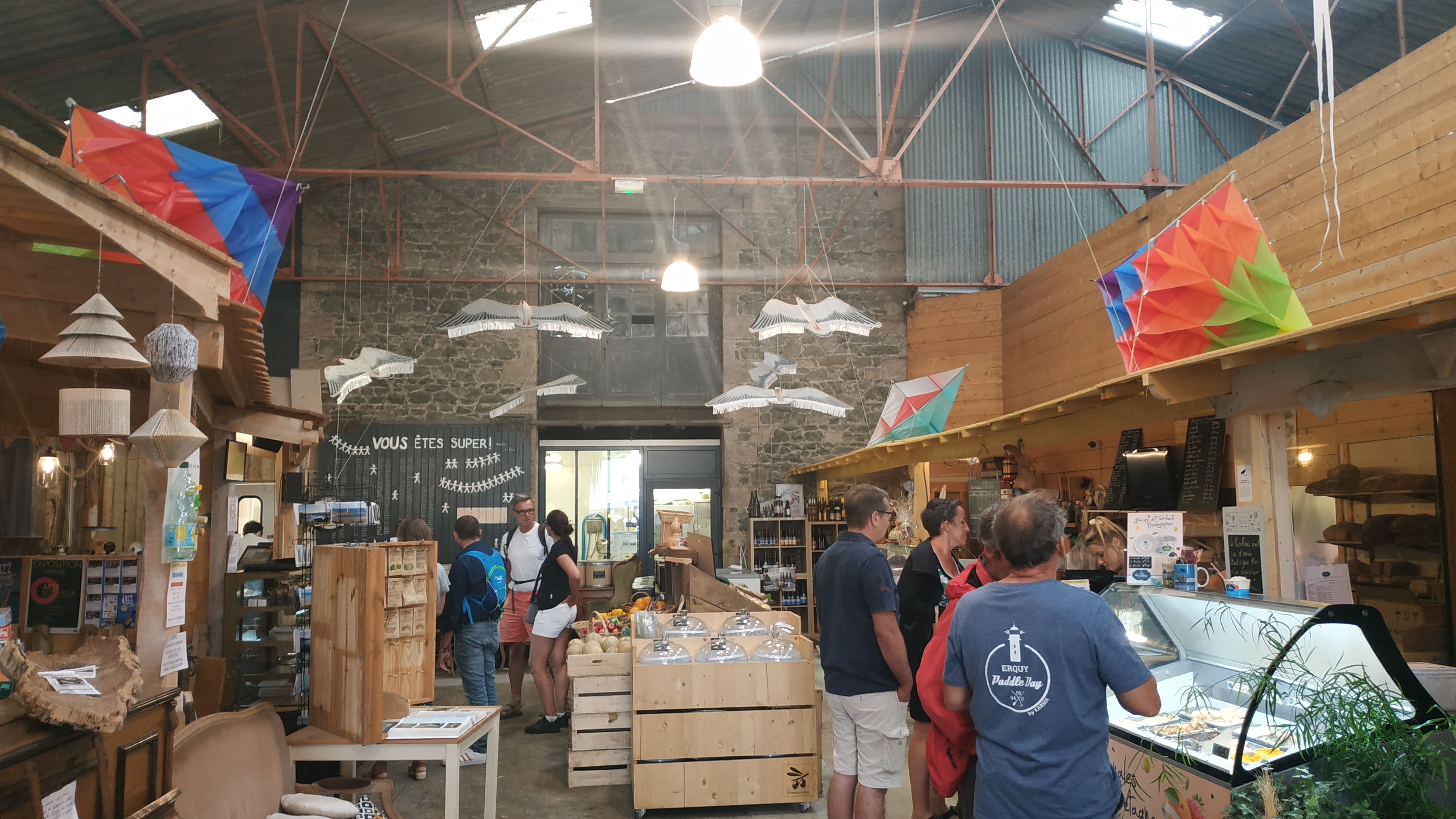 Les Halles de Dahouet. Un lieu atypique ou vous pouvez acheter des objets de créateurs locaux, ainsi que du thé, du fromage, ou encore de l'huile d'olive. Vous pouvez également boire un verre ou déjeuner sur place. Ce dimanche midi, 10 euros plat et dessert a base de produits frais, dans un cadre original, simple et convivial. Accueil chaleureux, délicieux repas. A faire !