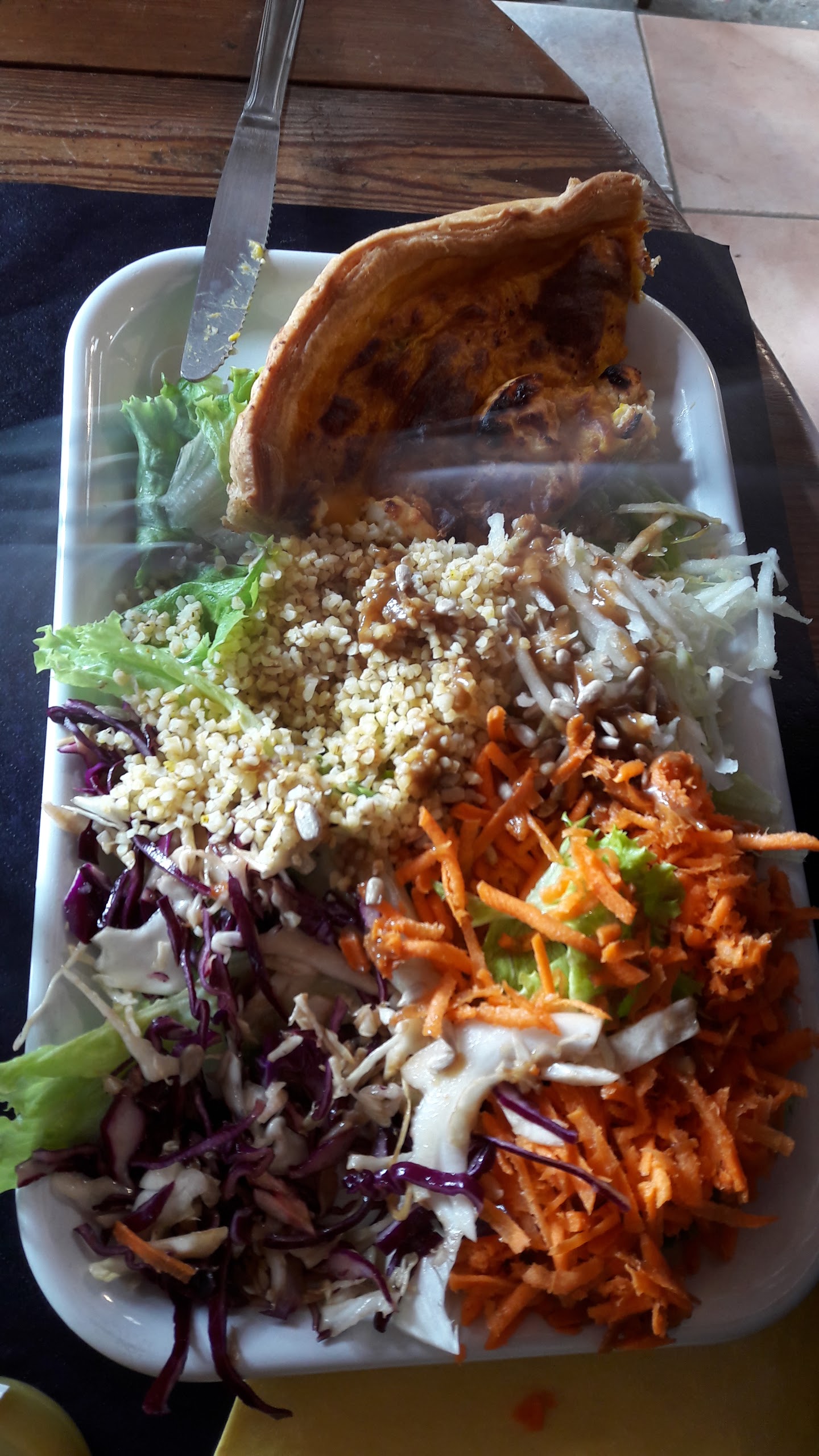 Très belle découverte que ce projet tout récent qui a vu le jour à Pléneuf-Val-André. Petit havre de paix ou l'on déjeune très bien (par exemple : très belle assiette de crudités, variées et de saison accompagnant une part de tarte salée gouteuse, originale et faite maison), sain, bio, local du plat au dessert sans oublier les boissons pour un prix plus que raisonnable ! Les plus petits ne sont pas oubliés, ils ont un coin pour se détendre et jouer en toute sécurité (pour notre plus grande tranquillité) et à table, ils mangent comme les grands en plus petites quantités. Parfait ! Beau projet, bonne continuation !