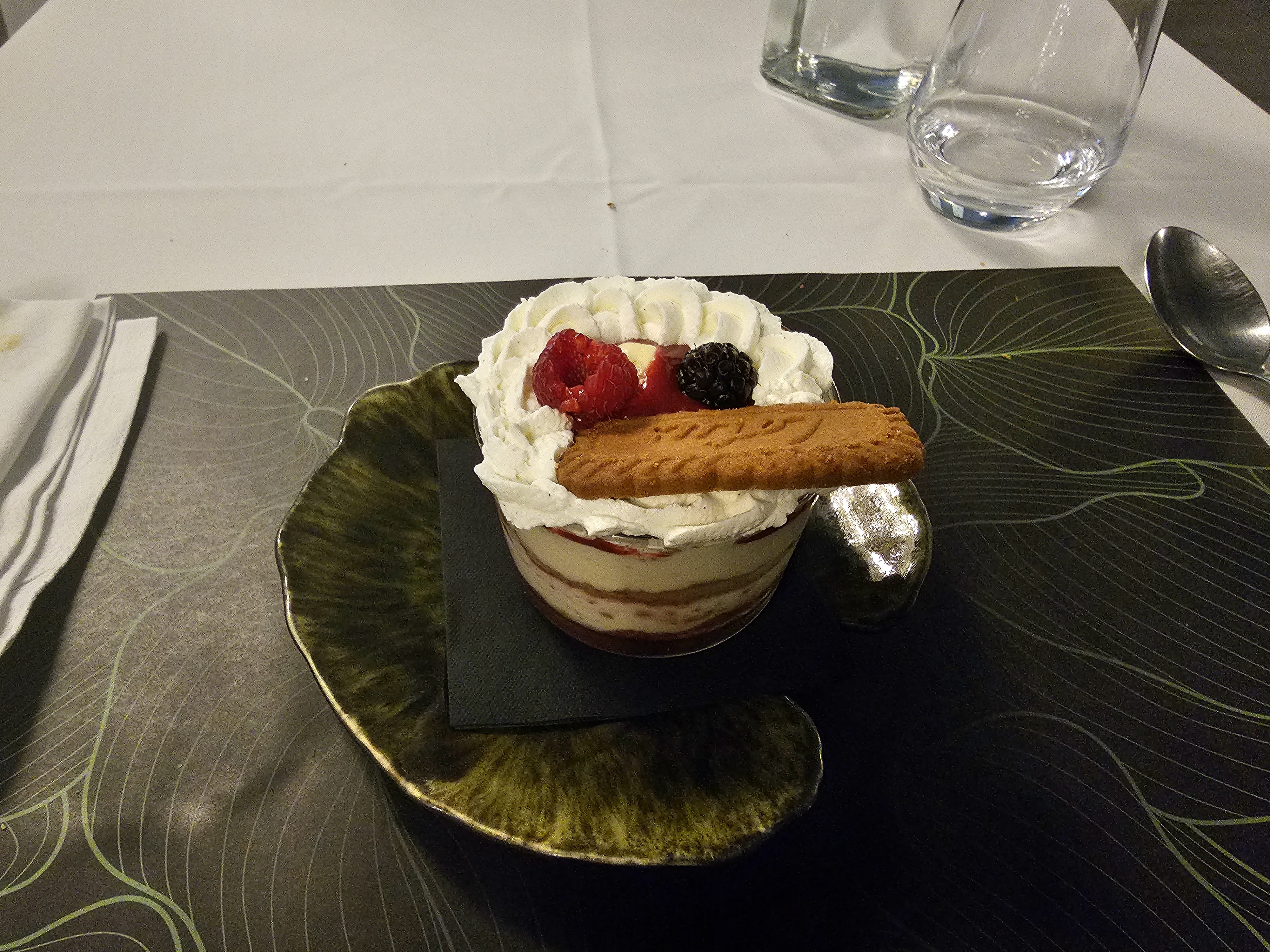 Beau décor mais très très déçue par le dessert, si on peut appeler dessert une cuillère à café de crème chantilly rehaussée d'une tuile aux amande accompagnée de 4 malheureuses framboises et généreusement arrosée de coulis industriel