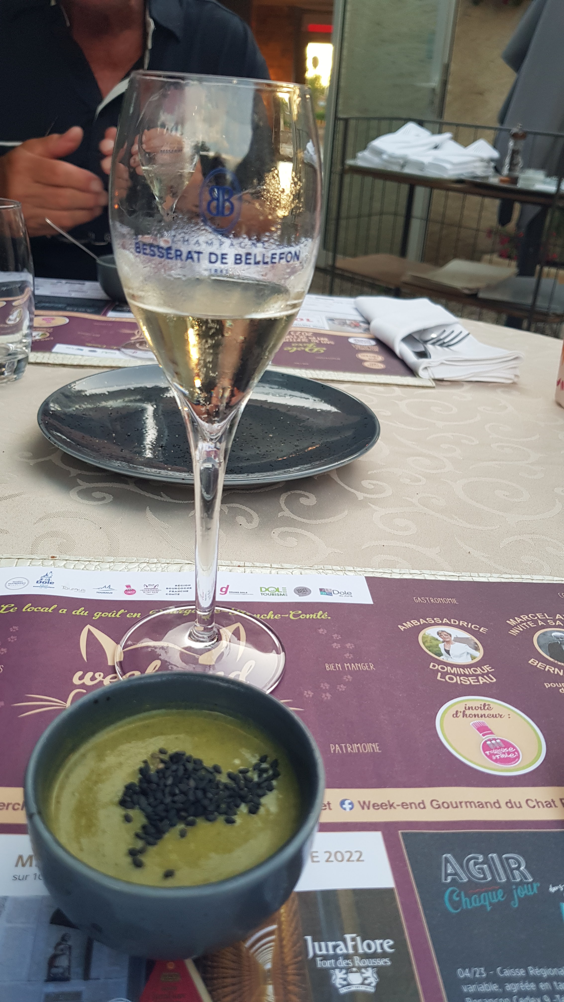 Déjeuner pour 3 personnes: - Petits fours plus mis en bouche: 19,5/20 - 2 pontarlier: 20/20 - Chardonnay : 19/20 Entrées: -2 terrines de faisan au foie gras et châtaignes, confit d'oignons et mangues: 20/20 -1 escargots poêlés, flan de poireaux au lard fumé, bouillon crémé à l'absinthe: 20/20 Plat: -2 rouelle de volaille fermière farcie aux écrevisse s pomme macaire, champignons sauce suprême: 19/20 -1 dos de cabillaud cuit au four topinambours sautés à l'huile de noix sauce vin rouge: 20 /20 Desserts: -1 Crumble de pommes, biscuit aux noix lace vanille, sauce caramel beurre salé: 16/20 -1 Ganache 70% au four Glace au bourgeon de sapin: 14 /20 -1 Tarte aux poires façon tatin Glace macaron de Mouthe, Tuile dentelle: 18/20 Service: Rapide-parfait! Très accueillant! Bravo ! Avis: En général, très bon repas dans l'ensemble, de qualité mis à part la ganache 70% auquelle nous sommes un peu déçus que ce soit sur la présentation que sur la quantité mais bonne malgré tout. Agréable service et personnel souriant. Note finale: 18,55/20