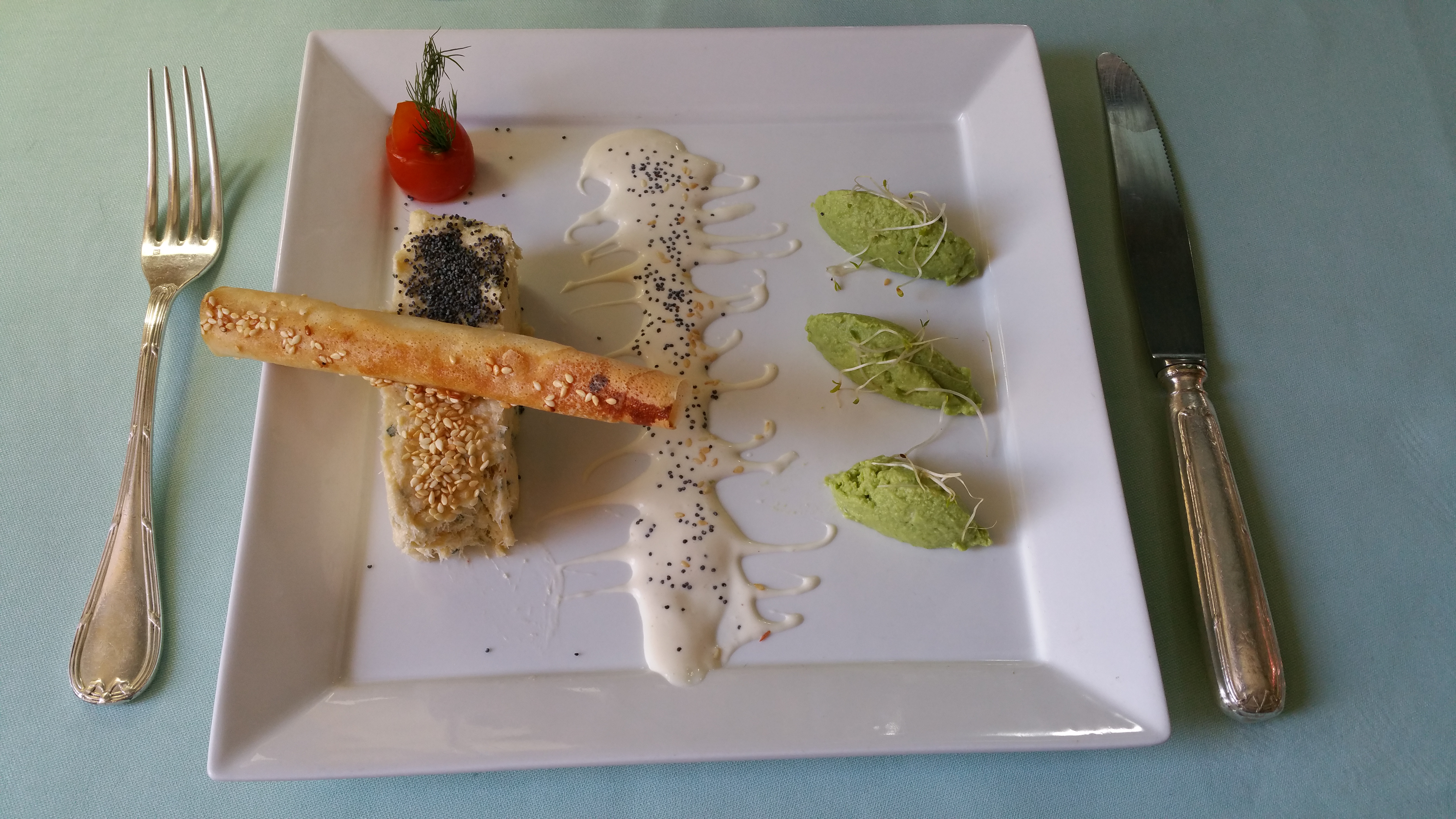 Menu varié avec des mets aux saveurs raffinées. Cadre à l'extérieur dans le jardin très agréable en été.
