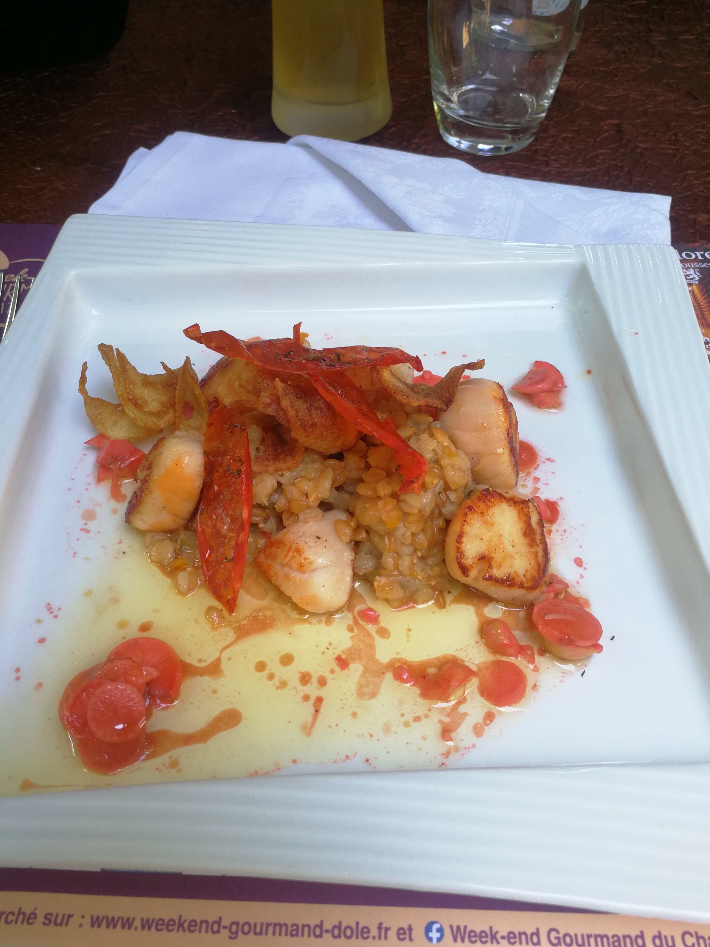 Nous avons mangé avec une vingtaine de collègues. On avait un menu avec amuses bouche, entrée (salade avec toast et saucisses Montbéliarde ou terrine) plat (risotto avec saumon ou une viande) et un dessert (soufflé ou tarte tatin) tout ça pour 20€/personne. Les plats étaient vraiment très bon, je n'ai d'ailleurs absolument rien vu repartir dans les assiettes. Ce que j'ai trouvé bluffant c'est la qualité du service. Les serveurs étaient d'une grande efficacité, tout le monde était servi en moins de 5min, une attention était portée a chaque convive, de l'eau et du pain sans avoir a attendre... Vraiment, au top !
