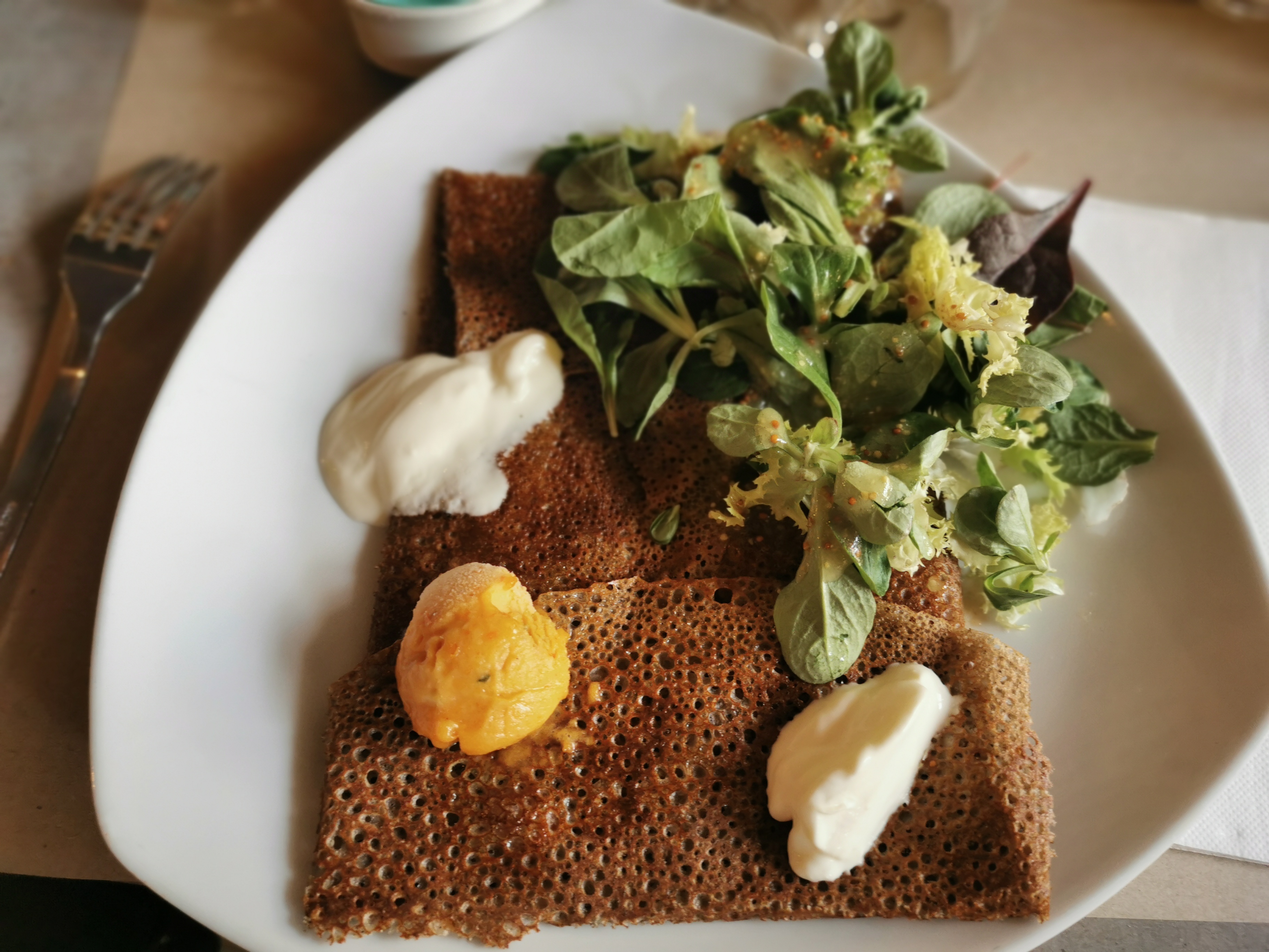 Pour la première fois de ma vie je me suis retrouvée avec une crêpe vide avec juste 2 rondelles de tomates sur le dessus! Pas même la moindre sauce ni aucune explication ou excuse du cuisinier alors qu’il est venu nous servir les desserts à la place de l’adorable serveur à qui j’ai fait constater l’état de mon assiette! Bien dommage car j’avais été satisfaite à mon premier passage pour la même crêpe. Je n’ai pas insisté plus car j’avais invité ma famille de passage mais je trouve ça plus qu’incorrecte, ni plus ni moins du vol. Heureusement j’avais commandé un supplément salade que l’on m’a généreusement offert après lecture de mon addition.