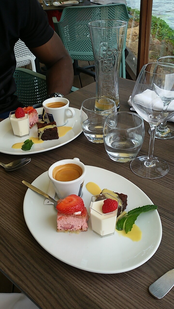 Dommage ….. les entrées arrivent, nous n avons pas encore eu l apéro, pas eu le temps de terminer mon plat de frites et le café arrive avant le dessert. Je prends un fromage blanc coulis de fruits rouges et j obtiens coulis de fruits exotiques …..