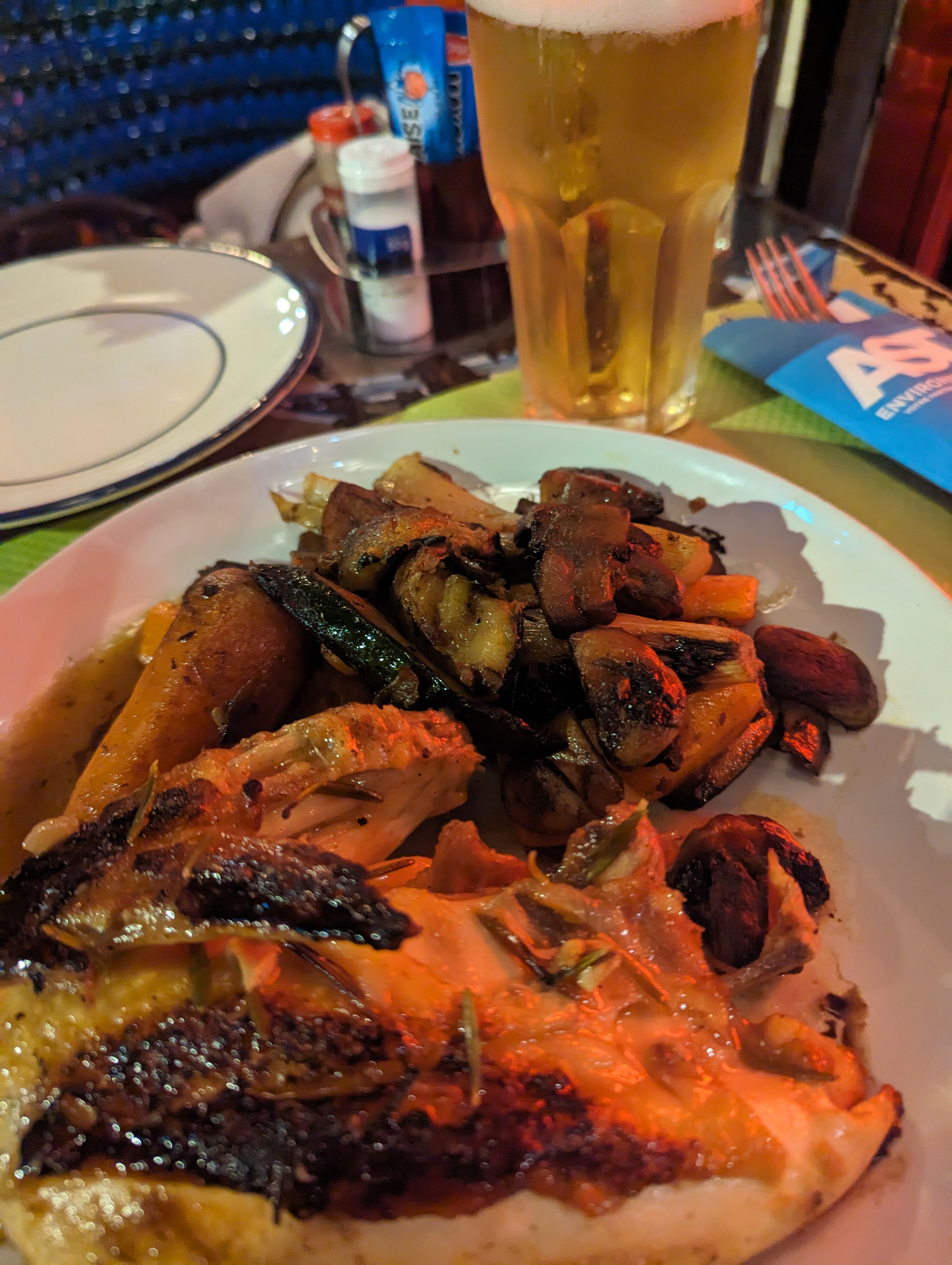 Pardonnez la photo, il faisait sombre, mais faut reconnaitre que les nachos tiraient un peu la gueule. Et c'est le cas de la plupart des plats, le burger n'était vraiment pas terrible et la pizza végé super fade. On soupçonne évidemment du surgelé assez cheap à tous les étages. A part ça les conso sont classiques pour ce genre d'endroit, pas trop chères mais pas terribles non plus. Notamment le spritz qui n'était vraiment pas ouf. Le seul intérêt du bar est sans doute sa taille qui permet d'accueillir des grands groupes. Et je reconnais aussi le bon boulot du staf d'avoir bien géré un soir de match de l'équipe de France.