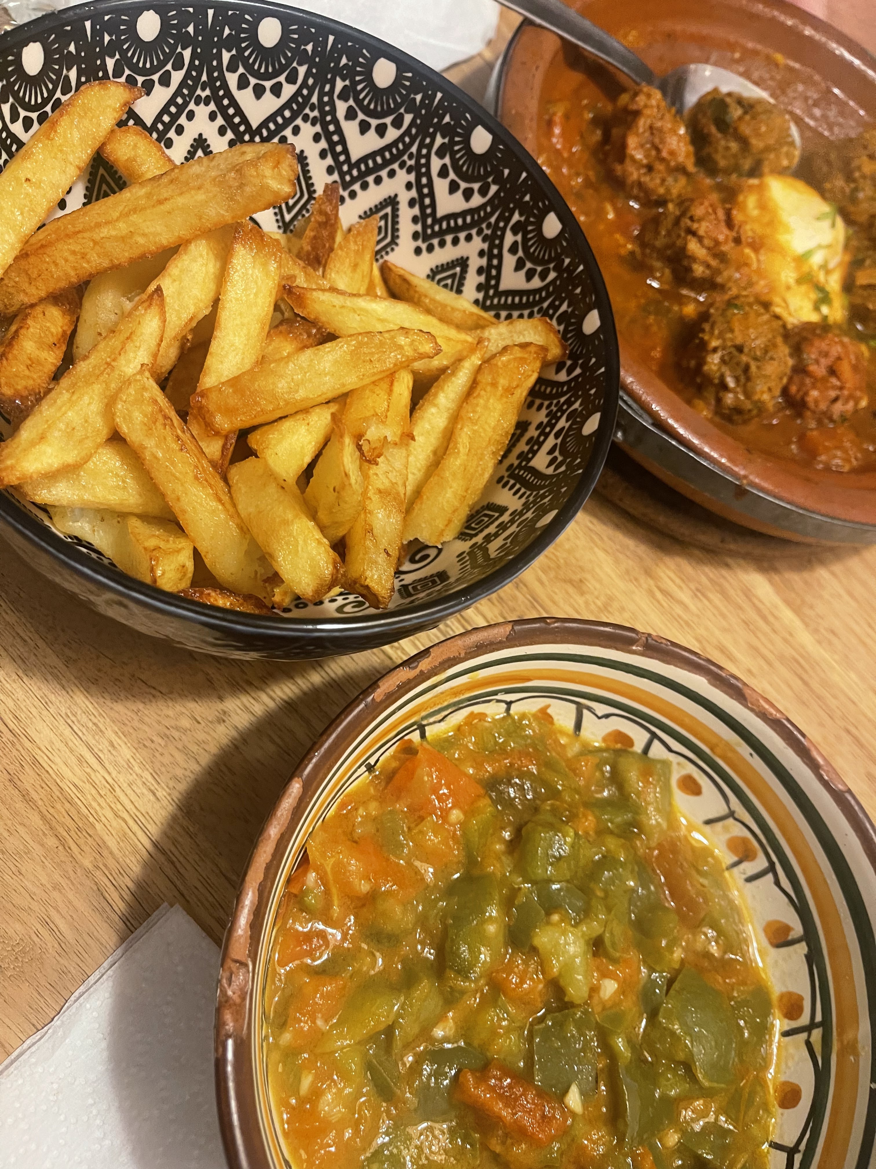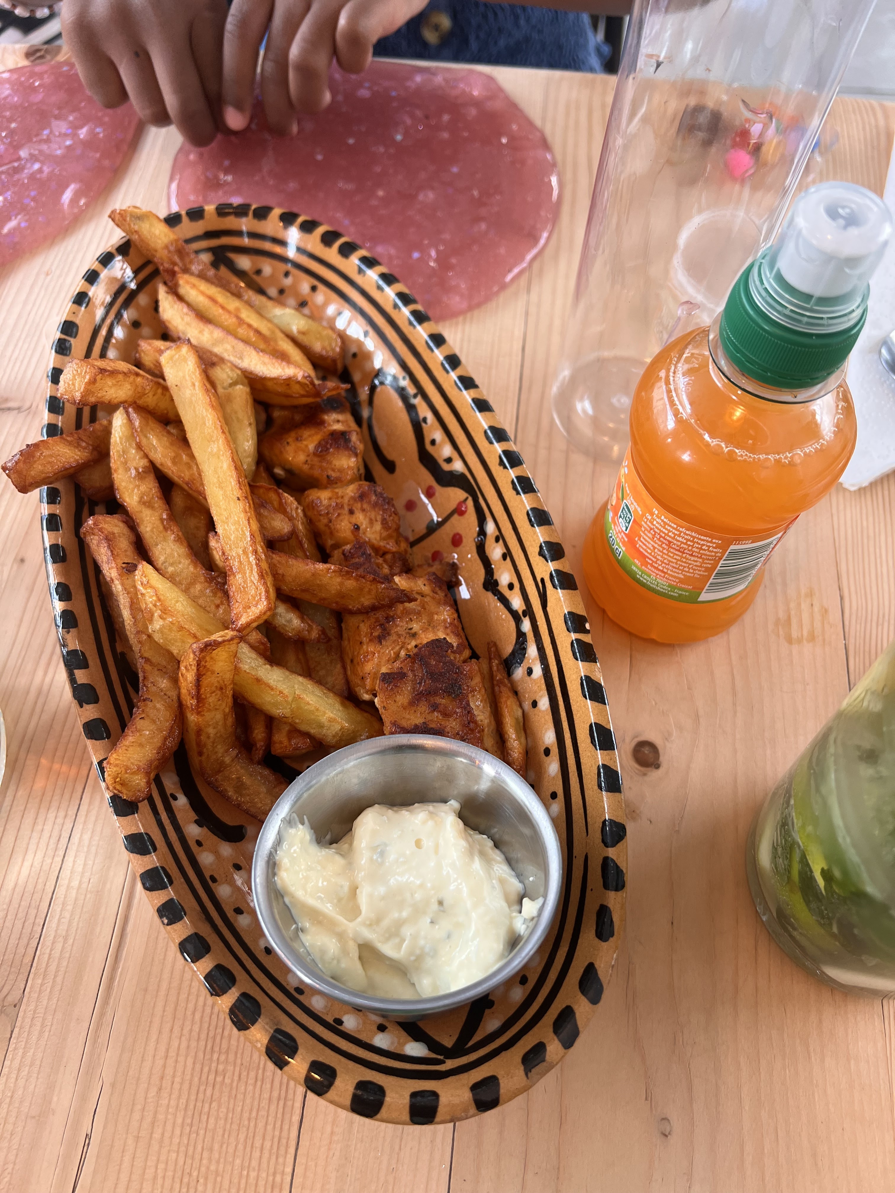 J'ai réussi à prendre une photo des frites avant que les enfants ne mangent tous !! Elles sont délicieuses. J'ai l'impression d'avoir mangé les frites maisons que ma mère peut me faire les dimanches midis. Accueil parfait, hyper agréable et professionnel. On va goûter le Tajine souris d'agneau et je reviendrai mettre un commentaire. Mais à l'odeur, je sais déjà que ce sera un régal . Merci