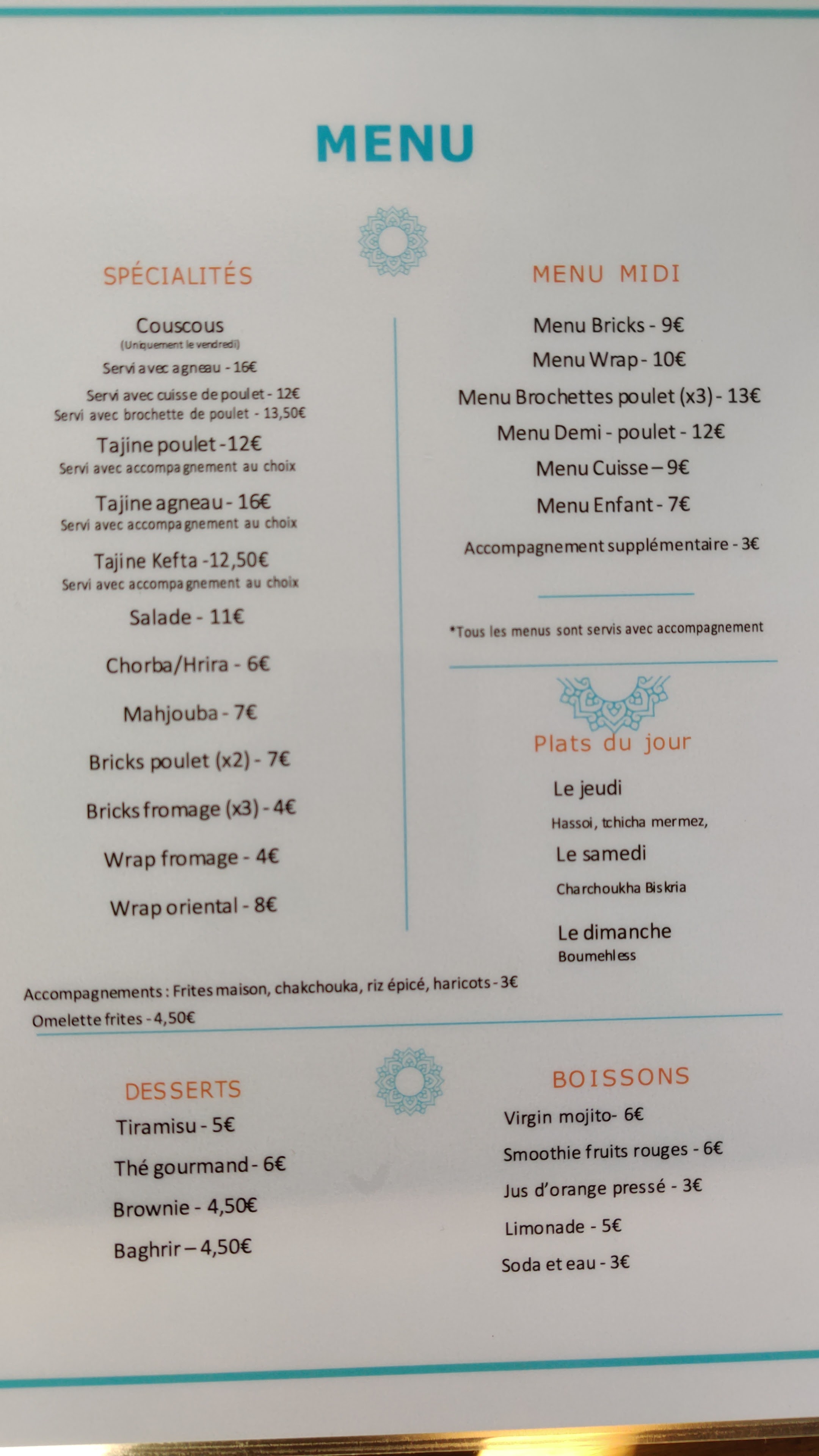 ptit resto sympatique, on y mange bien ( c est ma 2ème fois) et locale comme en vacances au bled🤩 c est du typique et préparé par des mamans, on y trouve des spécialités algériennes et marocaines, la carte propose peu de choix mais les produits sont bons très bonne chorba, brik...par contre pour la brick fromage je conseillerais de mettre de la vache qui rit plutot que du fromage frais type kiri ou saint moret ( jsais pas c etait lequel des 2). Service agréable et resto avec cadre agréable et prix top c est vraiment abordale.