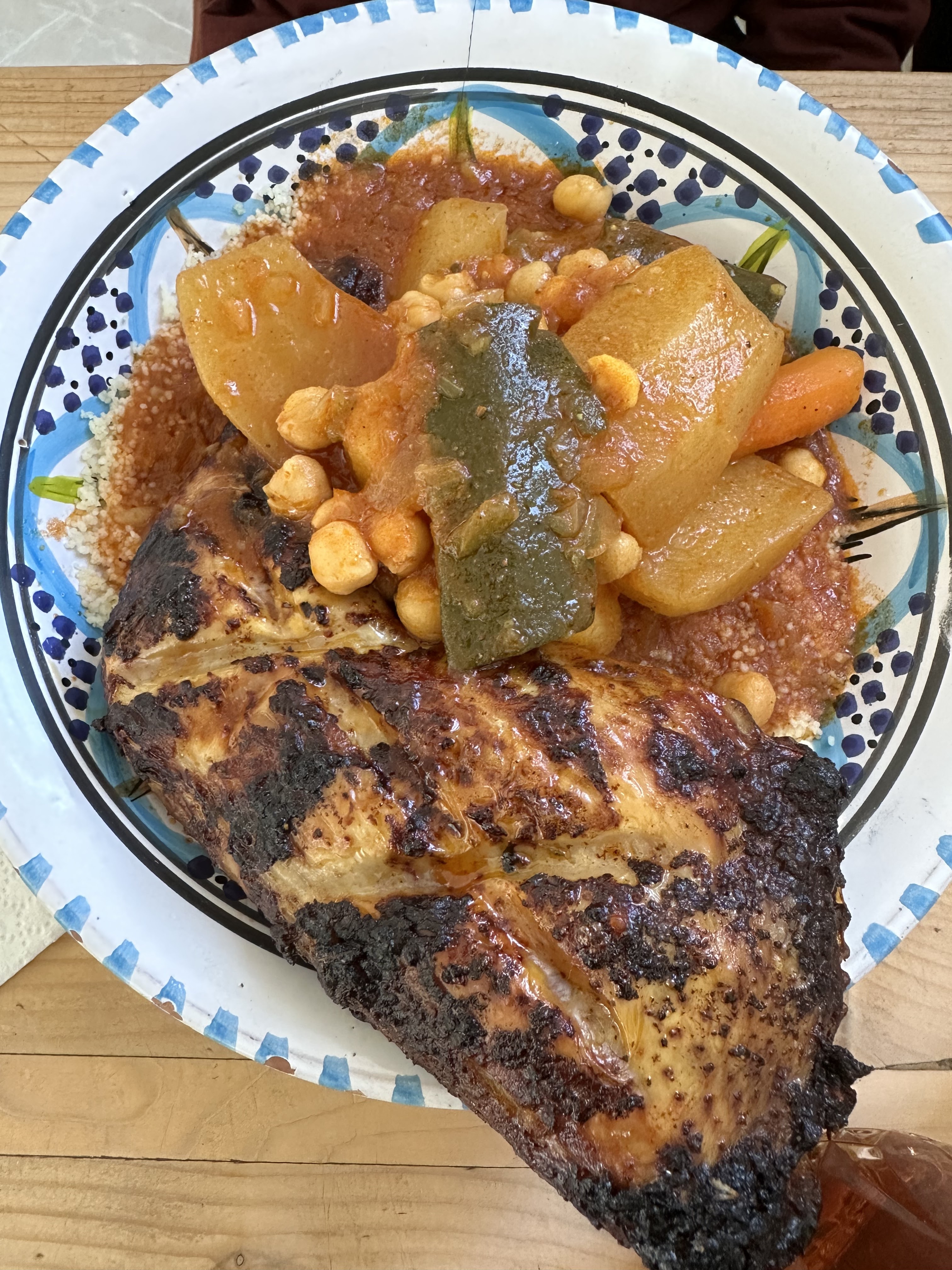 Petit Resto ambiance famille c’est cosy! Service chaleureux, ils sont aux petits soins pourtant c’est le service du Midi! Une carte épurée et claire avec une déclinaison de plat autour du poulet 🍗 ! Nous avons optés pour un plat du jour tadjine kefta et tadjine poulet aux olives c’eta Excellent! Comme la cuisine de Mama! Etant des gourmande on a ajouté une chakchouka et des frites maison! Le pain maison était super bon! Tout allez dans le contexte cuisine gourmande orientale! On recommande! La spécialité de la maison c’est le poulet rôti oriental à tester lors de notre prochaine visite! Encore merci pour l’accueil très belle découverte!