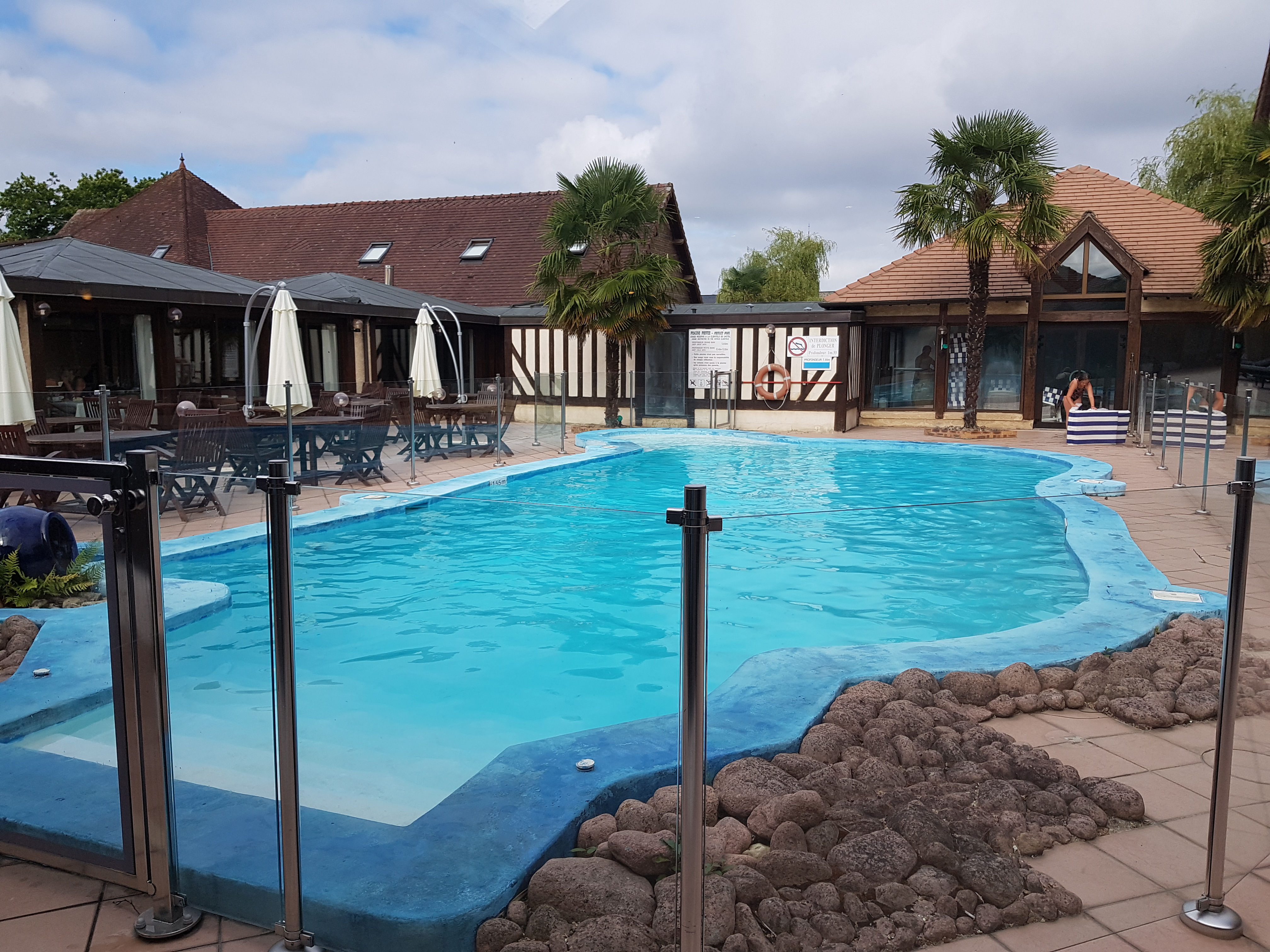 L'emplacement est idéal à 10 minutes de Deauville et de Honfleur. Le cadre est agréable avec de beaux espaces verts. Malheureusement l'hôtel en lui même n'est ni dans son jus ni vétuste mais à la limite des règles de sécurité et d'hygiène. Les chambres sont petite et agrémentées de moisissures. Idem pour la salle de bain qui en plus de ça est équipée d'un vasque entièrement cassé qui tombe quotidiennement (Dommage d'avoir prévu des sandales et non des chaussures de sécurité pour ces vacances). Vous serez aussi informé de l'heure exacte a laquelle vos voisins iront au toilette et de quelle nature sera leur commission. Le terrain de pétanque peut aisément être comparé à un champ de pommes de terre. Le terrain de tennis est quand à lui très agréable si votre adversaire n'est pas à la hauteur, le sol et ses faux rebonds du a sa vétusté permettra de pimenter vos parties.... Et que dire de la piscine ? Certainement que le propriétaire a voulu faire une illusion de mer et laissant apparent des bous de bétons et de cailloux qui s'effrite a différent endroit. Le service quand à lui est correct si l'on exclut le personnel à l'accueil qui est froid et peut vous faire patienter un long moment avant d'avoir une réaction et de prendre en charge votre demande si cela ne les dérange pas trop dans leur confort quotidien.