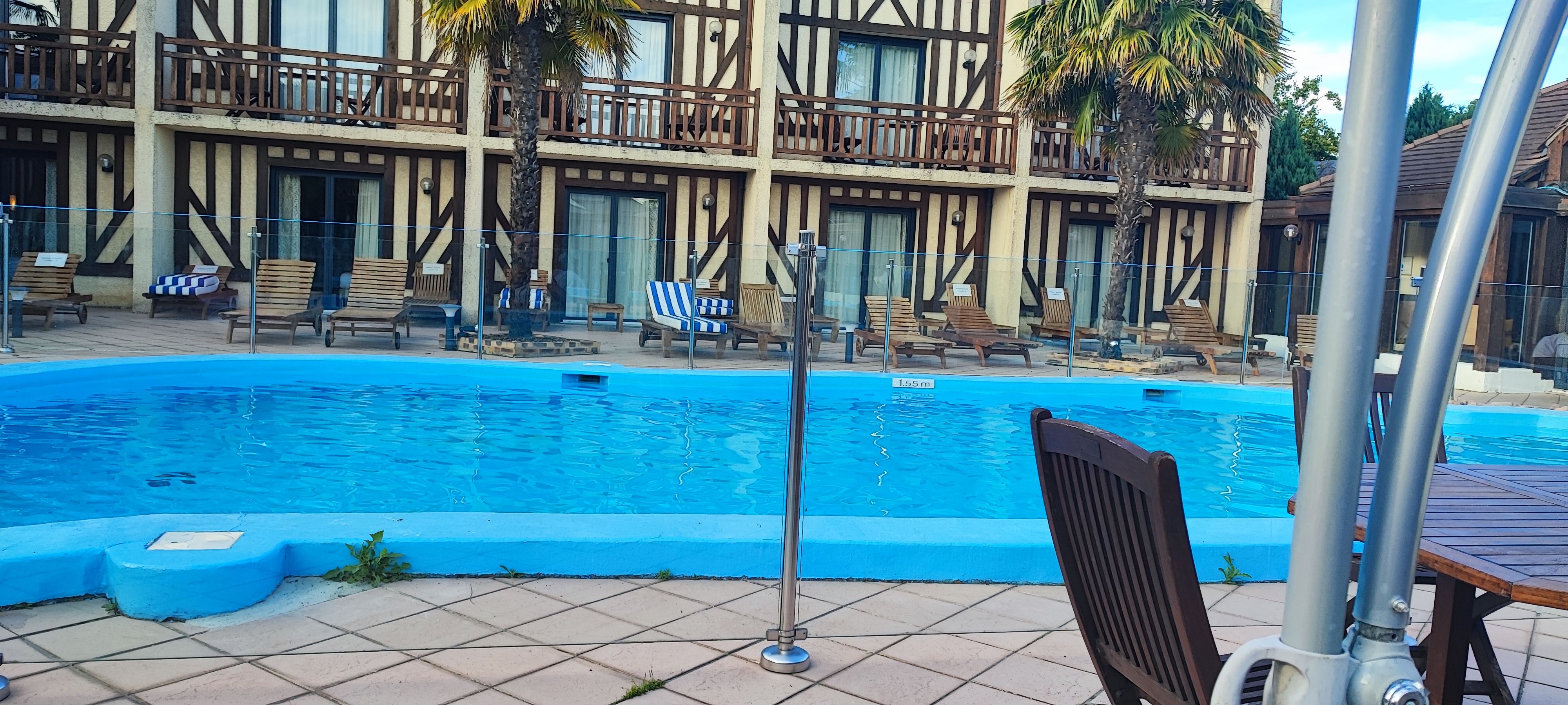 Bonne expérience ! J'avais lu des commentaires pas top avant d'y aller mais je m'y suis quand même rendu pour me faire mon propre avis et je n'ai pas été déçu, alors certes les lieux/chambres sont dans leur jus et mériterait un petit coup de jeune mais la réception et le restaurant font modernes. Accueil très sympa avec en prime petite visite des lieux. Nous avons eu un problème de chasse d'eau dans notre chambre, nous avons donc appeler l'accueil et elle n'a pas chercher à comprendre et nous a tout de suite changer pour une chambre au dessus niveau prestation etc, par rapport à la notre, avec en prime vue sur la piscine extérieur et les palmiers. De quoi être dépaysé le temps d'un week-end. Deauville n'est qu'à 15 min en voiture ce qui permet de vraiment être à côté de la ville, tout en dormant à la campagne. Le seul vrai hic était la piscine, dites chauffée mais enfaîte froide... Sinon super week-end en amoureux !! Merci à toutes l'équipe de l'hôtel qui est adorable !