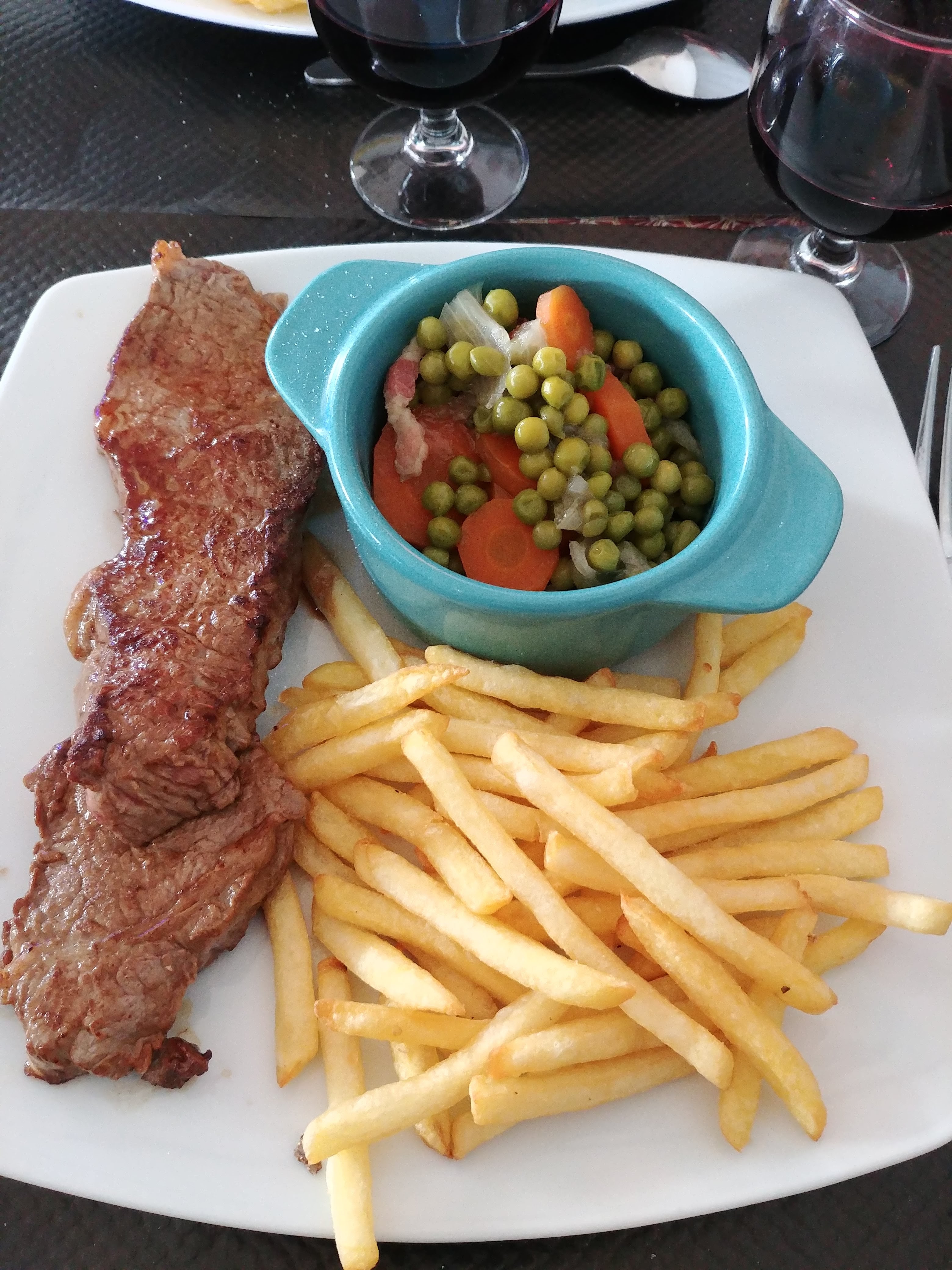 Petit menu du jour avec très beau et très bon buffet d'entrées , un faux filet avec frites et petits pois maison , une salade de fruits et 1/4 de vin . Parfait comme toujours .