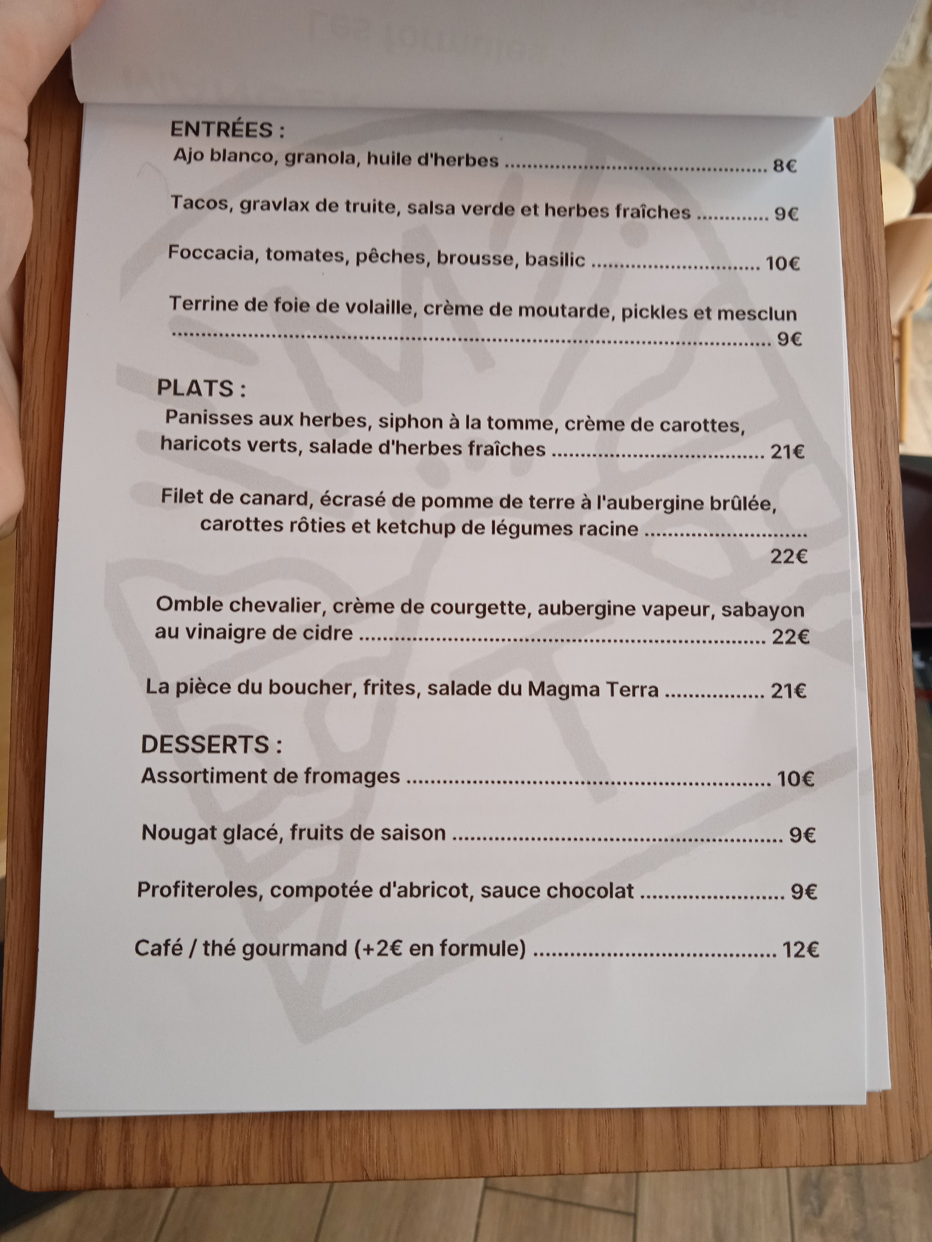 Belle découverte. Salle chaleureuse et conviviale . Très belle carte. Chocolat chaud délicieux et gâteau betterave rouge surprenant et original. Nous reviendrons manger le midi prochainement. Menu Magma Terra à midi avec 2 propositions de plats dont un végétarien. Les plats sont tous succulents. Le service est très agréable et souriant. Disponibilité pour expliquer la carte et s'adapter aux demandes. Un lieu chaleureux , apaisé où on se sent dans une bulle. Version salon de thé ou restaurant je recommande fortement. Excellent rapport qualité/ prix.