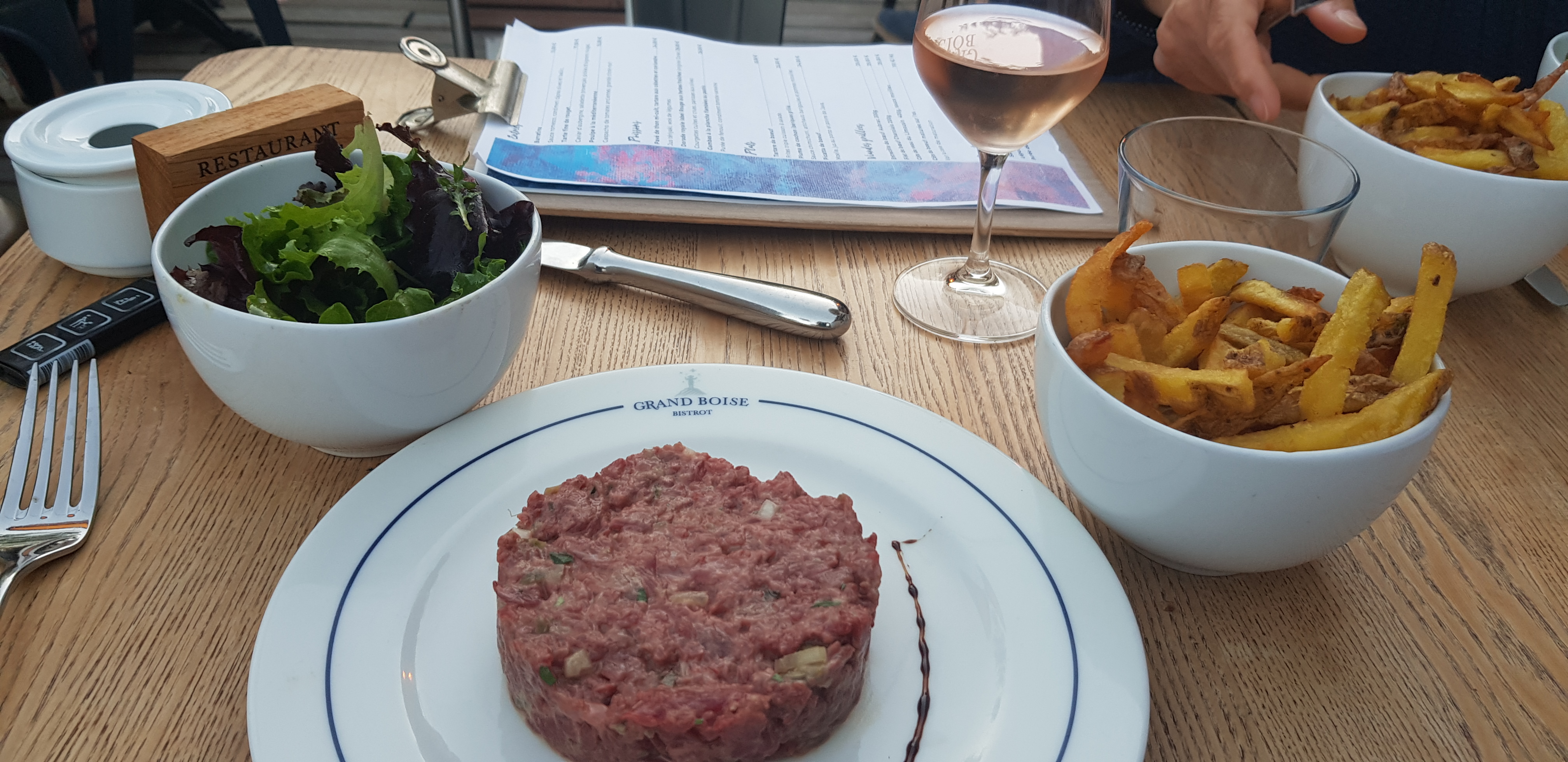 Accueil chaleureux vin et charcuteries excellentes et quantité largement suffisante.la viande est tendre et très gouteuse.la cuisson des frites en 3 façons les rendent croquantes a souhait.en partant on est loin d'avoir encore faim!