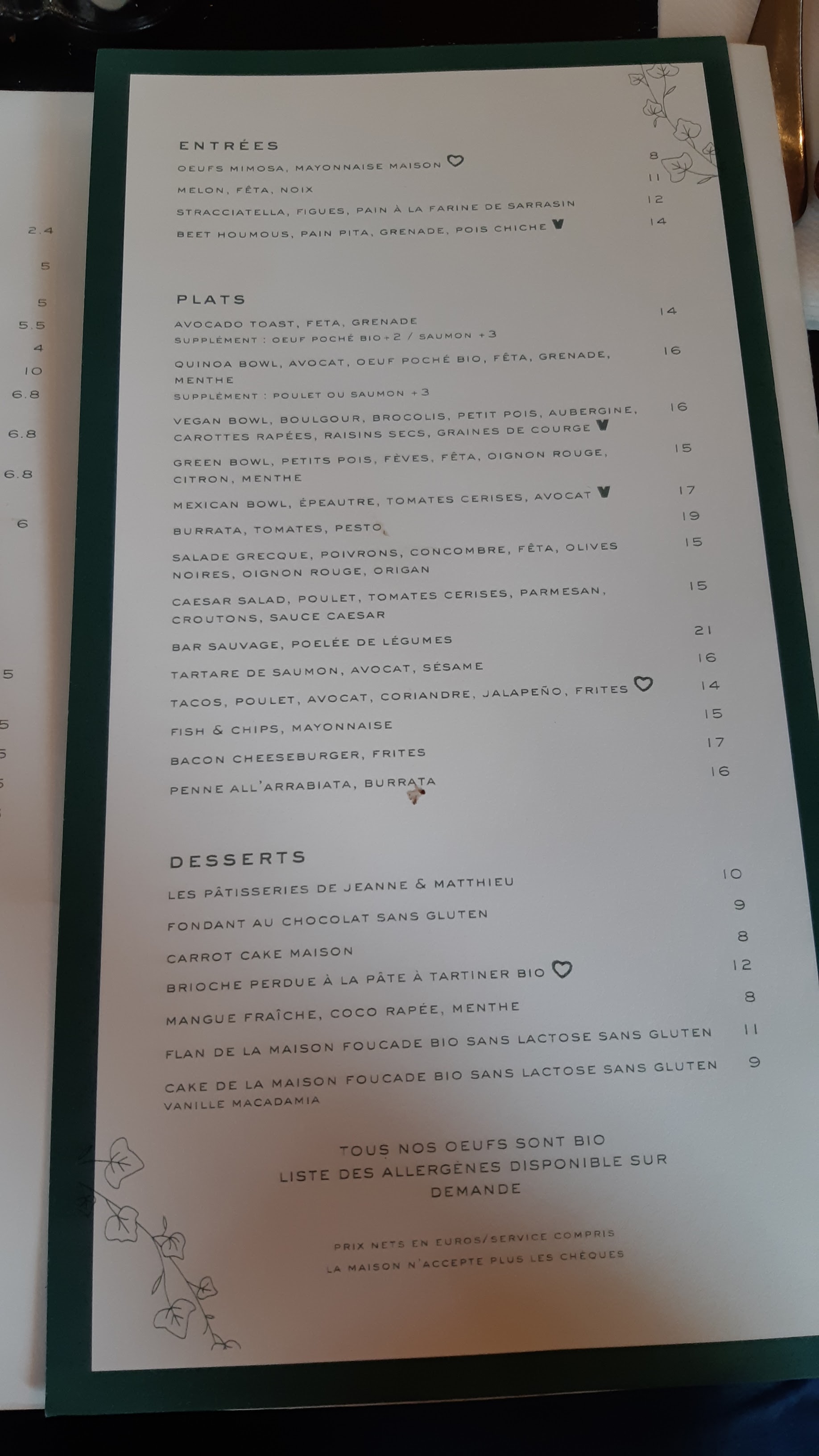 Une carte intéressante. Des ingrédients frais et healthy. Mais une organisation un peu bancale. Je déconseille d'y aller le dimanche dommage pr le brunch mais a 16h fini . Serveur très débordé et pas du tout à l'écoute. Les prix sont élevés mais vu le quartier et la déco voilà.