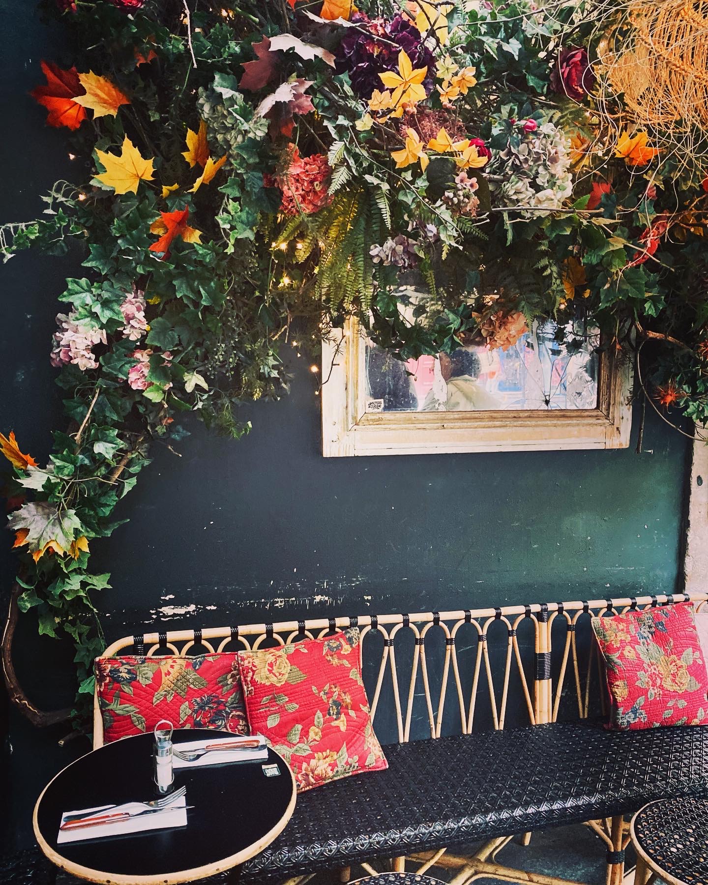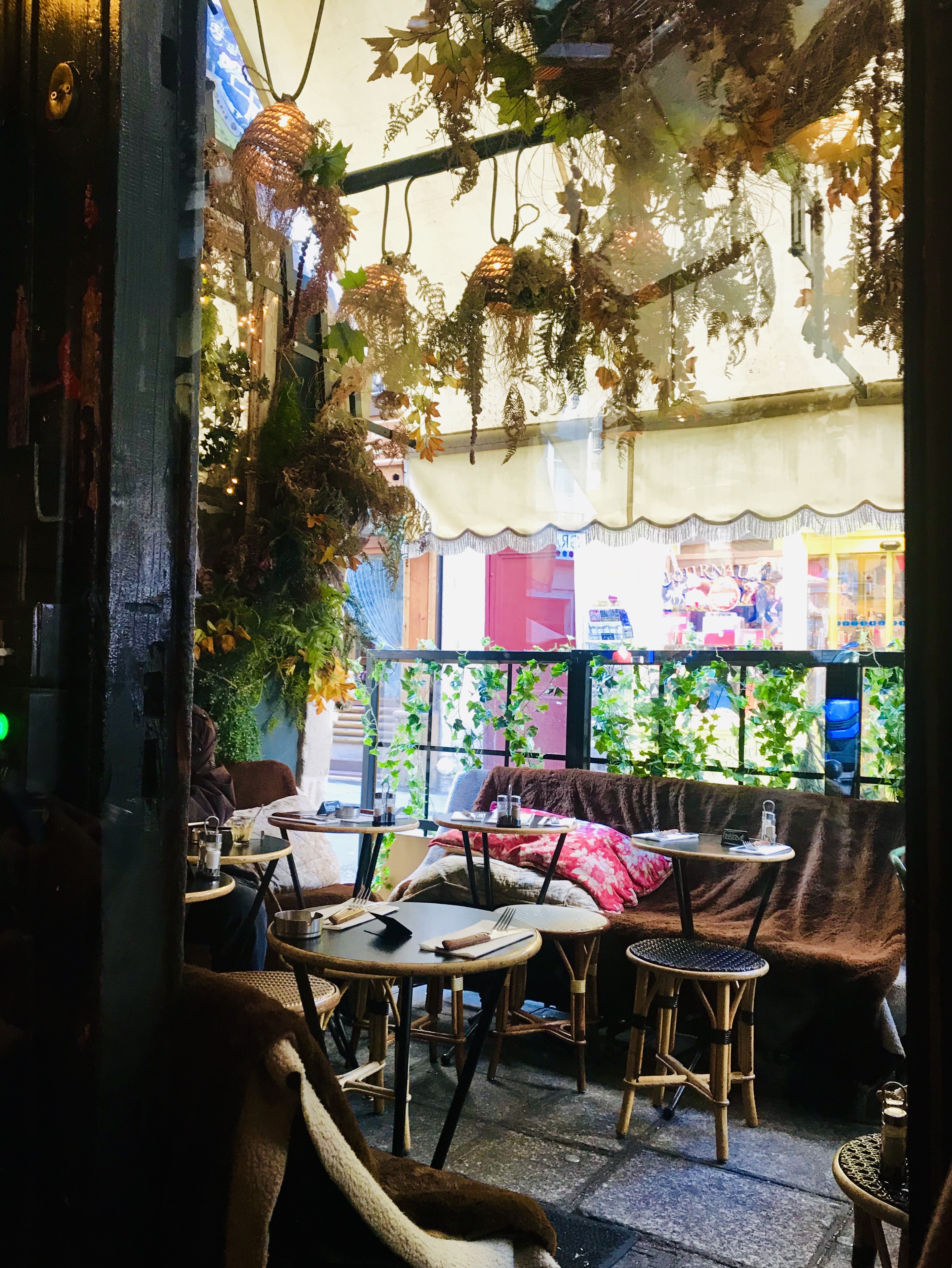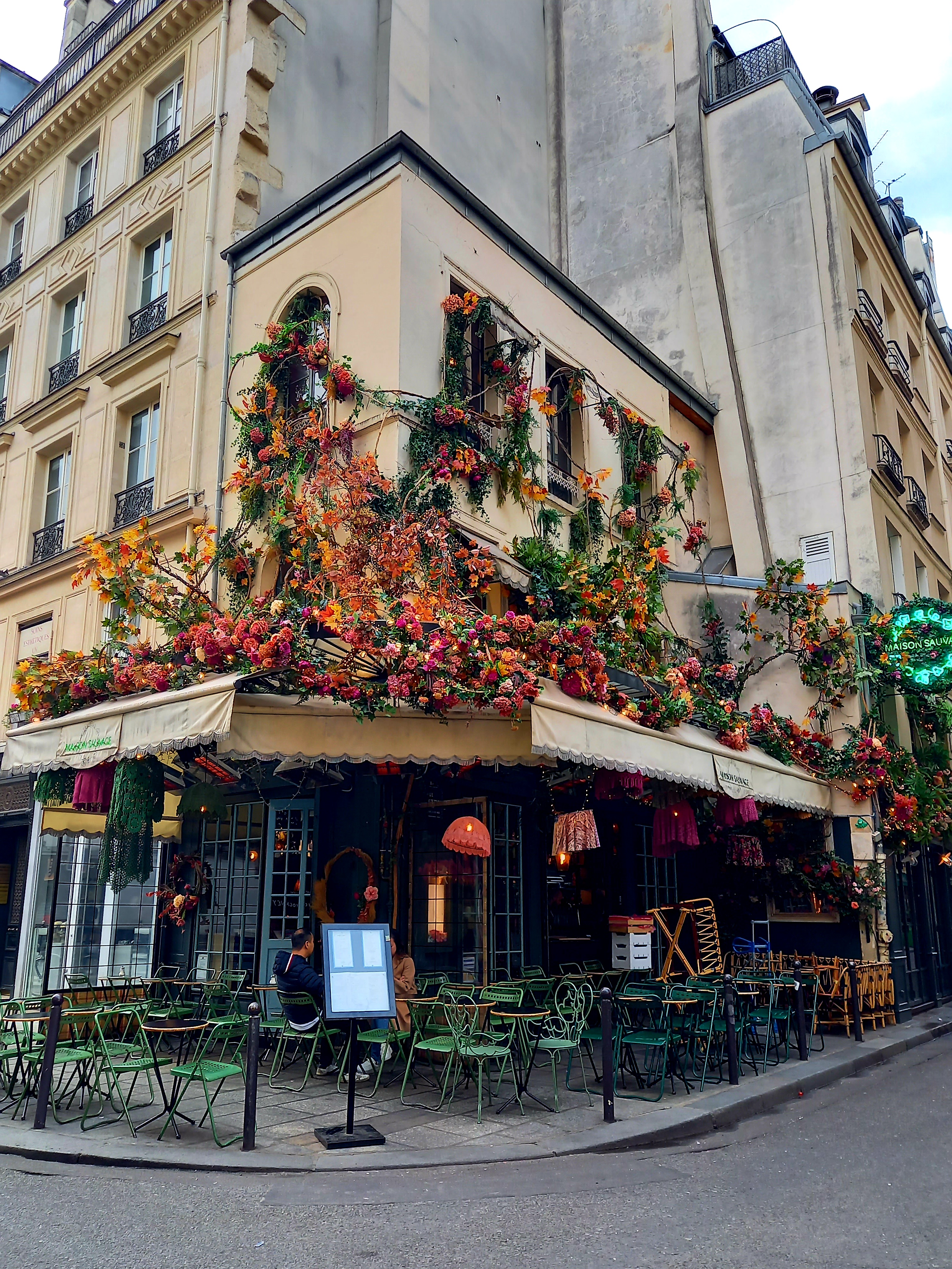 Maison Sauvage avec son décoration florale attire des gens pour goûter ses plats, pour prendre un ☕ avec 📖 et juste poser s'asseoir et regarder le défilé les gens dans la Rue Bucci