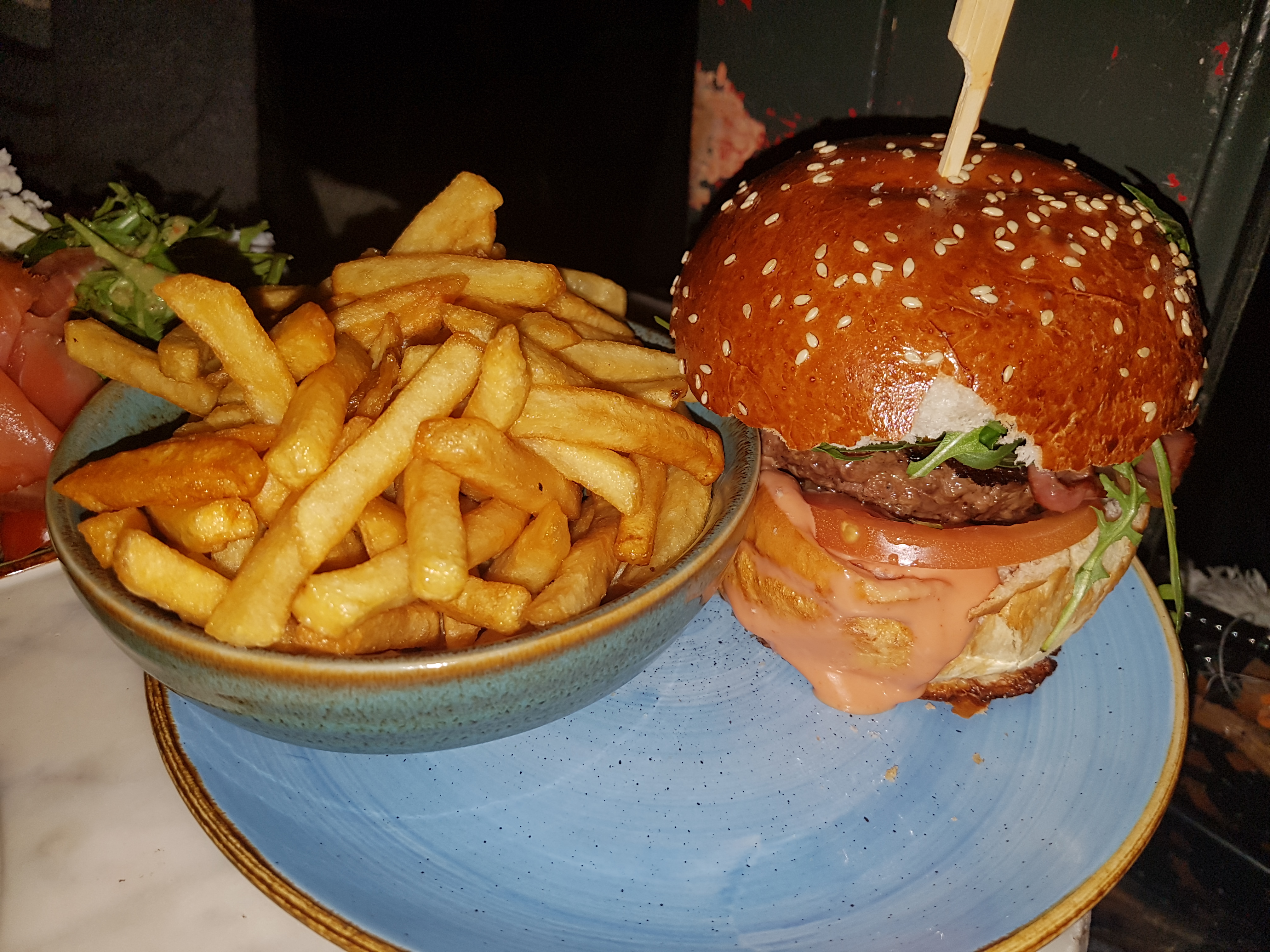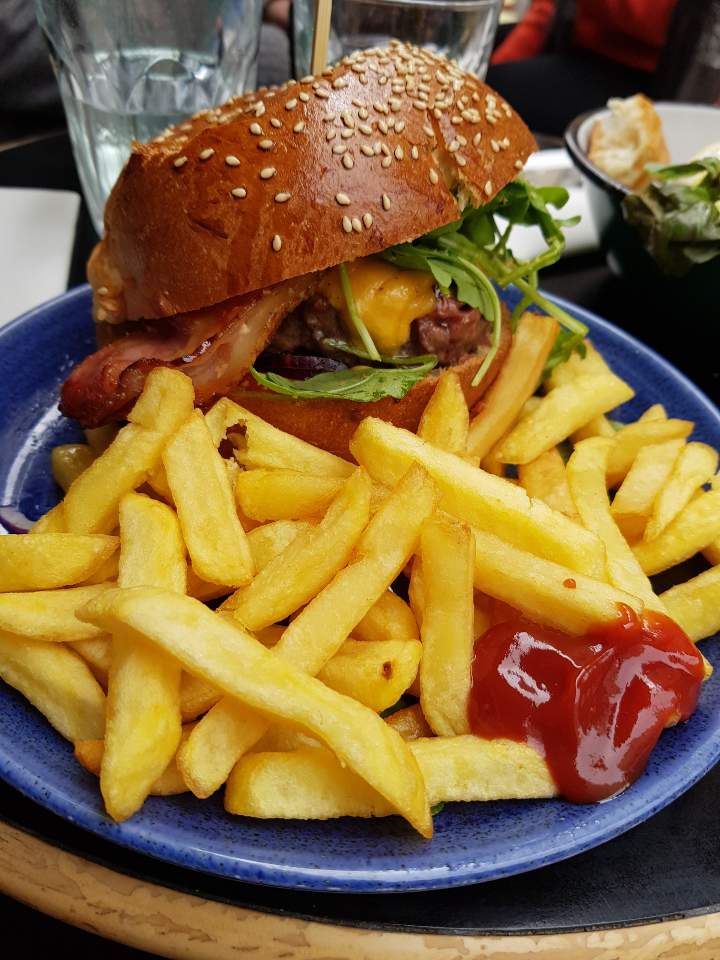belle déco attrayante qui nous a donnés envie de rentrer ...nous avons commandé un burger frites maison ...plat bon, assez copieux , mais le steak haché était très fin d où les 3 étoiles ... Le 33cl d eau a 5.5€ est un luxe , mais mieux que de l eau du robinet ... endroit qui mérite d être découvert pour un en-cas ...mais pas pour plus