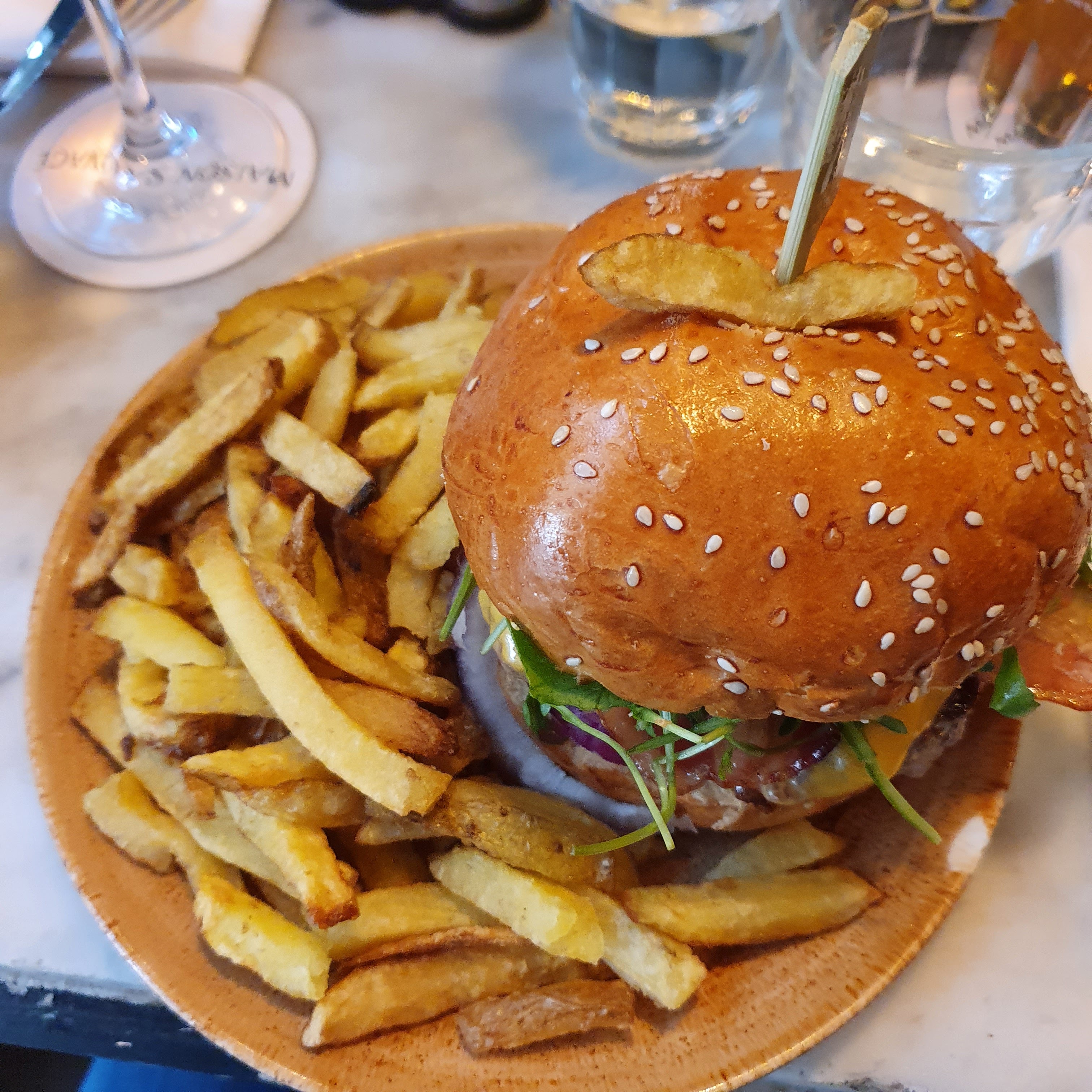 Points positifs : - La décoration est vraiment belle, avec une ambiance agréable qui s’accorde bien au quartier Points négatifs : - J’ai demandé plusieurs fois pour obtenir une carafe d’eau, ce qui est un peu dommage - J’ai commandé un cheeseburger, et malheureusement, j’ai eu mal au ventre pendant 2 jours après. Cela a tout gâché l’expérience pour moi