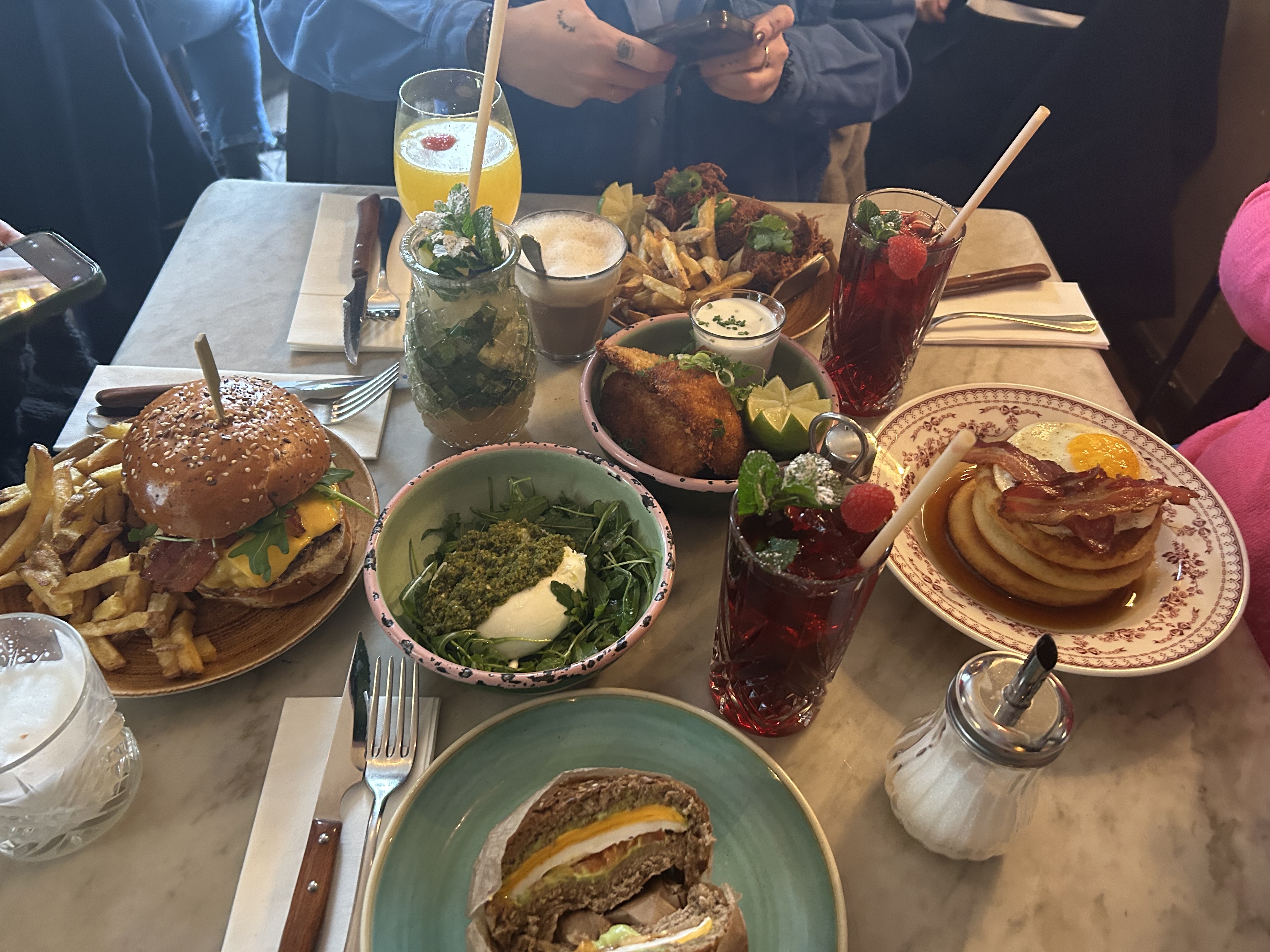 « pancakes fruits rouges mascaropone et jus de citron pressé » : les pancakes ne sont pas fait minutes. Au final les fruits rouges se sont transformés en confiture, et le jus frais pressé est coupé. À 13€ l’assiette et 7€ le jus, ça sent un peu l’arnaque.