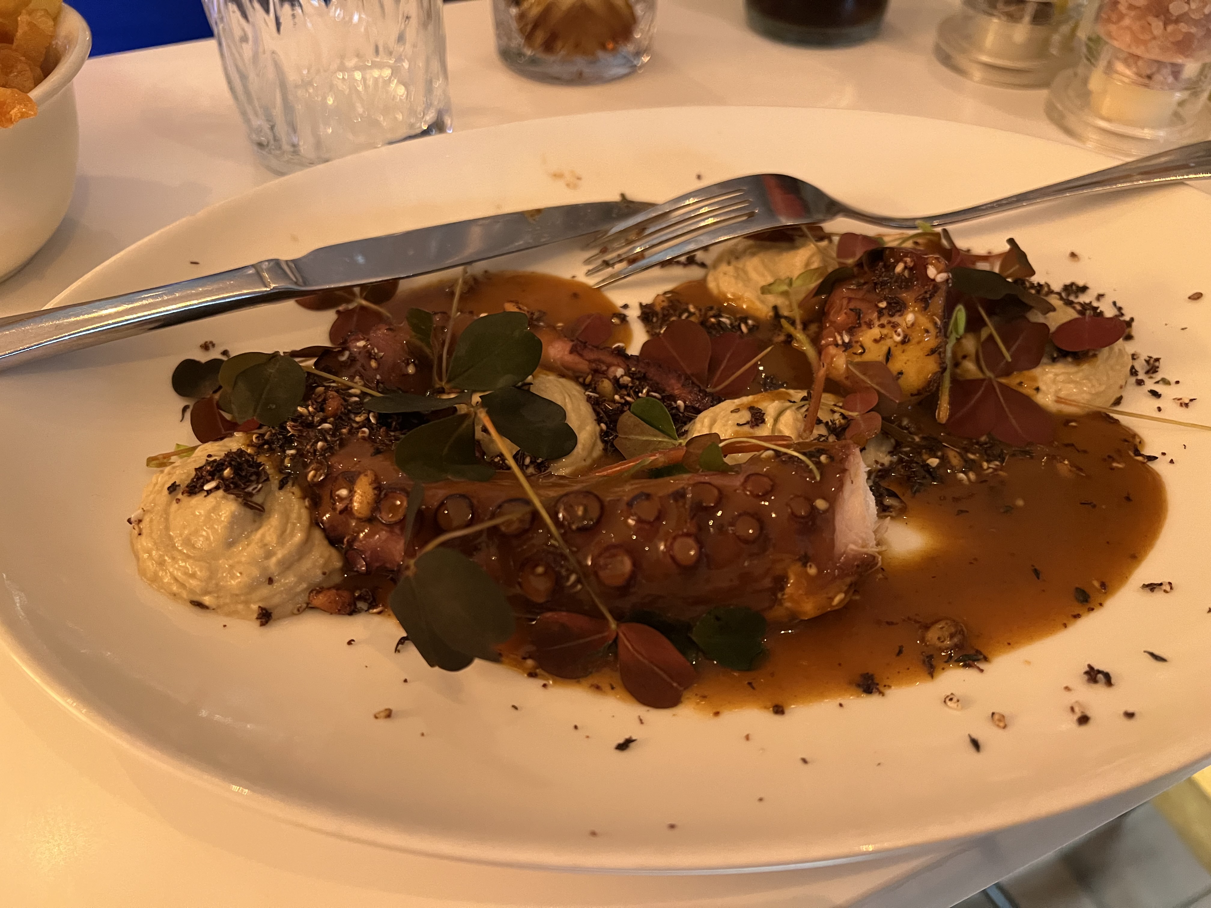 L’endroit était très beau, c’était très bon et très bien servis, le serveur était souriant aimable et sympathique, en ce qui concerne le plat j’avais pris le poulpe et c’était très bon je suis très satisfaite de cette expérience