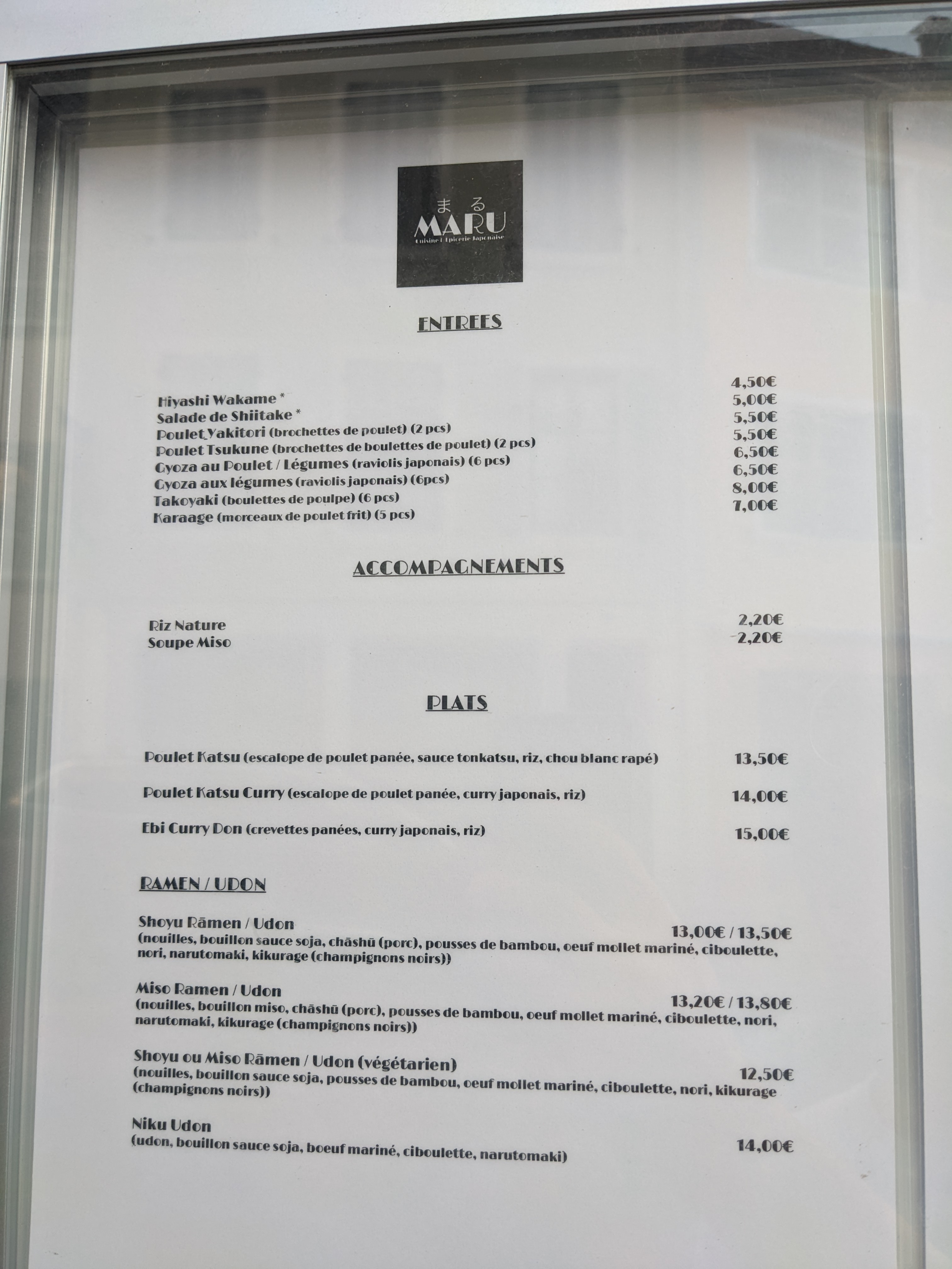 Et dire que la dernière fois que j'avais mangé des gyozas, ils étaient surgelés... Je vous recommande le Maru fortement ! Pourquoi ? 1) Une cuisine authentique, simple et goûteuse : même le riz nature a un arôme marquant, c'est peu dire. Les ramens sont exceptionnels : quel plaisir en cet hiver froid ! À vrai dire, tout est recommandable sur la carte : ça donne envie d'y revenir régulièrement tester les différents Donburi ou Yakisoba. 2) Un repère de connaisseurs : au vu des prix peu onéreux et de la prestation, de nombreux clients semblent être devenus des habitués. C'est gage de qualité. Le restaurant était plein ce soir, d'ailleurs : pensez à réserver. 3) Un service chaleureux et humain : j'ai vu le responsable prendre le temps de discuter et de s'intéresser aux différents clients. On est loin d'un service express , ce qui est plus qu'appréciable. Pour le coup, même les restaurants de la rue Sainte-Anne (certains saisiront certainement la référence) n'assurent pas une telle prestation. En bref, venez tester le Maru.