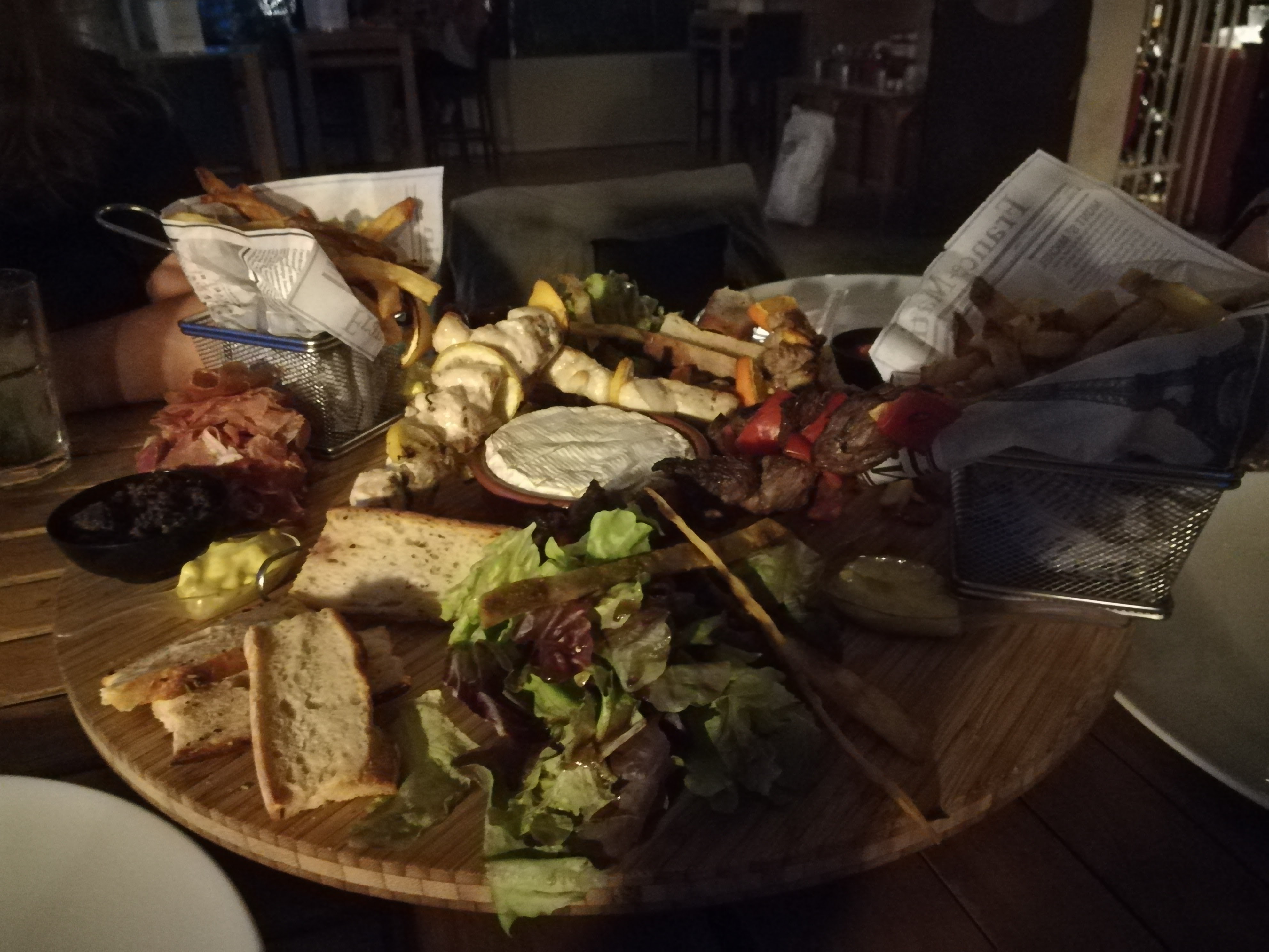 Nous étions 4 et avons pris une plancha à 52 euros et très déçues les minis burgers(congelés) étaient froids nems et beignets de crevettes très moyens,ils avaient oublié le comté,tortillas ce n'étaient que des miettes et les tapas du chef : 3 morceaux de pastèque!!!.Il n'y avait aucune sauce pour les frites...bref très mauvais rapport qualité prix.Les cocktails étaient bons.Au moment du dessert nous avons attendu 40 mn pour finalement s'entendre dire qu'il n'y en avait plus!!!! Au final n'y allez pas pour manger mais pour danser et profitez de l'ambiance qui elle était très sympa