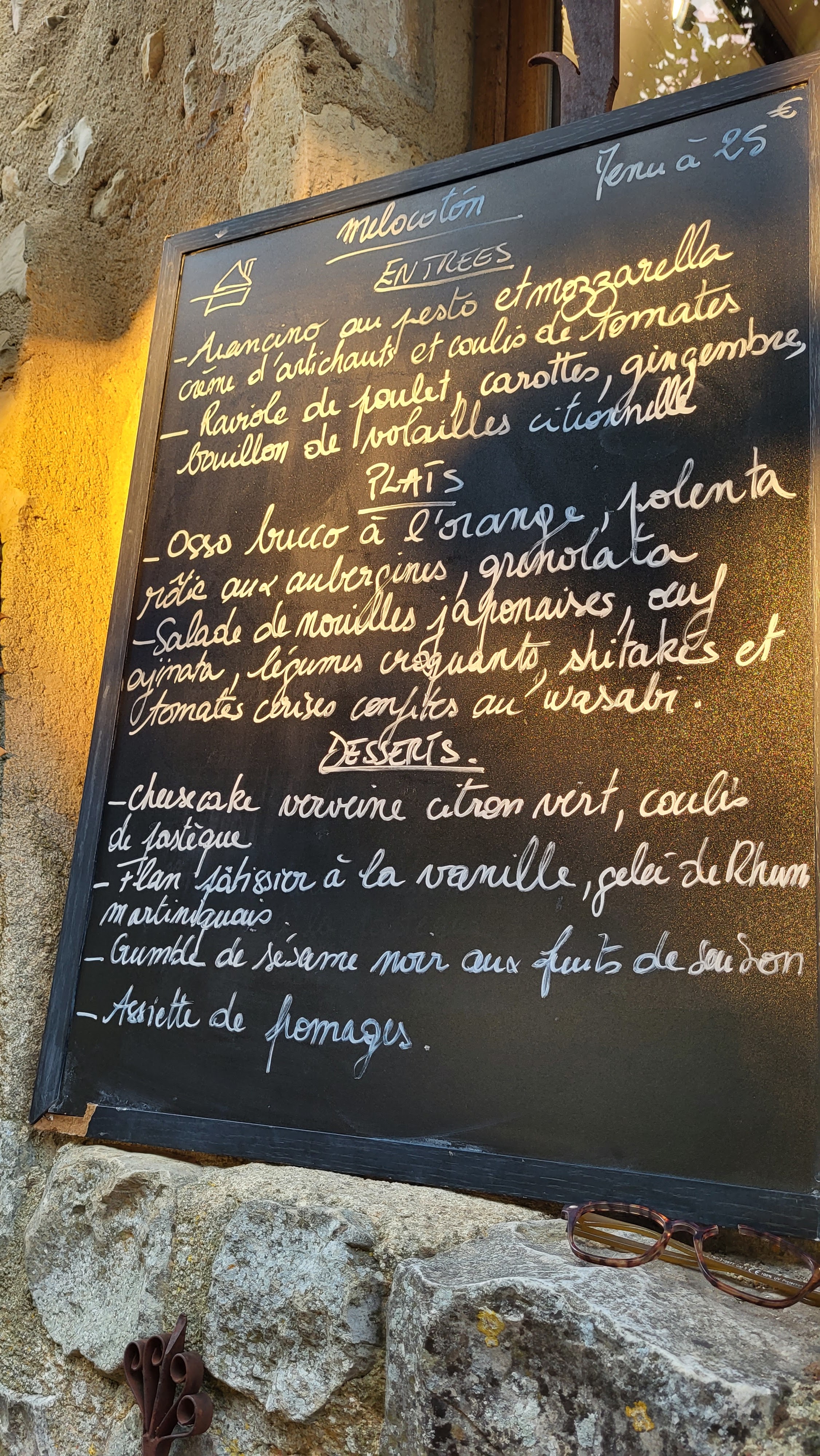 Lire le menu sur un tableau noir. Quels plats délicieux. Trois plats avec du vin. Pour les enfants, des frites avec une mayonnaise spécialement préparée. Terminé avec un smoothie et un gâteau. A côté d'un terrain de pétanque. Il suffit de chercher dans le village.
