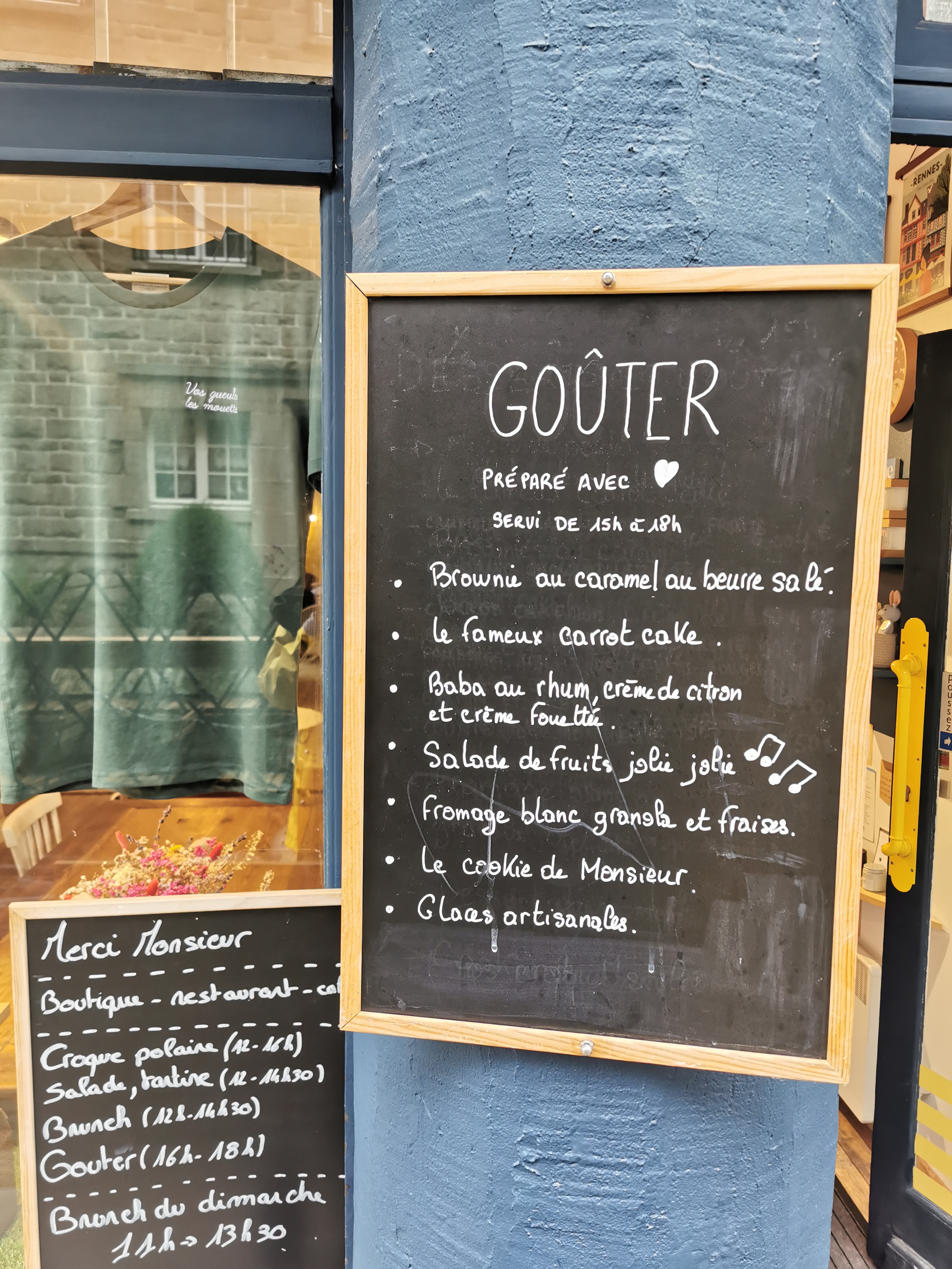 aujourd'hui, sortie chez Merci monsieur à Dinard pour le goûter. Très mauvais accueil, personnel mal aimable. chocolat chaud à peine tiède, le thé vert à la menthe n est autre qu une tasse d eau chaude avec 3 pauvres feuilles de menthe. Si vous souhaitez passer un bon moment, je vous déconseille cet endroit.