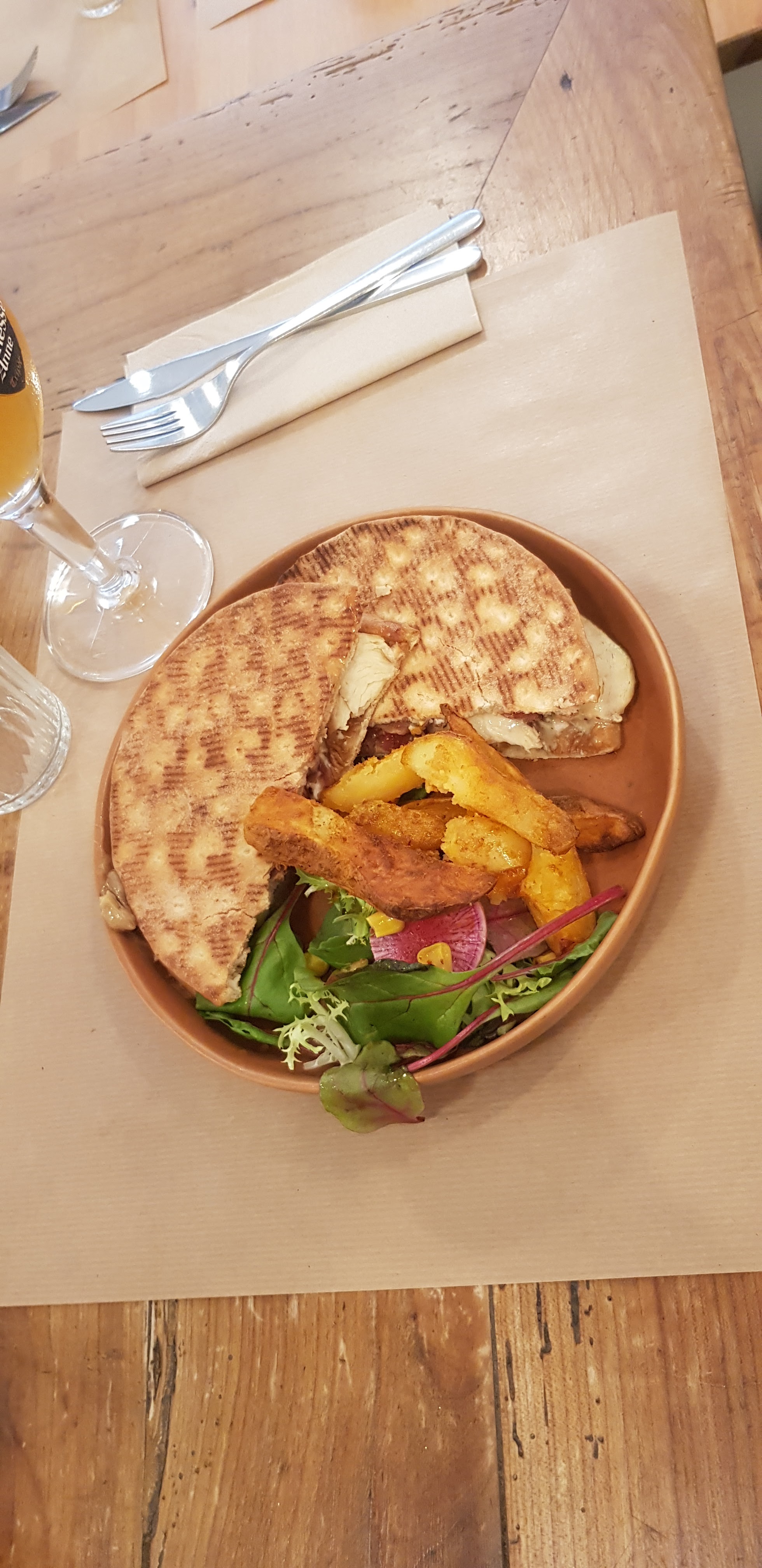 Nous nous sommes arrêtés pour déjeuner tardivement vers 15h, vu l'heure ils ne servaient plus toute la carte mais que les croques monsieur polaires (et les desserts) - ce qui n'est pas très grave en soi. Malheureusement les croq étaient vraiment très très secs, le pain polaire toasté n'avait aucun moelleux et était juste très dur, donc malgré la garniture correcte (sans originalité particulière mais décente), on avait juste extremement soif, il n'y avait pas de liant dans les croq, alors que quand on pense à un croque monsieur on veut quelque chose de gourmand, moelleux et agréable à manger. Aucune petite sauce en accompagnement proposée pour aller avec les patates. Heureusement qu'il y avait les quelques feuilles de salade ! La vinaigrette était très bonne. Le brownie au chocolat était lui aussi très sec, donc sûrement pas fait maison, il avait le même goût que les brownies industriels achetés en grande surface, et la chantilly avait un goût très industriel aussi, presque que de l'air et aucune gourmandise, plutôt décevant globalement. Le cidre IPA était par contre très bon