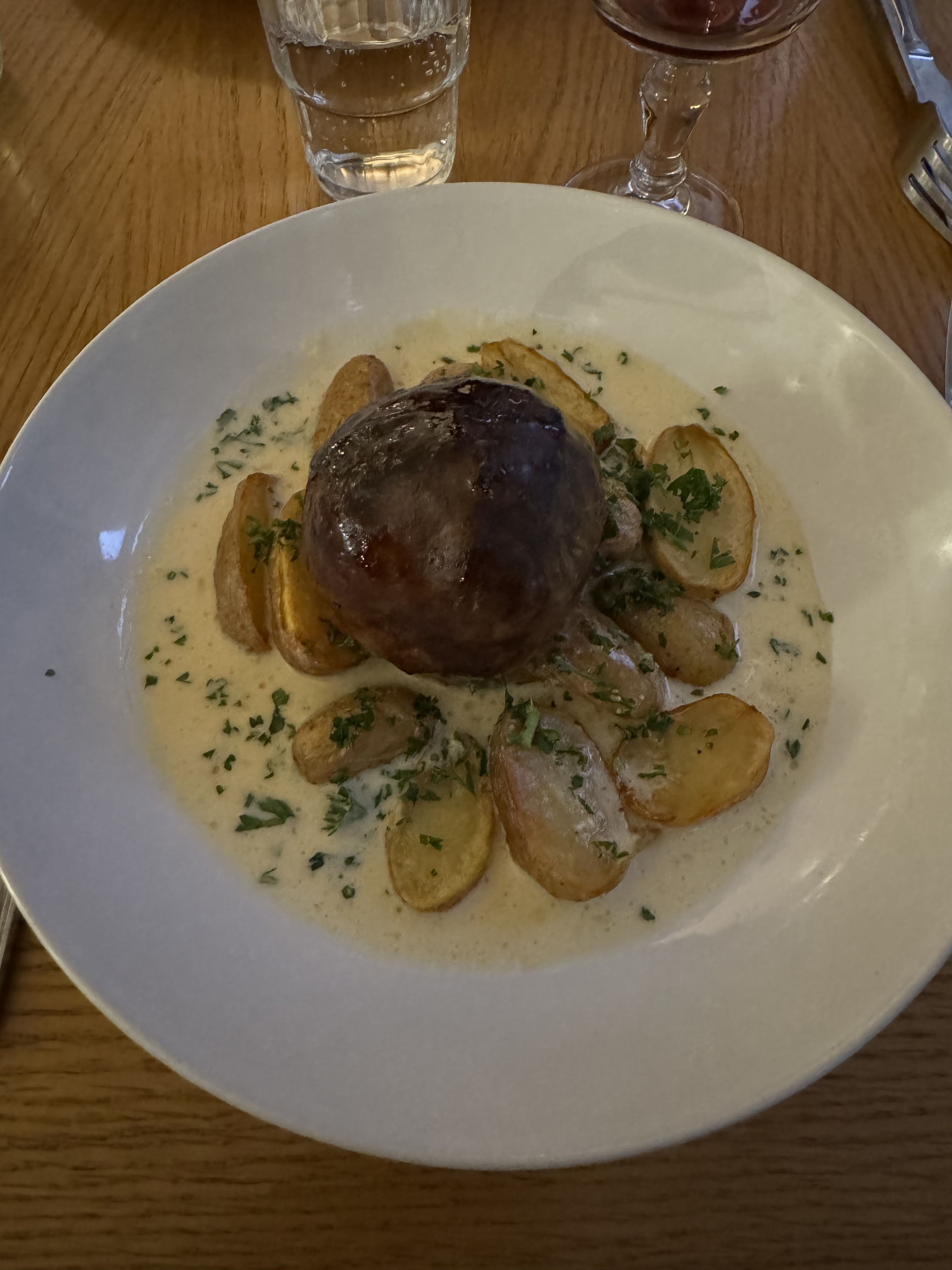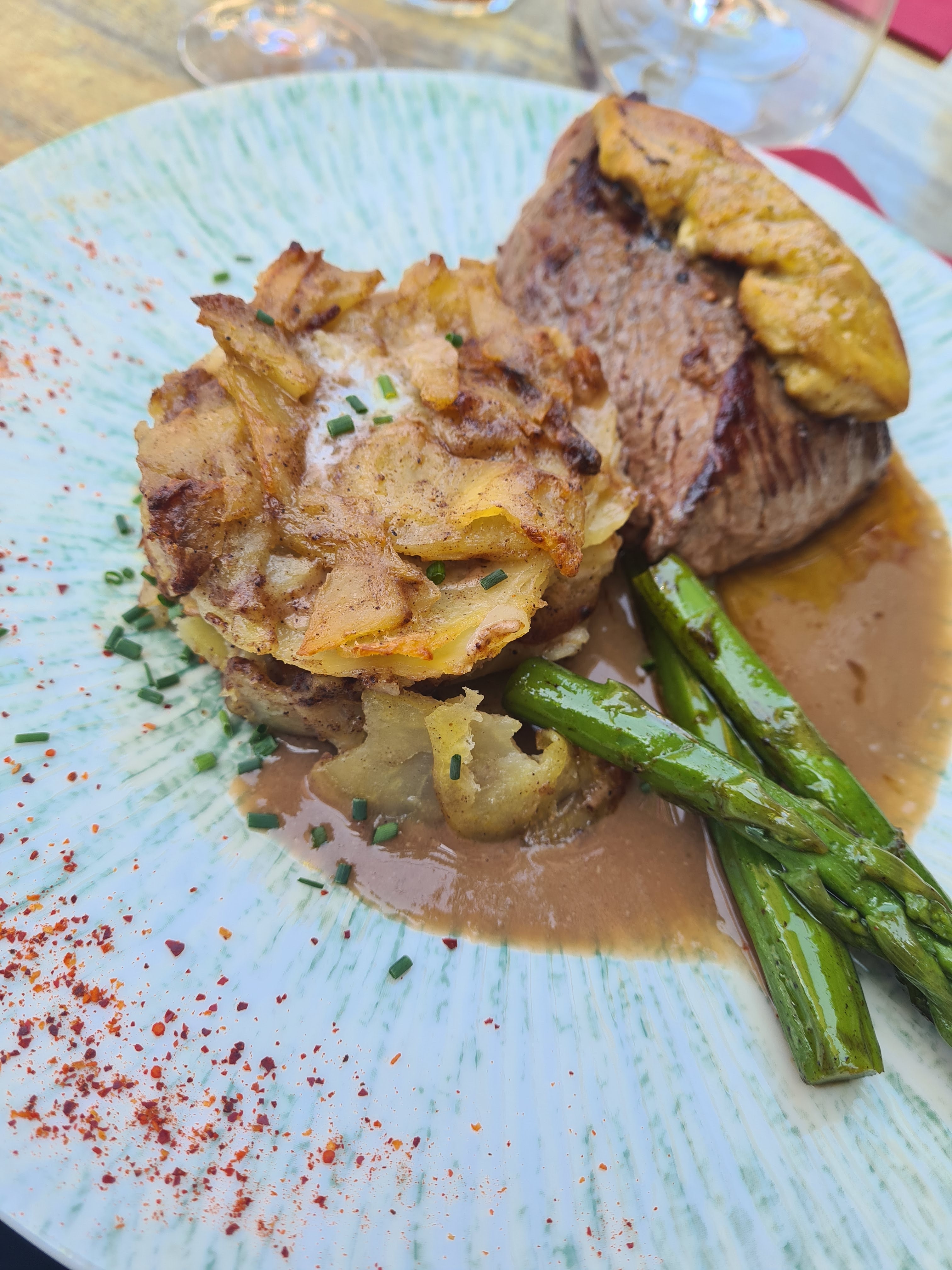 Déjeuner parfait, le cadre est superbe! La carte simple mais suffisante, c'est fait maison et ça ce vois. j'ai goûter le pavé salers sauce foie gras, bien servis et goûteux et le crumble abricot en dessert, au top! C'est plus judicieux de réserver c'est très touristique quand-même mais le patron est arrangeant et avec un peu de patience vous trouvera une place...